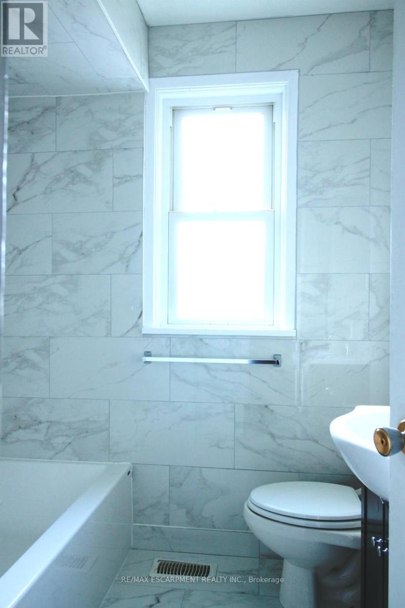 Impressive renovated 3 bedroom main floor unit just minutes to highway access, Juravinski Centre, public transit, schools and parks. Newly renovated kitchen with quartz counter tops and ceramic backsplash and porcelain tile floors. Hardwood flooring on main floor. Updated main bath with all new ceramics. Newly installed stackable laundry in the unit. Separate side entrance to lower level. Driveway parking for tenants. Main floor tenant to pay for 50% of utilities and has use of backyard. (id:64974)