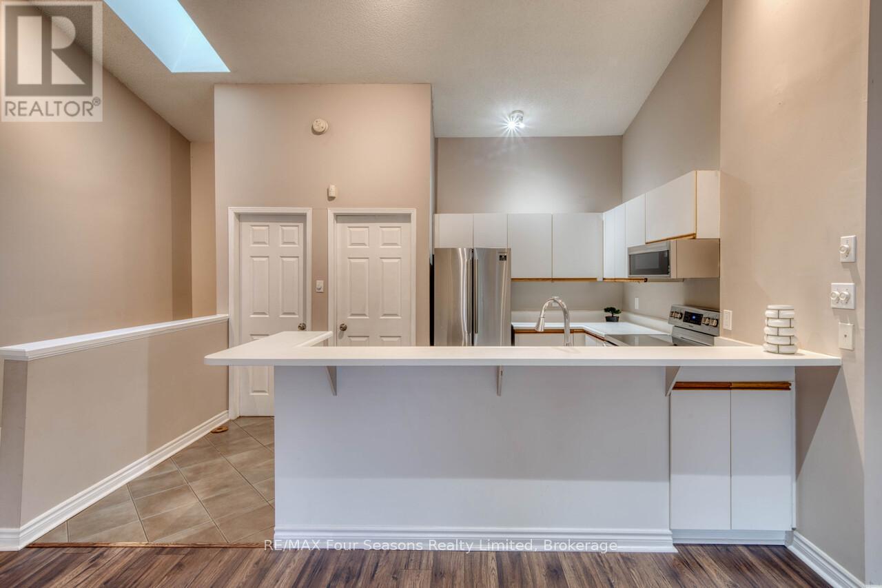 Harbourside IV spacious END UNIT townhome approx. 1500 sq feet with 3 bedrooms and 2.5 bathrooms. Fantastic location in the west end of Collingwood only a 10 minute drive to the ski hills, a 5 minute drive to The Historic downtown Collingwood and a few minutes walk to the trail system. Enter the townhome from the ground level which offers the primary bedroom with 3 piece ensuite and sliders to the back patio deck. A further large bedroom plus 4 piece bathroom as well as laundry on this level. The upper level boasts an open plan living room with gas fireplace, dining area, kitchen and further bedroom. Soaring cathedral ceilings and engineered laminate flooring make this a light bright space. Sliding doors off the living room lead to a large deck for your outdoor entertainment. The kitchen features an island bar, fridge and stove replaced 5 years ago, stainless steel dishwasher and microwave are new. Newer furnace and ON Demand Hot Water heating as well as central air.This condo has been virtually staged. (id:64974)