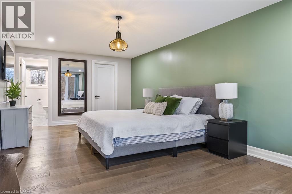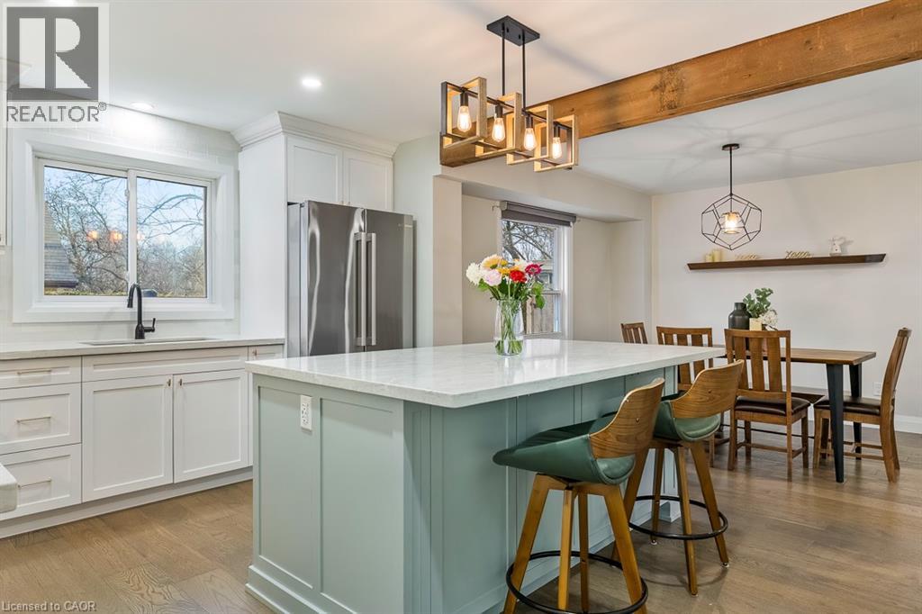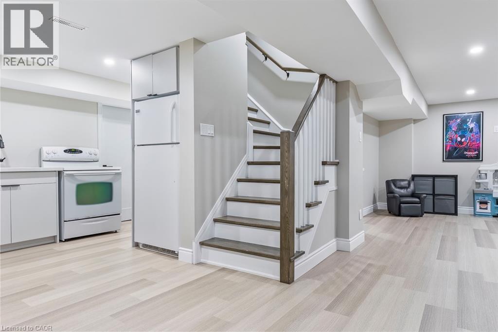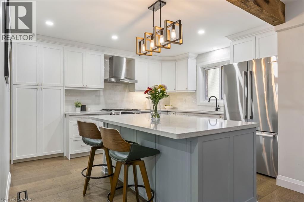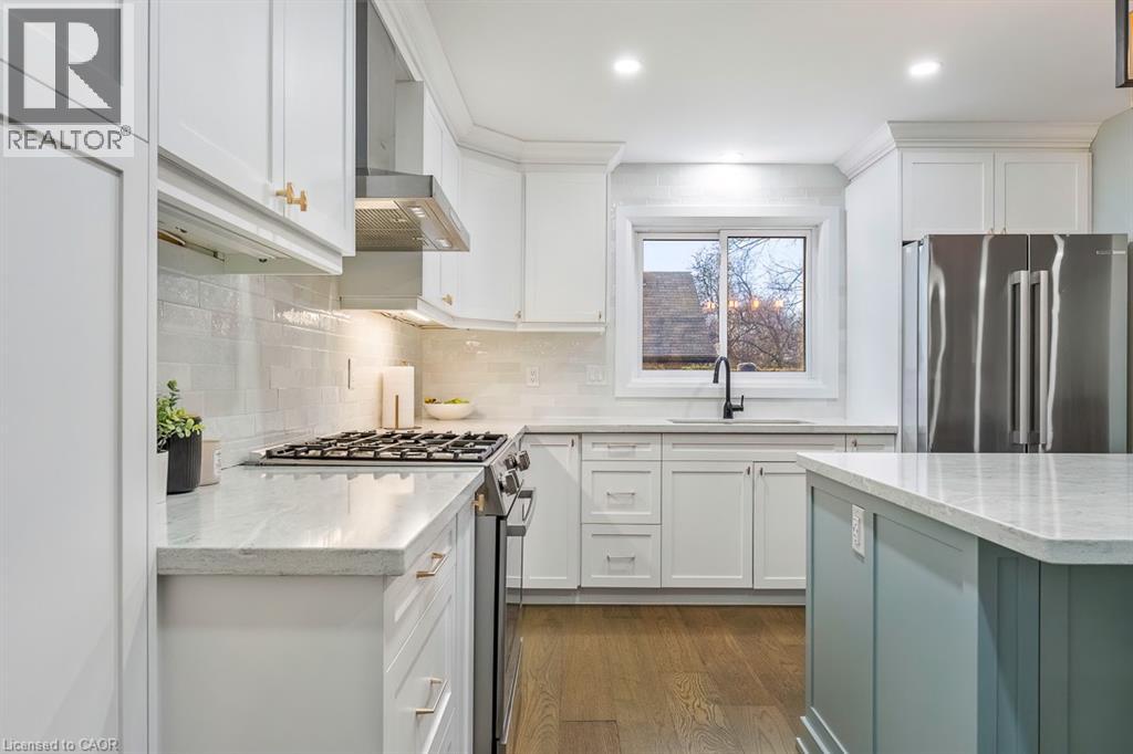 Welcome to this beautifully renovated 4+1-bedroom, 3.5-bathroom home, thoughtfully updated from top to bottom by a professional contractor. Tucked away on a quiet cul-de-sac in one of Dundas’ most sought-after neighbourhoods, this exceptional property blends modern design with everyday functionality, making it ideal for families and multi-generational living. The main and upper levels feature stunning hardwood flooring throughout, complemented by brand new wood stairs that add warmth and elegance. The heart of the home is the fully renovated kitchen, designed with both style and practicality in mind. Enjoy Quartz countertops, soft-close cabinetry and drawers, and an impressive suite of Bosch appliances including fridge, gas stove, drawer microwave, dishwasher, and range hood. A gas line for the stove and an additional gas line for the backyard BBQ provide added convenience for cooking and entertaining. The kitchen also offers abundant storage space, ensuring everything has its place. Upstairs, you’ll find spacious bedrooms, including walk-in closets that provide excellent organization and storage solutions. The versatile lower-level in-law suite offers incredible flexibility for extended family, guests, or potential income, complete with a beautifully finished bathroom featuring heated floors for added comfort. Step outside to enjoy the private backyard, highlighted by a durable concrete patio—perfect for relaxing or entertaining outdoors. Ideally located close to the hospital, top-rated schools, parks, and everyday amenities, this move-in-ready home offers the perfect balance of luxury, comfort, and convenience in a highly desirable Dundas location. (id:64974)