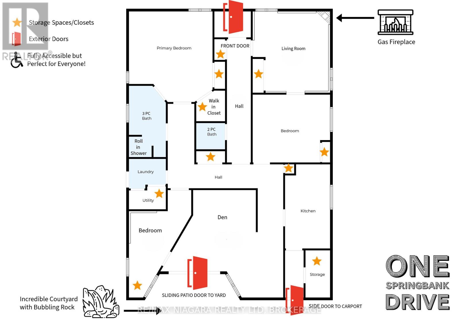 Welcome to 1 Springbank Drive! A truly exceptional residence in one of St. Catharines' most desirable neighbourhoods. Tucked into the quiet and popular Ridley district, this home offers the perfect blend of tranquility and convenience. Families love the quiet, tree lined streets, while commuters appreciate the quick access to shopping, amenities, and nearby 406 on ramps. Custom built in 1989 and lovingly maintained by its original owners, this one of a kind property offers over 2,000 sq. ft. of thoughtfully designed living space. The entire home is fully wheelchair accessible, featuring extra wide and double doors throughout and all essential living spaces including laundry and bedrooms on one level for effortless everyday comfort. Natural light pours into every corner of the home thanks to an incredible 14 skylights, creating a bright, uplifting atmosphere. The welcoming foyer has an art gallery feel, beside a cozy living room complete with a gas fireplace. The spacious primary bedroom offers ensuite privilege, his and hers closets and one is a walk in for exceptional storage. The sun filled kitchen is a standout, featuring stone countertops and high end appliances including a range and separate oven. Heating options include both forced air furnace and in floor radiant heating thoughout for year round comfort. A main floor den with an oversized patio door provides a stunnign view and seamless connection to the outdoors. The backyard is the jewel of this property. Beautifully landscaped, low maintenance oasis featuring lush dogwoods, a tranquil babbling rock, and a charming patio perfect for summer evenings, morning coffee, or hosting unforgettable gatherings. With no grass to mow and easy care gardens, you can spend more time enjoying and less time maintaining. A rare opportunity to own a truly unique, light filled, and meticulously designed home in a coveted location. Features include: Roof 2014, AC 2017, R/O water system, 200 AMP service on breakers. (id:64974)