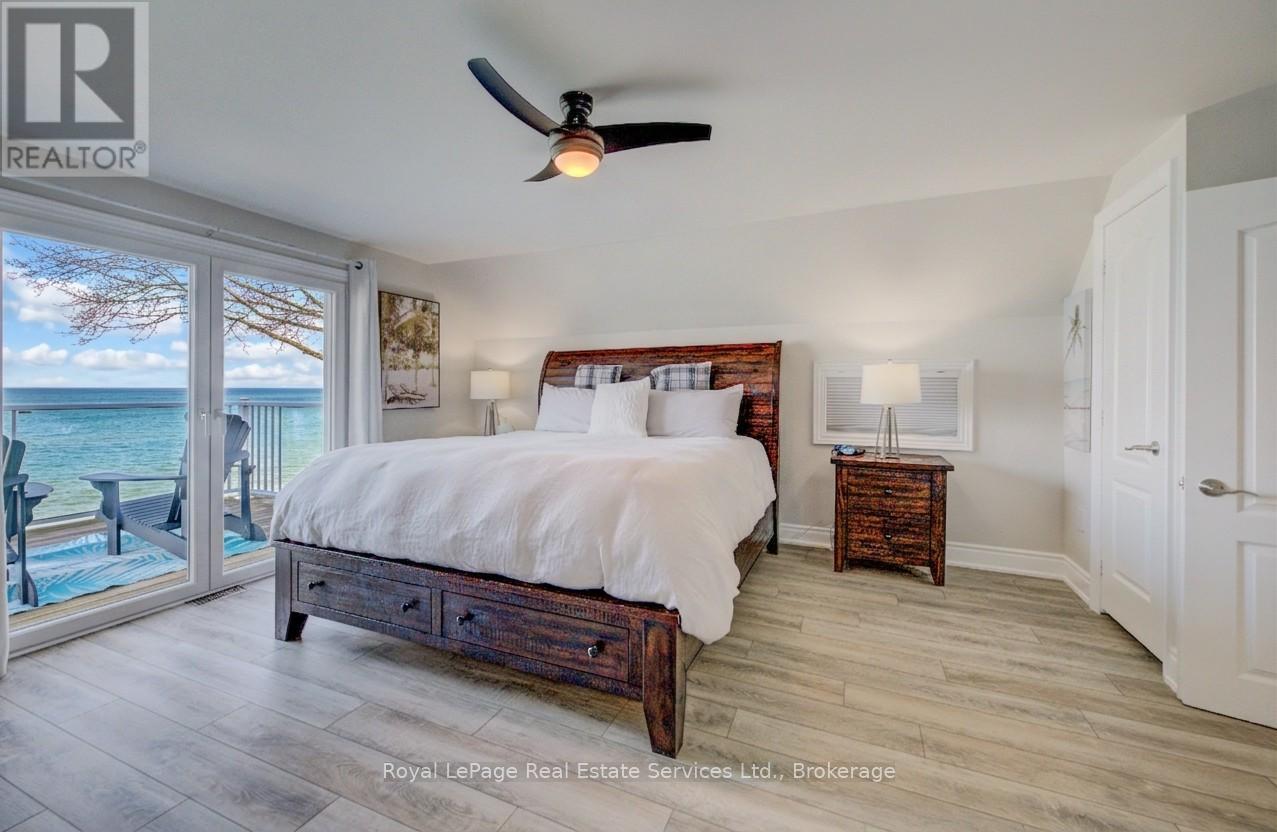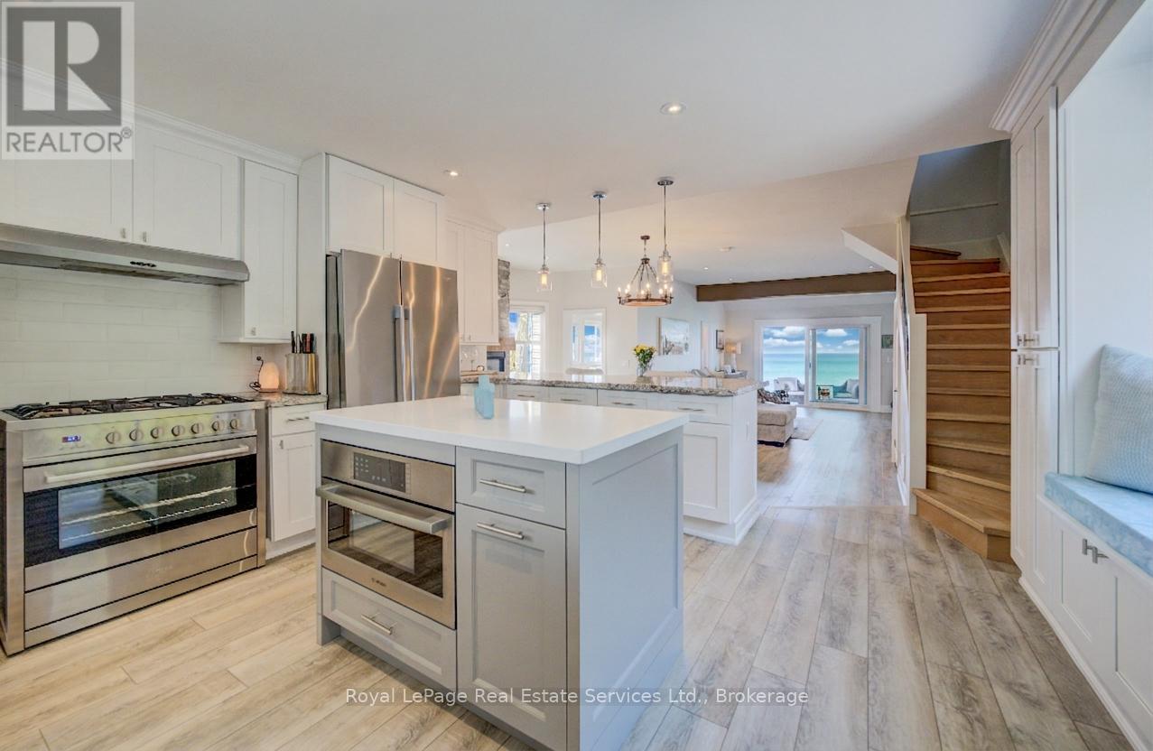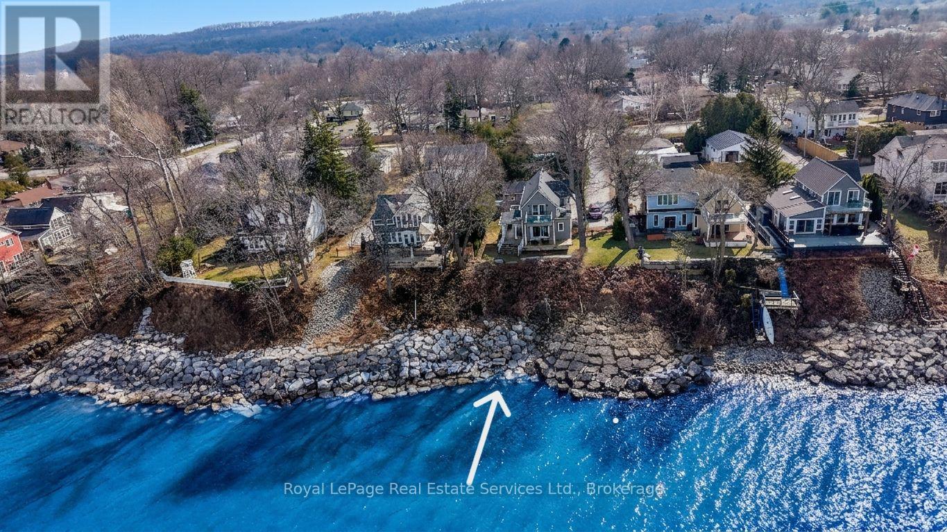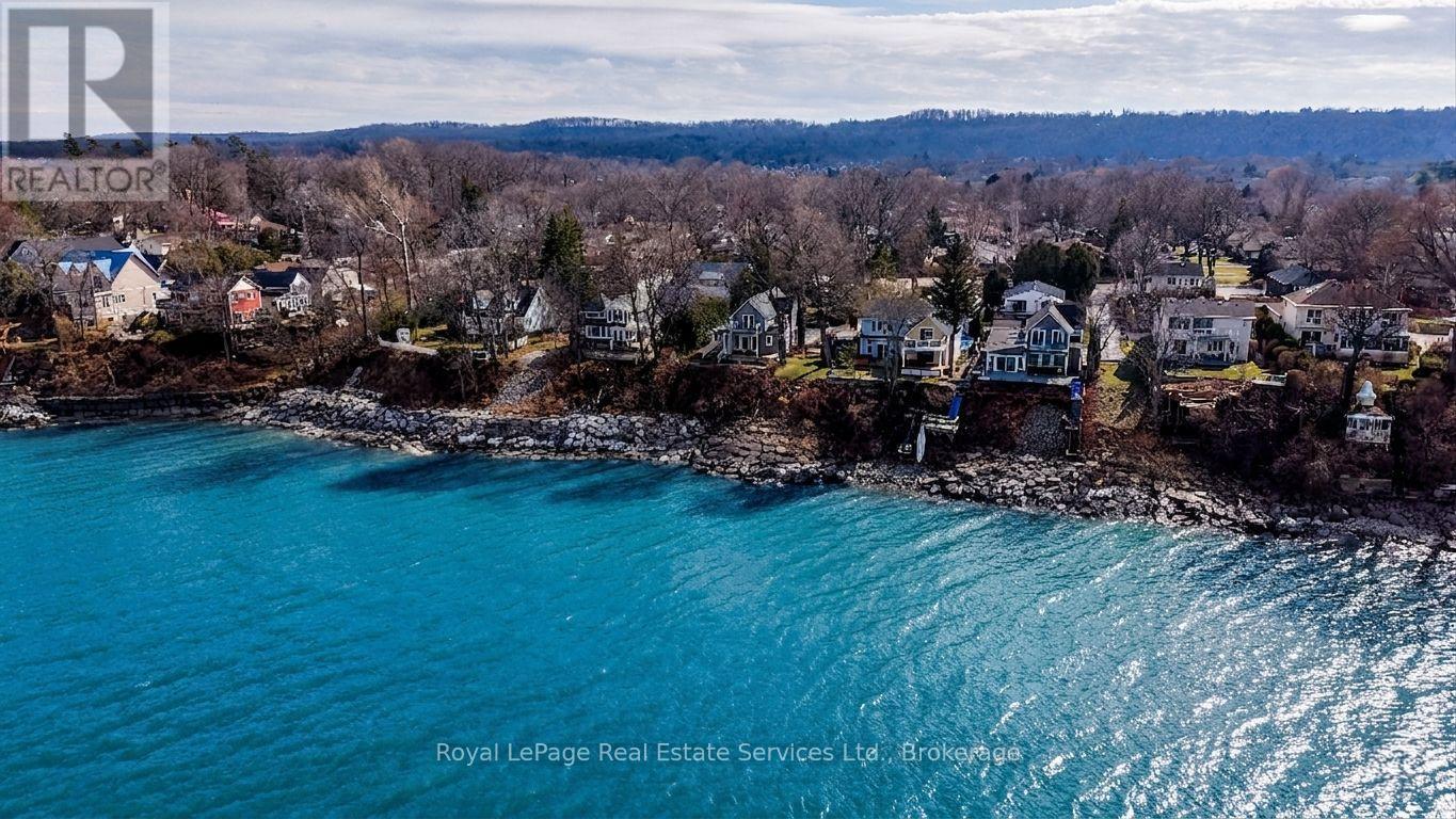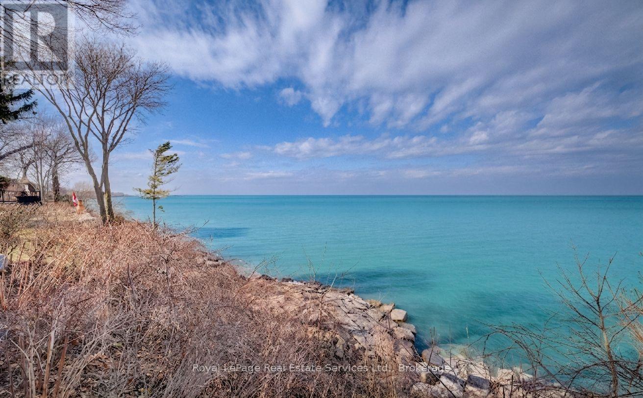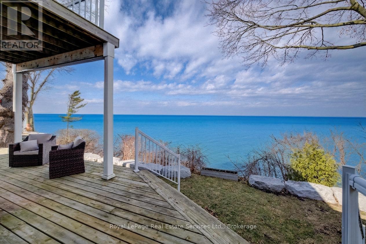 Exquisite Grimsby Sundrenched Lakefront Retreat: Where Luxury Meets the Water's Edge. Welcome to a truly rare offering on the shores of Lake Ontario. This magnificent refreshed, updated three-bedroom lakefront home in the heart of Grimsby is a masterclass in coastal-inspired luxury...meticulously designed to offer panoramic water views from nearly every vantage point. A serene sanctuary/entertainer's paradise provides unmatched tranquility and sophistication. MAIN LEVEL is Bright, airy, open-concept w gourmet chef's kitchen featuring high-end SS appliances, electric blinds, tall pantry, a professional-grade gas stove, granite tops T/O, island w storage and peninsula eating area and window. The adjacent dining room featuring a majestic gas stone fireplace and flows effortlessly into the living area w BONUS large understairs storage room. Main floor also offers new flooring throughout, blinds, new oak stairs, an updated full three-piece bathroom, and a spacious laundry room plus XL patio doors to rear lounge and side door to BBQ/eating area. UPPER LEVEL features 3 good sized bedrooms. Primary retreat serves as a true escape, complete with direct access to a private upper deck with new 'tilt and open' patio doors w retractable screen. Two additional bedrooms provide ample space for guests or a home office. Full four-piece bathroom completes. The exterior is defined by its signature wraparound porch and deck, offering multiple zones for alfresco dining or simply soaking in the unobstructed views of CN Tower on a clear day.Rear yard w steps down to your private beach. Oversized 2 car garage w side door entry and industrial shelving/open rafters for storage. 3 car cement drive plus street parking. Instant hot water, exterior outlets and gas line and cute garden shed. Located just minutes from the QEW, vibrant shops and dining. Grimsby-on-the-Lake is the gateway to Niagara's wine country.Easy commute to Hamilton and the GTA. Great Neighbors/community! Long close available. (id:64974)