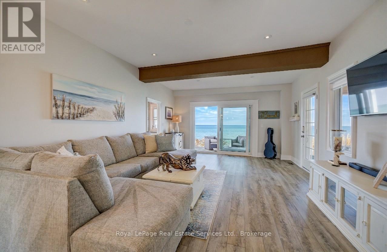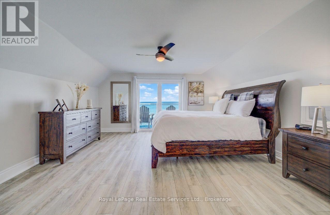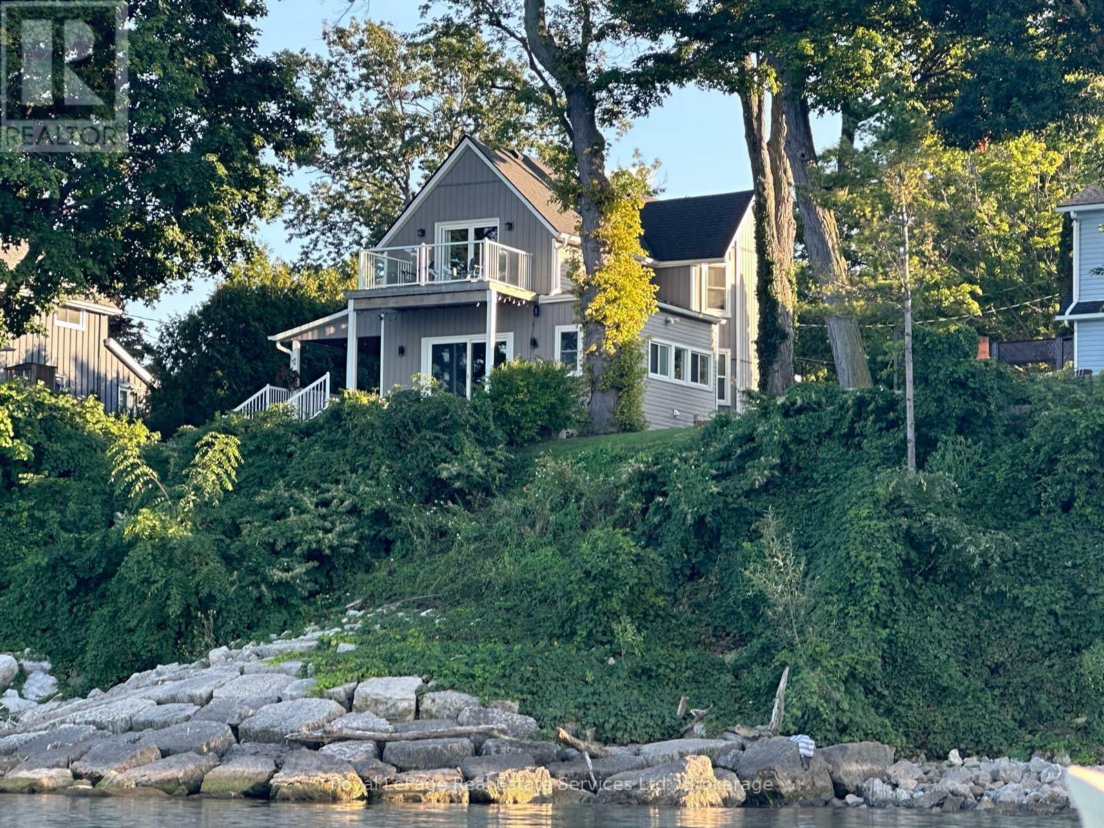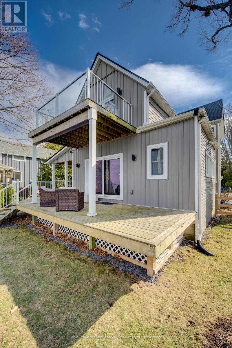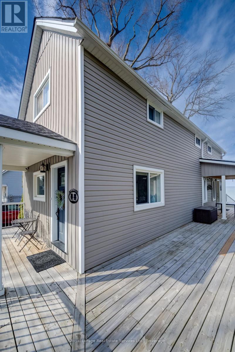 Exquisite Grimsby Sundrenched Lakefront Retreat: Where Luxury Meets the Water's Edge. Welcome to a truly rare offering on the shores of Lake Ontario. This magnificent refreshed, updated three-bedroom lakefront home in the heart of Grimsby is a masterclass in coastal-inspired luxury...meticulously designed to offer panoramic water views from nearly every vantage point. A serene sanctuary/entertainer's paradise provides unmatched tranquility and sophistication. MAIN LEVEL is Bright, airy, open-concept w gourmet chef's kitchen featuring high-end SS appliances, electric blinds, tall pantry, a professional-grade gas stove, granite tops T/O, island w storage and peninsula eating area and window. The adjacent dining room featuring a majestic gas stone fireplace and flows effortlessly into the living area w BONUS large understairs storage room. Main floor also offers new flooring throughout, blinds, new oak stairs, an updated full three-piece bathroom, and a spacious laundry room plus XL patio doors to rear lounge and side door to BBQ/eating area. UPPER LEVEL features 3 good sized bedrooms. Primary retreat serves as a true escape, complete with direct access to a private upper deck with new 'tilt and open' patio doors w retractable screen. Two additional bedrooms provide ample space for guests or a home office. Full four-piece bathroom completes. The exterior is defined by its signature wraparound porch and deck, offering multiple zones for alfresco dining or simply soaking in the unobstructed views of CN Tower on a clear day.Rear yard w steps down to your private beach. Oversized 2 car garage w side door entry and industrial shelving/open rafters for storage. 3 car cement drive plus street parking. Instant hot water, exterior outlets and gas line and cute garden shed. Located just minutes from the QEW, vibrant shops and dining. Grimsby-on-the-Lake is the gateway to Niagara's wine country.Easy commute to Hamilton and the GTA. Great Neighbors/community! Long close available. (id:64974)