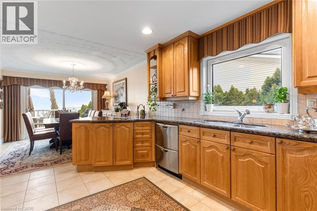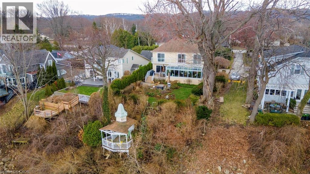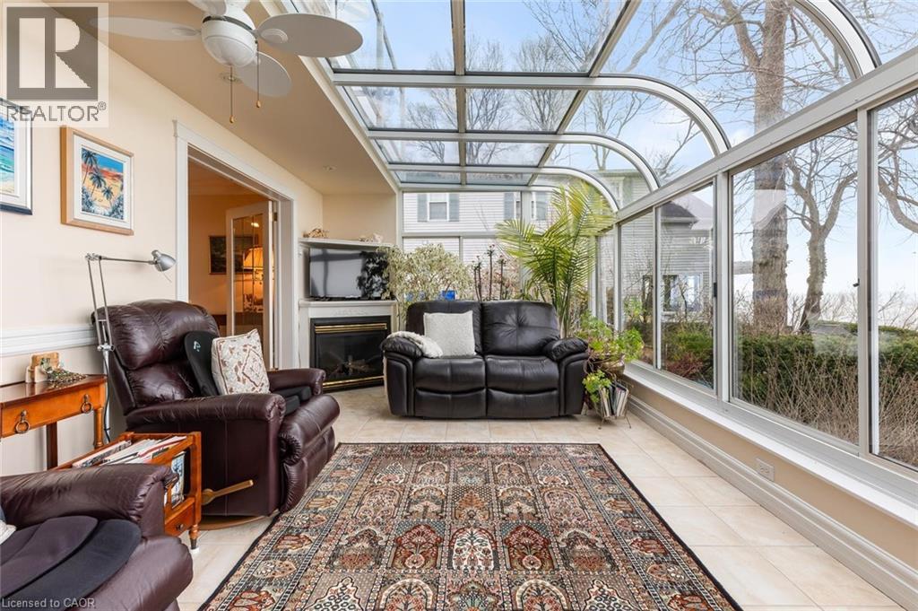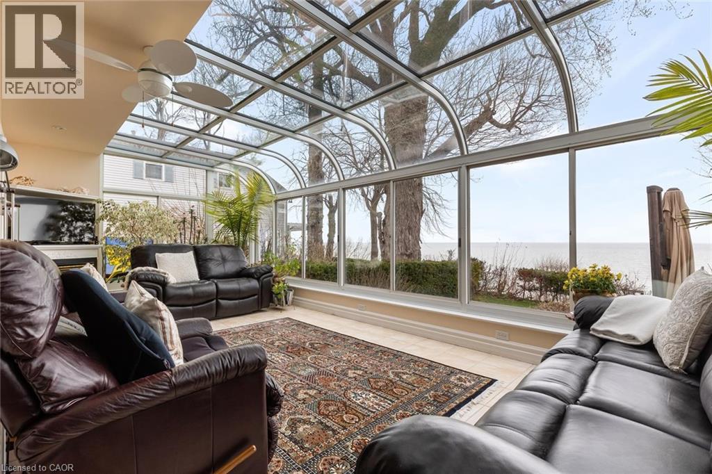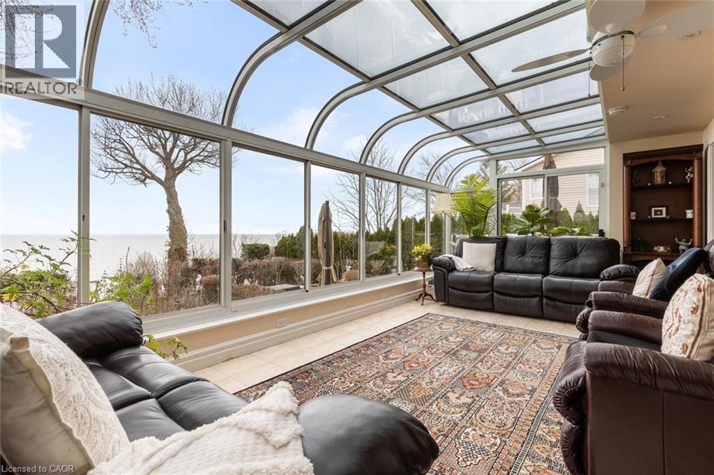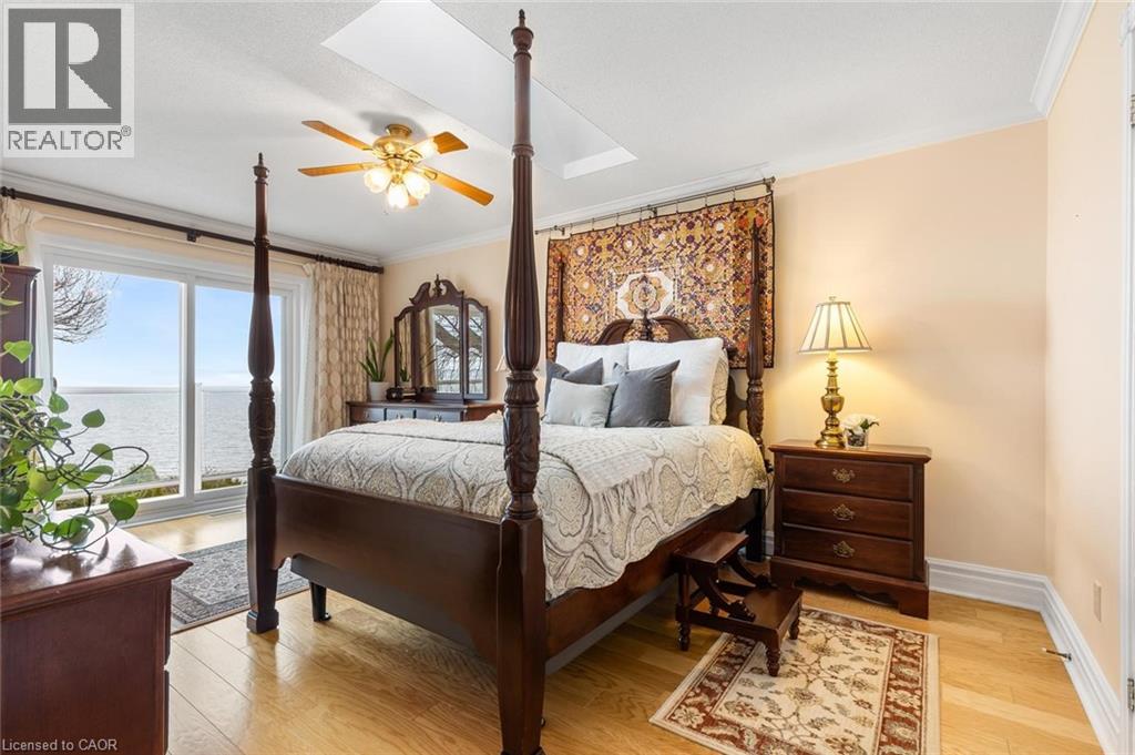 Exceptional waterfront 3 +1 bedroom and 3.5 bathrooms detached home in Grimsby, offering a grand double door entry and an impressive foyer with soaring high ceilings. This well-appointed home features a beautiful wood staircase and a spacious layout designed for both comfortable living and entertaining. The bright living room showcases rich hardwood flooring and a charming wood-burning fireplace, while the inviting family room seamlessly opens to a stunning and expansive sunroom complete with a gas fireplace—perfect for relaxing and enjoying natural light year-round. The well-equipped kitchen features tile flooring, stainless steel appliances, a built-in wine rack, garburator, and abundant cabinetry and counter space. A separate dining area is ideal for hosting guests, while the breakfast area provides the perfect setting for morning coffee or tea. Main floor laundry adds everyday convenience. The upper level offers three generously sized bedrooms, 2 full bathrooms, and access to a charming balcony. The primary bedroom retreat includes a walk-in closet and a private ensuite with a tub and jacuzzi. The finished basement provides additional living space with a large recreation room featuring a gas fireplace, a dedicated office for working from home, an additional bedroom, a full bathroom, and ample storage. Step outside to enjoy a large deck, garden shed, and gas BBQ hookup, ideal for outdoor entertaining. The home also features a double garage with extra ceiling height and windows for added light. Just steps to the waterfront, gazebo, and breathtaking sunsets. Close to parks, trails, schools, shopping, and easy highway access. (id:64974)