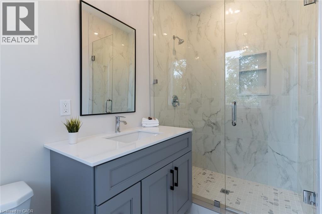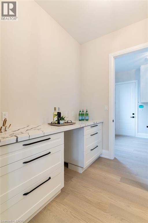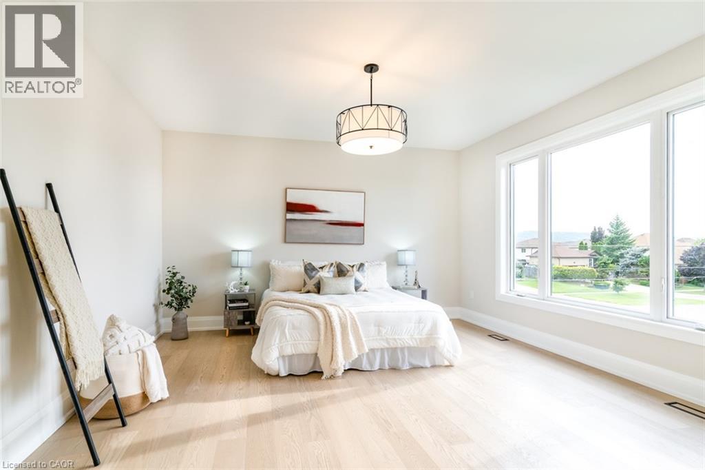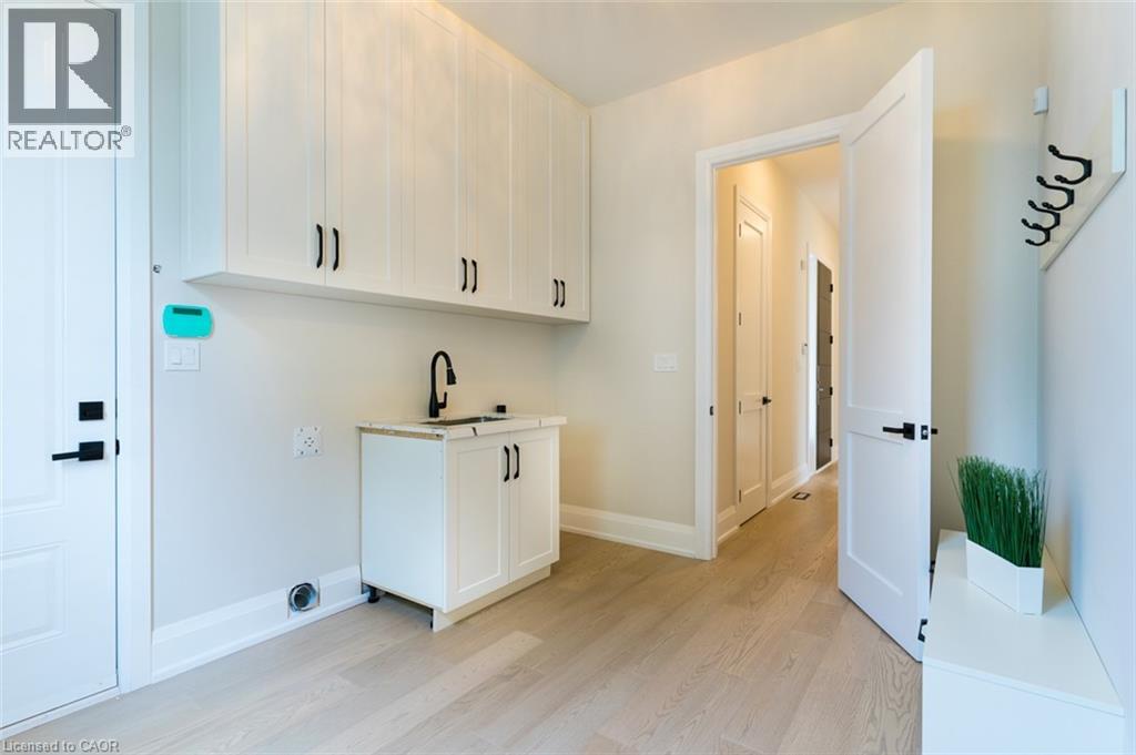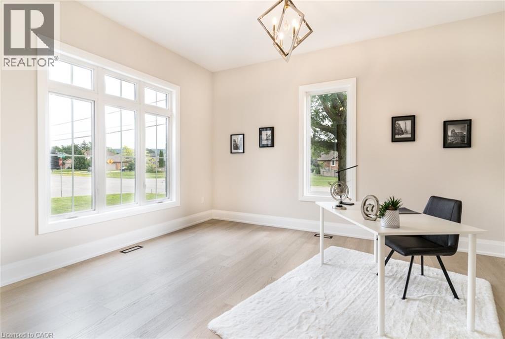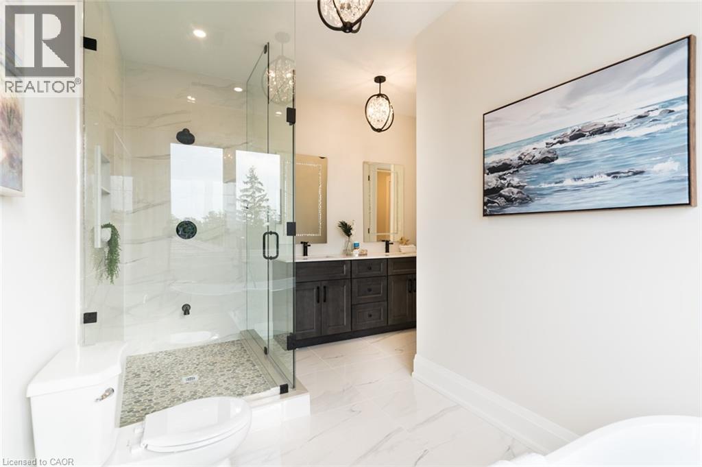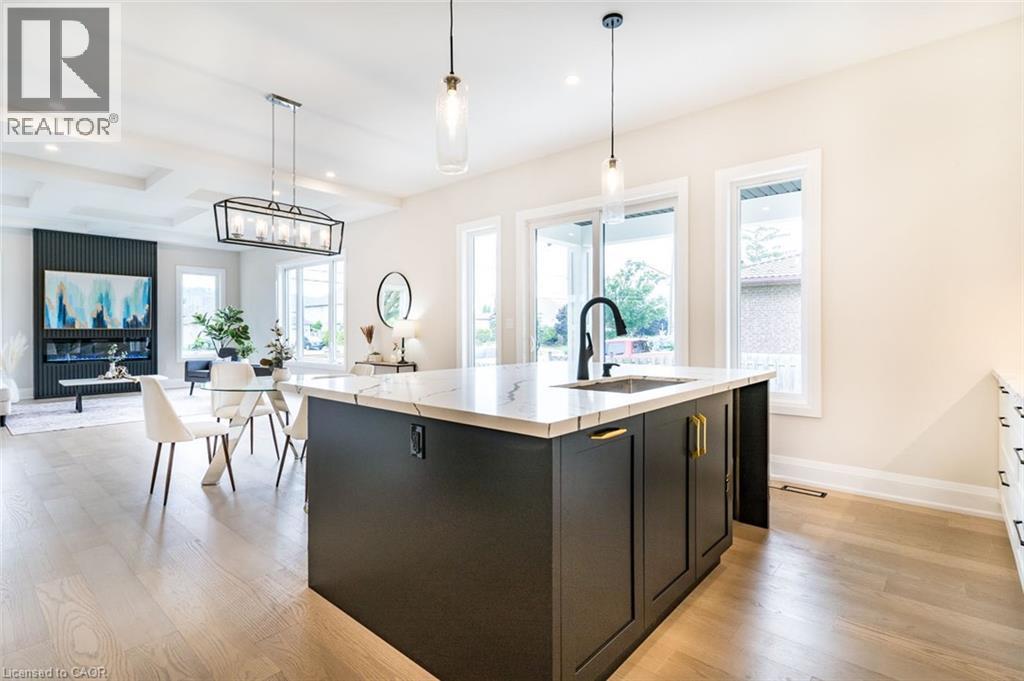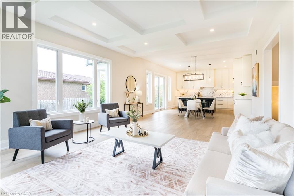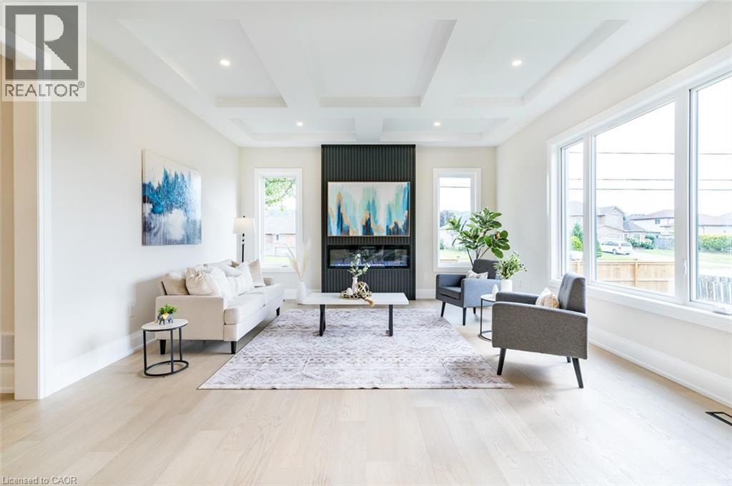 Welcome to a stunning modern 4,500 sq. ft. masterpiece where luxury and craftsmanship unite seamlessly. This custom two-story home epitomizes contemporary sophistication, offering an unparalleled living experience defined by soaring 10-foot ceilings on the main level and 9-foot ceilings upstairs. At the heart of the home is a sleek, designer kitchen featuring custom cabinetry with pull-out drawers, a dedicated servery, and an oversized walk-in pantry—a perfect blank canvas awaiting your personal choice of premium appliances. Adjacent is the expansive, open-concept living area highlighted by a striking coffered ceiling, an elegant electric fireplace, and breathtaking windows that bathe the space in natural light. The main level also features a private office behind grand 8-foot doors, offering a quiet retreat or ideal workspace. The finished basement, complete with a 2-piece bathroom and 9-foot ceilings, adds versatile space for recreation or fitness. Upstairs, the primary suite serves as a serene escape with a spacious walk-in closet and a spa-inspired 5-piece ensuite. A second bedroom features a private 3-piece ensuite, while two additional bedrooms share a well-appointed 5-piece bathroom. Step outside to a private backyard oasis with a covered patio, BBQ gas hookup, and lush landscaping. Additional high-end features include an oak staircase with iron spindles, a hardwired security system, and Wi-Fi access points on each floor. Located in a sought-after neighborhood just minutes from the QEW, a future GO station, and top-rated schools, this exceptional home offers the perfect blend of luxury and location. (id:64974)