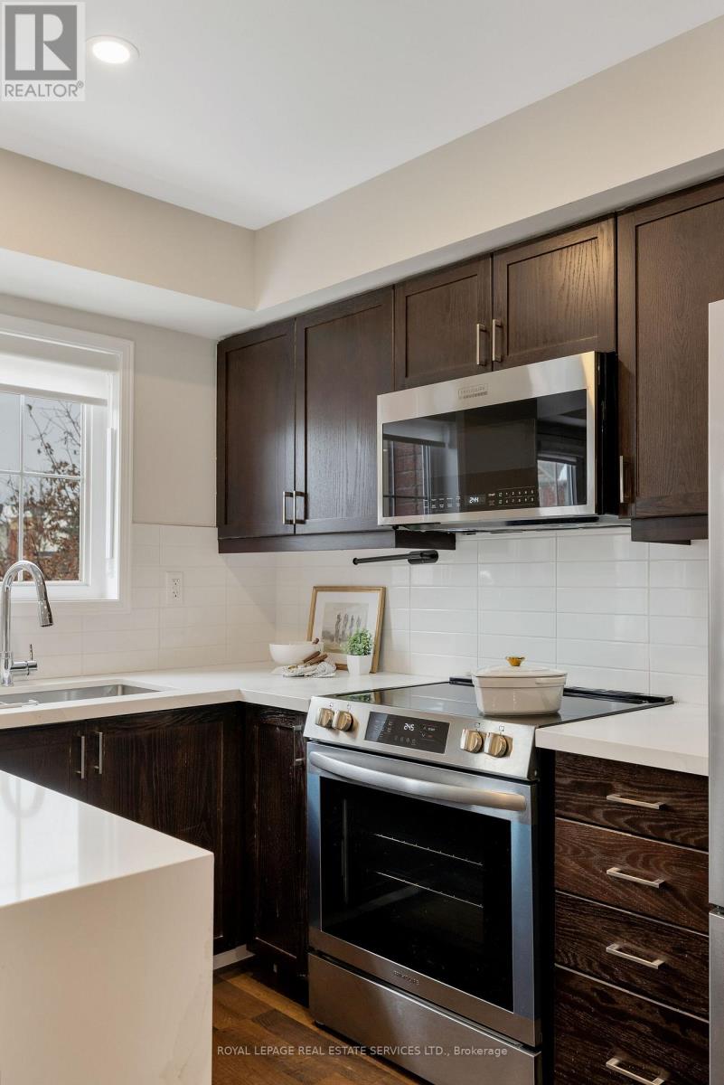 A Luxurious 2-Bedroom Fernbrook Condo awaits in Uptown Core, Oakville. Positioned in the heart of Oakvilles sought-after Uptown Core, this stunning 2-bedroom Fernbrook condominium has the perfect blend of modern elegance & urban convenience. Within walking distance to shopping, restaurants, & essential services, & just minutes from Oakville Hospital, major highways, & public transit, this prime location ensures effortless connectivity. The beautifully maintained complex grounds feature a serene central courtyard, lush gardens, & picturesque walking paths, while nearby ponds, scenic trails, & ravines invite exploration & outdoor enjoyment. Step inside this spacious & sunlit suite, where large windows flood the space with natural light, complementing the rich dark laminate flooring & designer marble-look tiles. The sophisticated oak staircase with wrought-iron pickets adds a touch of timeless elegance. The open-concept living & dining area is perfect for entertaining or unwinding after a long day, with garden doors leading to a private balcony overlooking the tranquil courtyard. The modern kitchen is a chefs delight, featuring quartz countertops, dark-stained cabinetry, pot lighting, & deluxe stainless steel appliances. Upstairs, the primary bedroom provides a peaceful retreat, sharing a beautifully appointed 4-piece bathroom with the second bedroom. A convenient upper-level laundry area adds to the homes practicality. With its stylish finishes, prime location, & inviting ambiance, this exceptional Oakville condo offers a rare opportunity to experience refined living in Uptown Core. (id:64974)