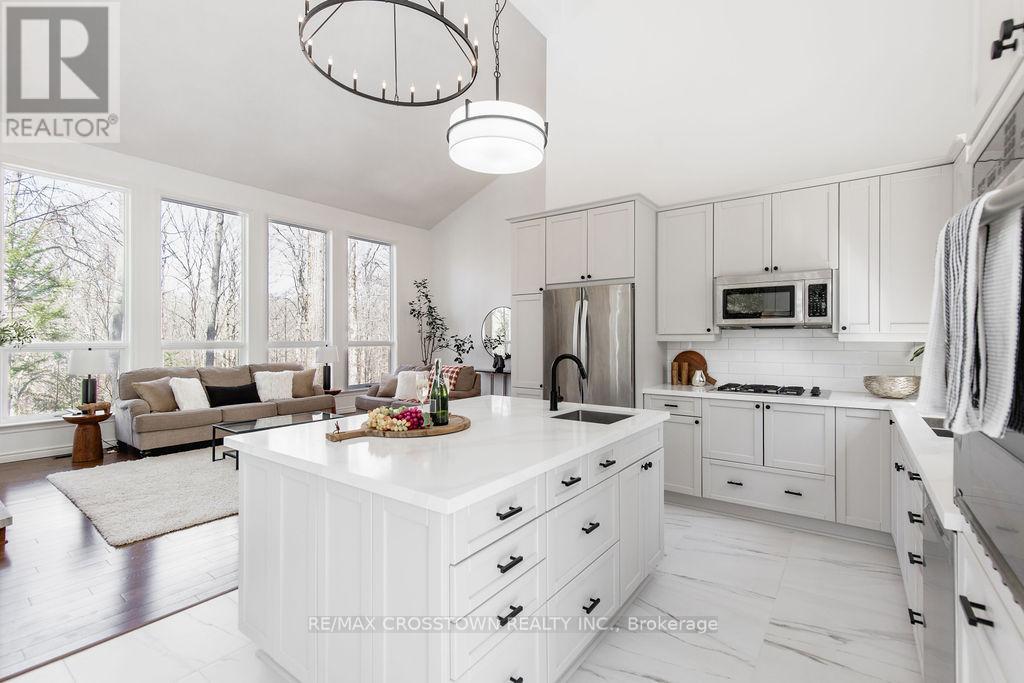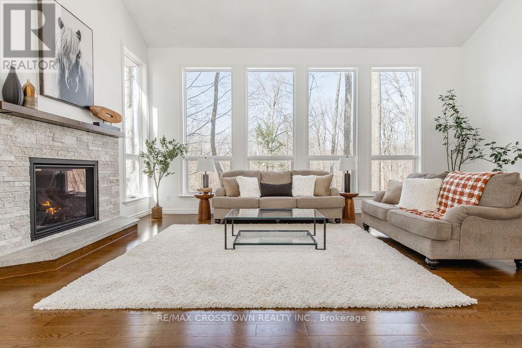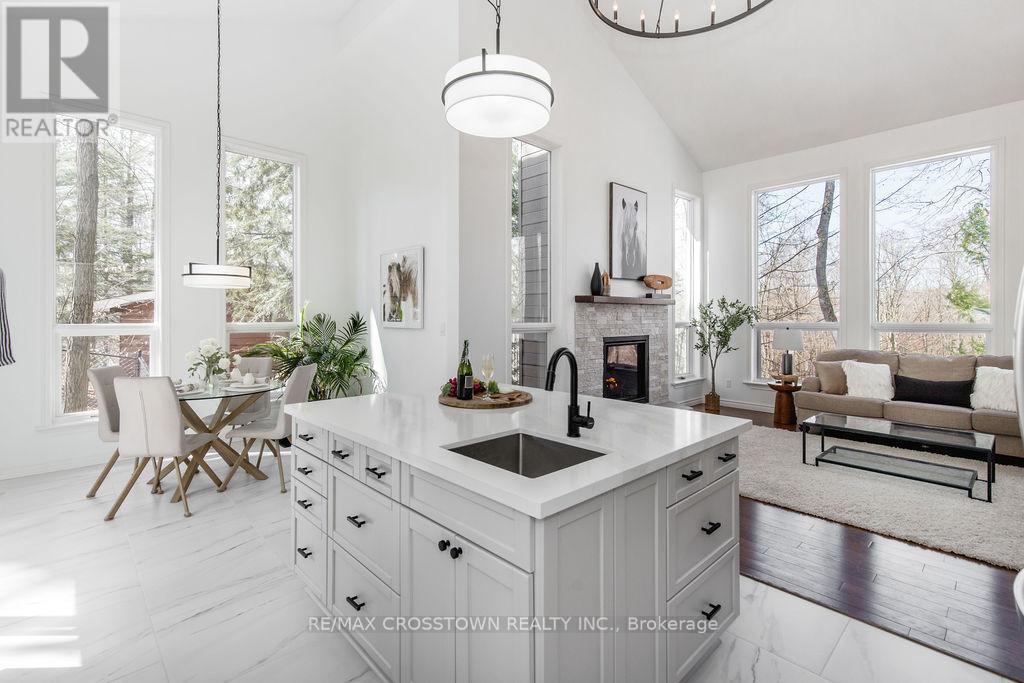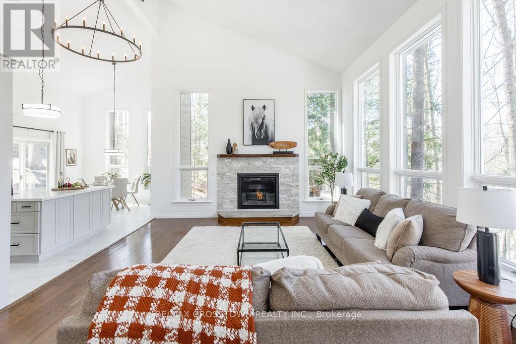 Set into the hillside in the heart of sought-after Horseshoe Valley, this beautifully updated 4-bedroom, 4-bathroom home offers over 4,300 sq ft of finished living space surrounded by nature. curb appeal galore with a long newly paved driveway, 2 car garage and composite siding. Designed to impress, the spectacular great room features soaring cathedral ceilings, rich hardwood floors, and a stunning wall of windows that brings the forest views right into your living space. The spacious, modern completely renovated eat-in kitchen is perfect for both everyday living and entertaining, while every bedroom enjoys its own walkout, seamlessly blending indoor comfort with the outdoors. Recently updated throughout, this home has been freshly painted and enhanced with all new lighting, brand new front door, and within the last 5 year new kitchen, new bathrooms, new flooring, paved driveway, new decking, new furnace, - creating a move-in-ready family home. A major highlight is the fully self-contained 730 s.f., 2-bedroom legal apartment in the lower level featuring a fireplace and 2 walkouts, perfect for multi-generational living, or income potential. The main level has the option of turning the sitting room & bedroom into separate nanny suite, with private entrance, offering incredible flexibility. Step outside to enjoy balconies, decks plus a covered 3 year old hot tub perfectly positioned to take in the peaceful, wooded surroundings. This one-of-a-kind property delivers space, style, and versatility, all the major upgrades have been done for you. located just minutes to golf, skiing, trails, spas, and the best of Horseshoe Valley living. (id:64974)