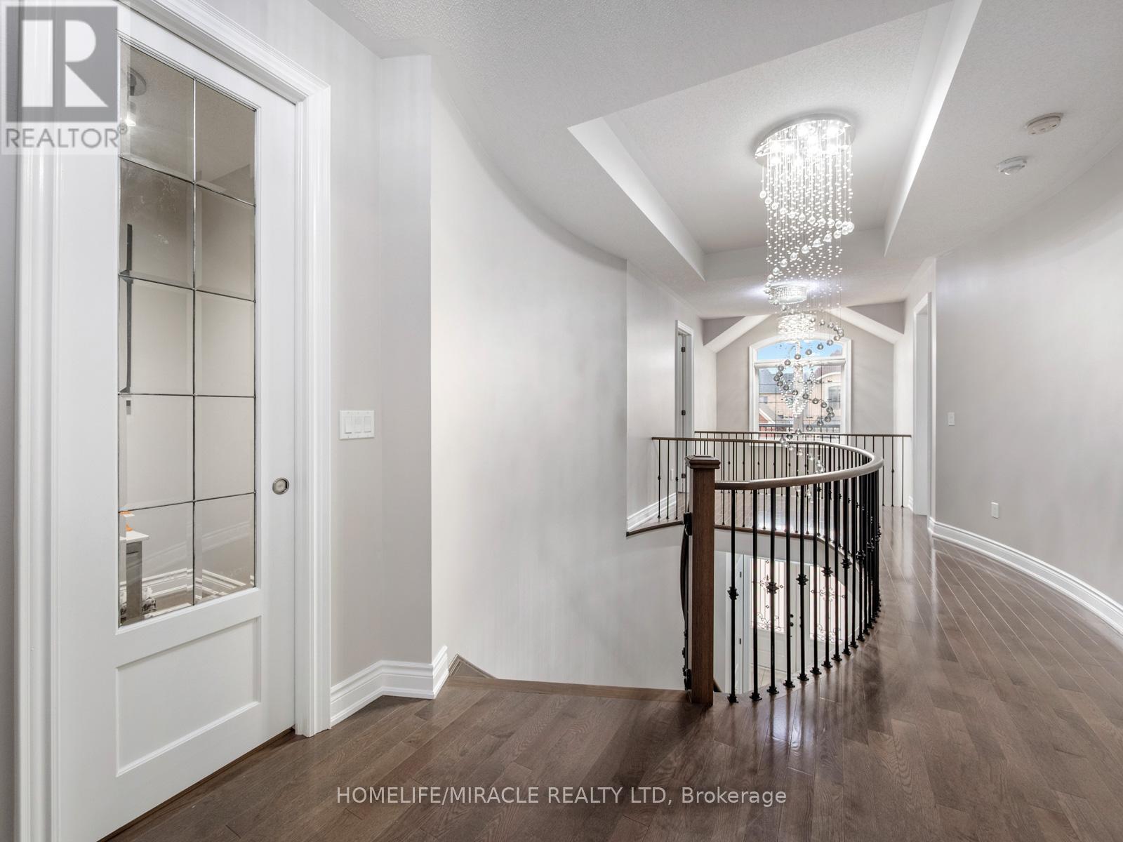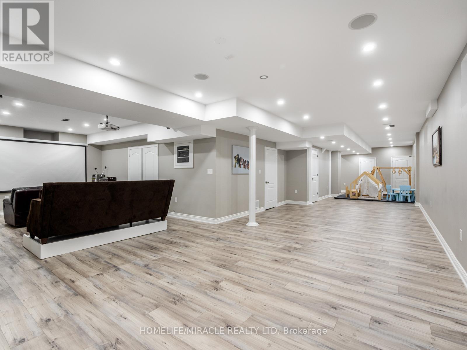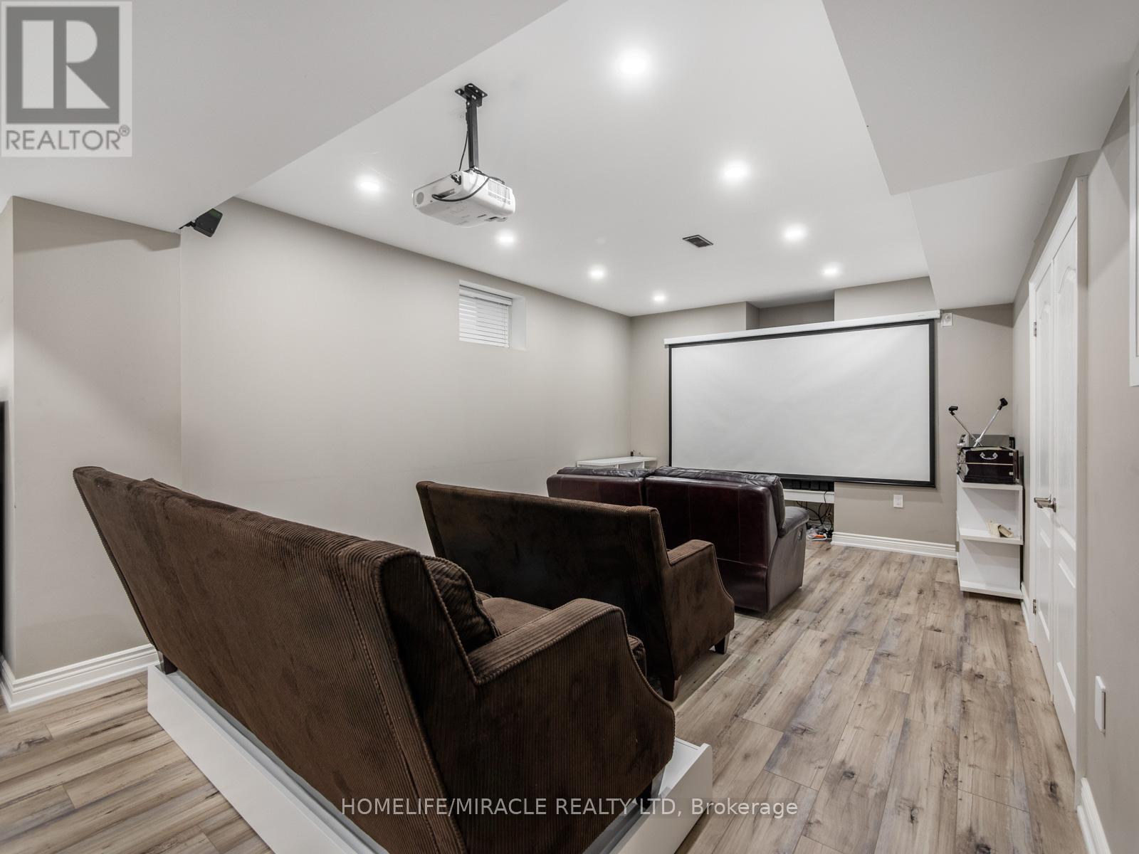Welcome to luxury living at its finest in this stunning Brampton residence, ideally situated on a quiet, family-friendly crescent and offering approximately 6,000 sq ft of beautifully finished living space designed for both elegance and functionality; this exceptional home features 4 spacious bedrooms and 5 luxurious washrooms, with hardwood flooring throughout and high-end finishes that elevate every room, while the bright, open-concept main living areas are perfect for both everyday living and entertaining; the fully finished basement is a standout, complete with a private theater room, modern kitchen, and fully equipped gym, creating the ultimate in-home lifestyle experience; outside, enjoy professionally landscaped grounds with premium interlocking in both the front and backyard, complemented by sleek glass railings that enhance the home's contemporary curb appeal; additional highlights include a 3-car tandem garage with parking for 4 more vehicles in the driveway (7 total parking spaces), a central vacuum system, and all brand-new appliances under warranty, making this a rare turnkey opportunity in one of Brampton's most desirable neighborhoods. (id:64974)