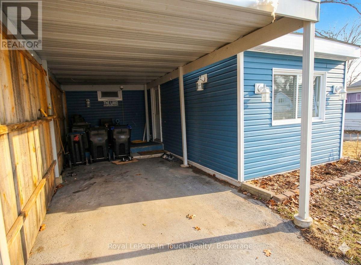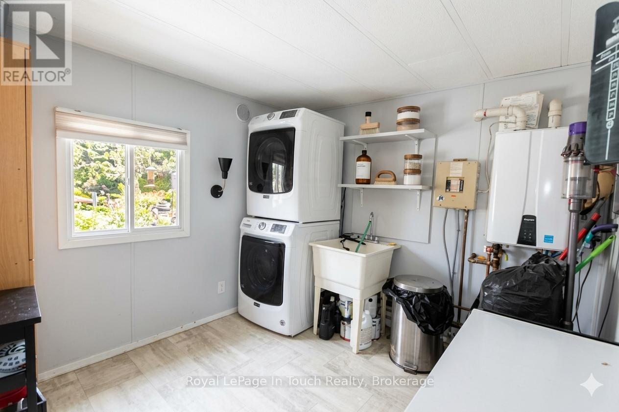 Enjoy year-round waterfront living in this one-bedroom mobile home backing onto Little Lake in Midland, offering private waterfront views and dock access for all your water activities. Just steps to the waterfront shoreline and dock from your backyard. Features include a modern kitchen and bathroom, laundry room (9.6 x 8.6ft - Den or ??), walkout to deck, on-demand hot water owned, and gas stove. Located in Smiths Camp, a family-friendly park with a pool and shuffleboard court. Monthly fee of $538.45 covers land lease, water/sewer, parking, garbage, and park maintenance. Call today to view before you miss this opportunity! (id:64974)