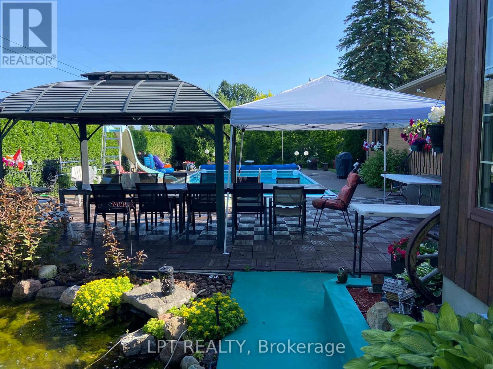 SUMMER is coming!!! You and your family and friends will love this private backyard resort-style oasis that is perfect for fun, poolside living and endless BBQ festivities. The backyard boasts an impressive 18' x 36' in-ground pool with diving board and water slide, along with a gazebo complete with curtains and solar lighting. A maintenance-free deck with awning overlooks the beautifully landscaped yard, featuring raised garden beds, perennial gardens, a functioning koi pond with waterfall and filtration system, and fully dog-proof fencing. This property is in an exclusive Champlain neighbourhood, just block off the Ottawa River.Enjoy year-round relaxation in the bright four-season sunroom that features skylights. Recent updates include a new natural gas washer and dryer, new dishwasher, and fresh upgraded paint throughout. The fully finished lower-level basement with 8-foot ceilings is ideal for entertaining, complete with a bar area, TV space, a full-size second fridge, and a cozy wood-burning fireplace! Additional highlights include a Generac generator that runs most of the home, on-demand hot water heater, hot water baseboard heating, central A/C, city water servicing the home, and well water dedicated to the full property sprinkler system. There is also RV parking with 30-amp electrical service and a convenient garden storage building. A truly turnkey property offering thoughtful upgrades and incredible outdoor living. (id:64974)