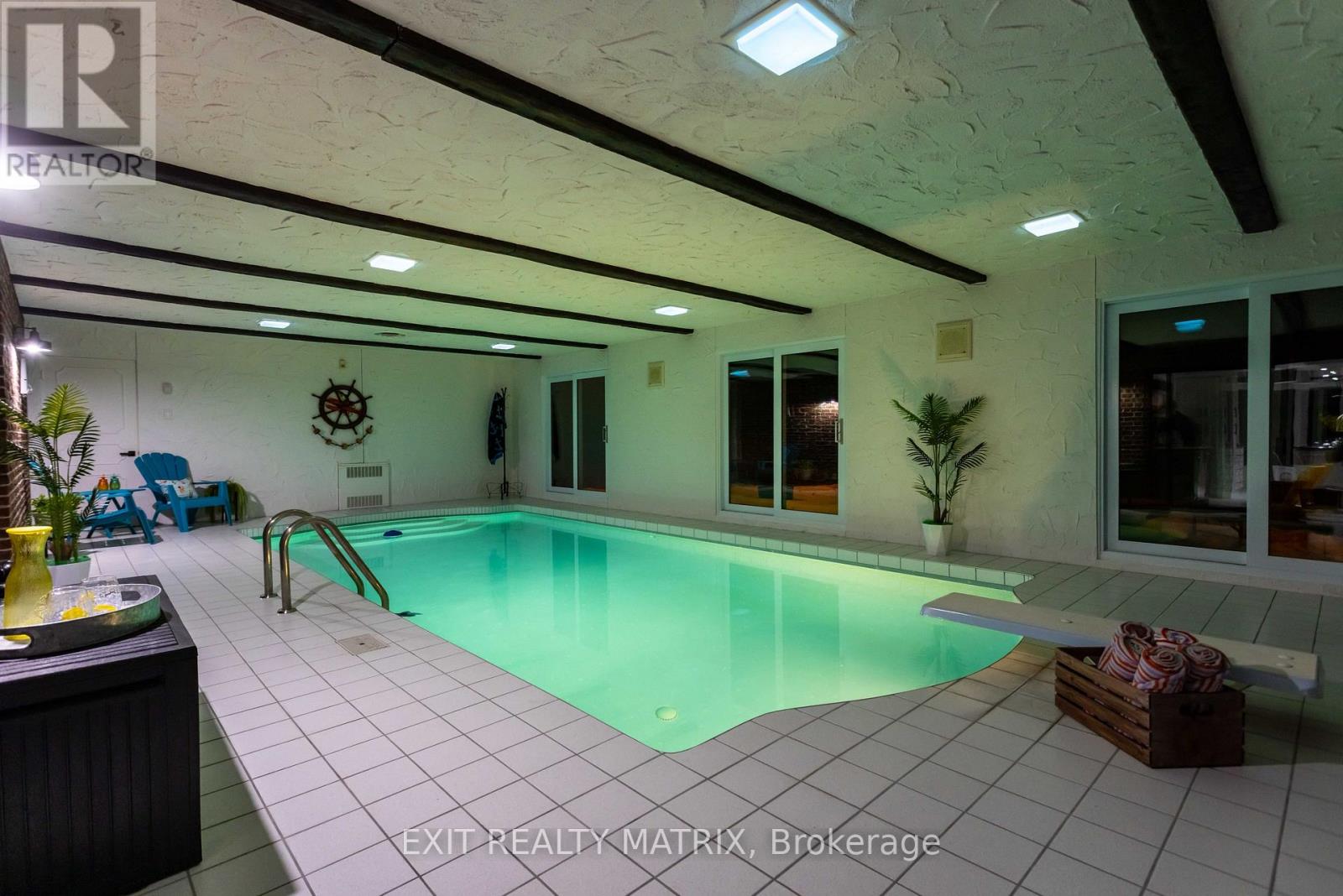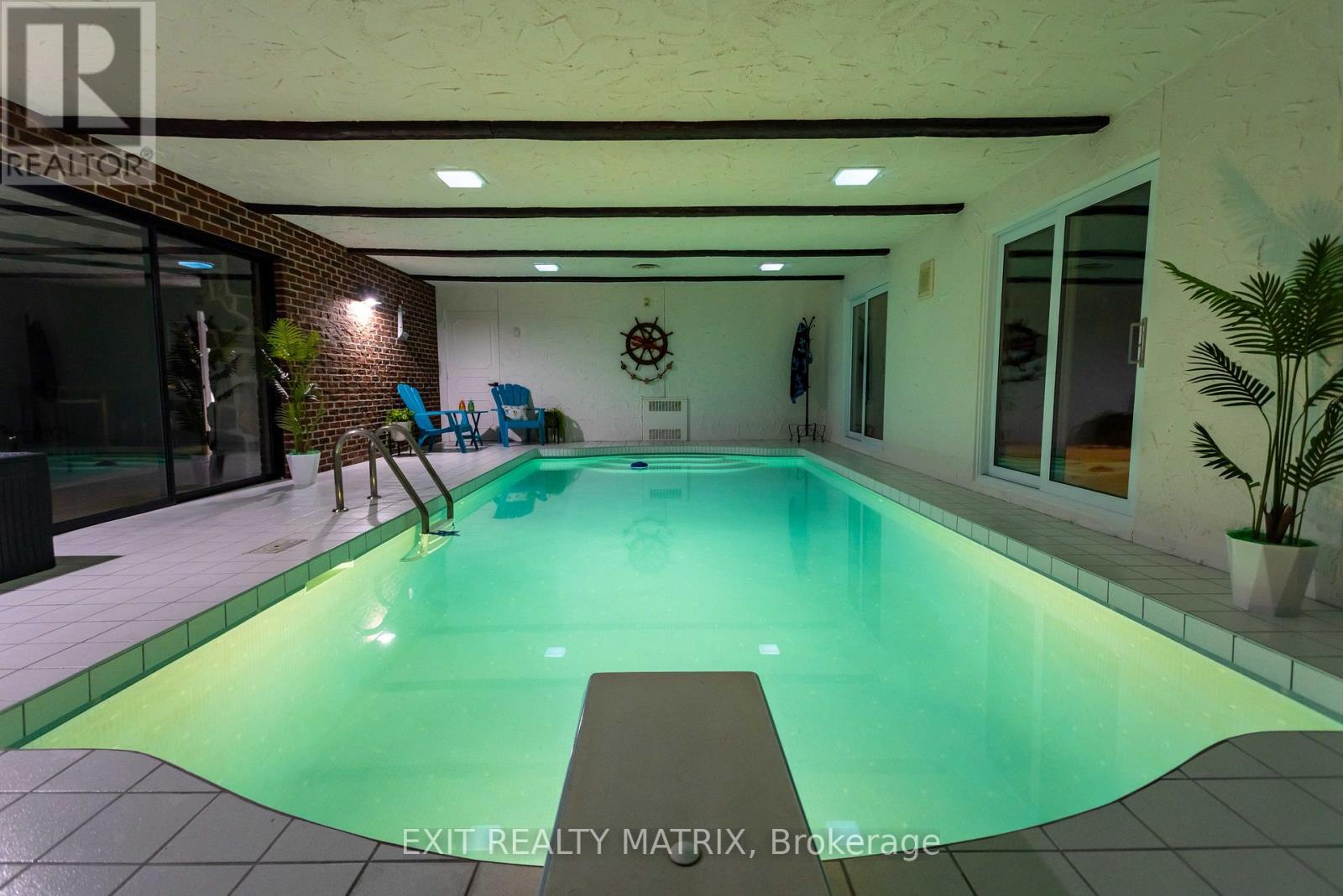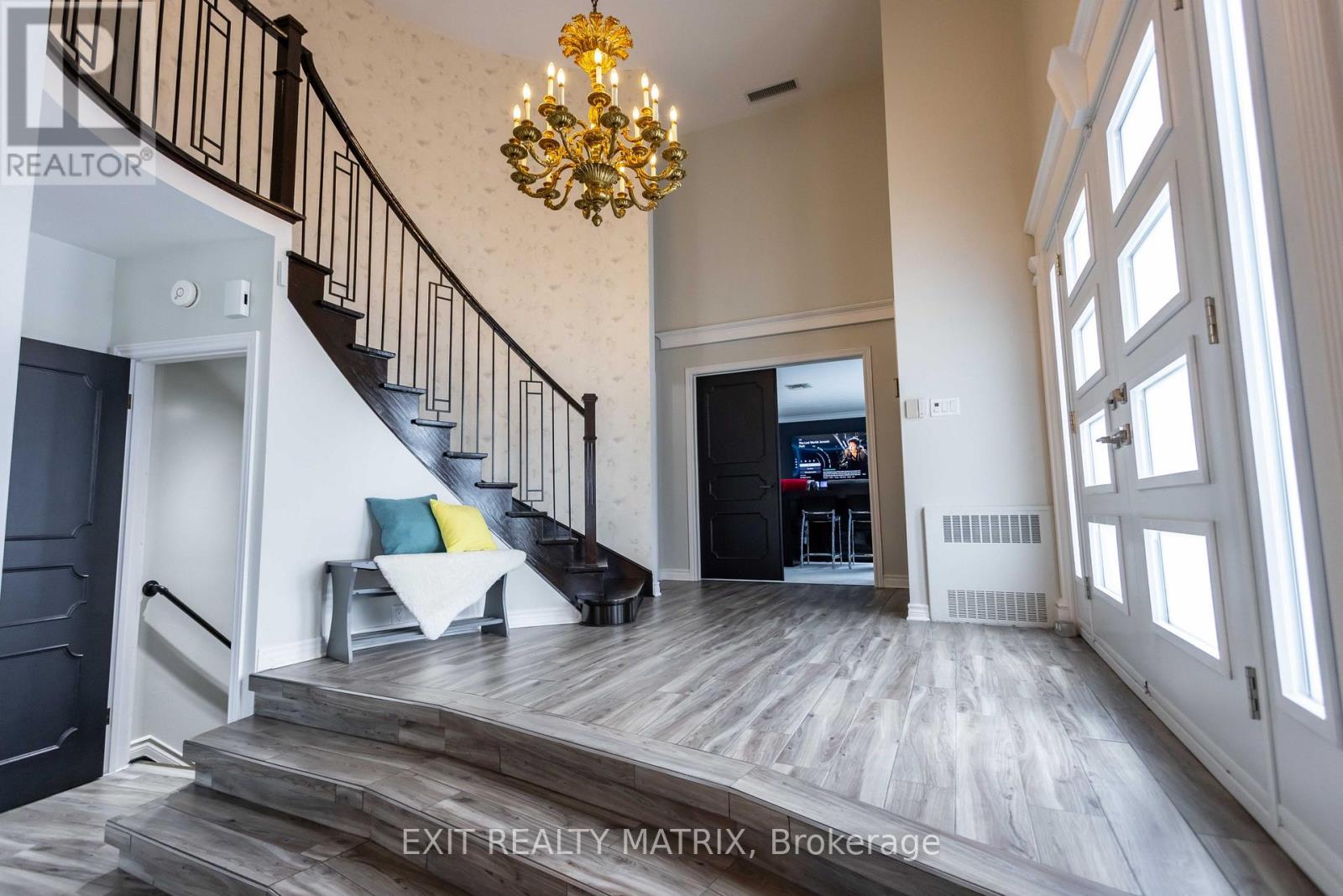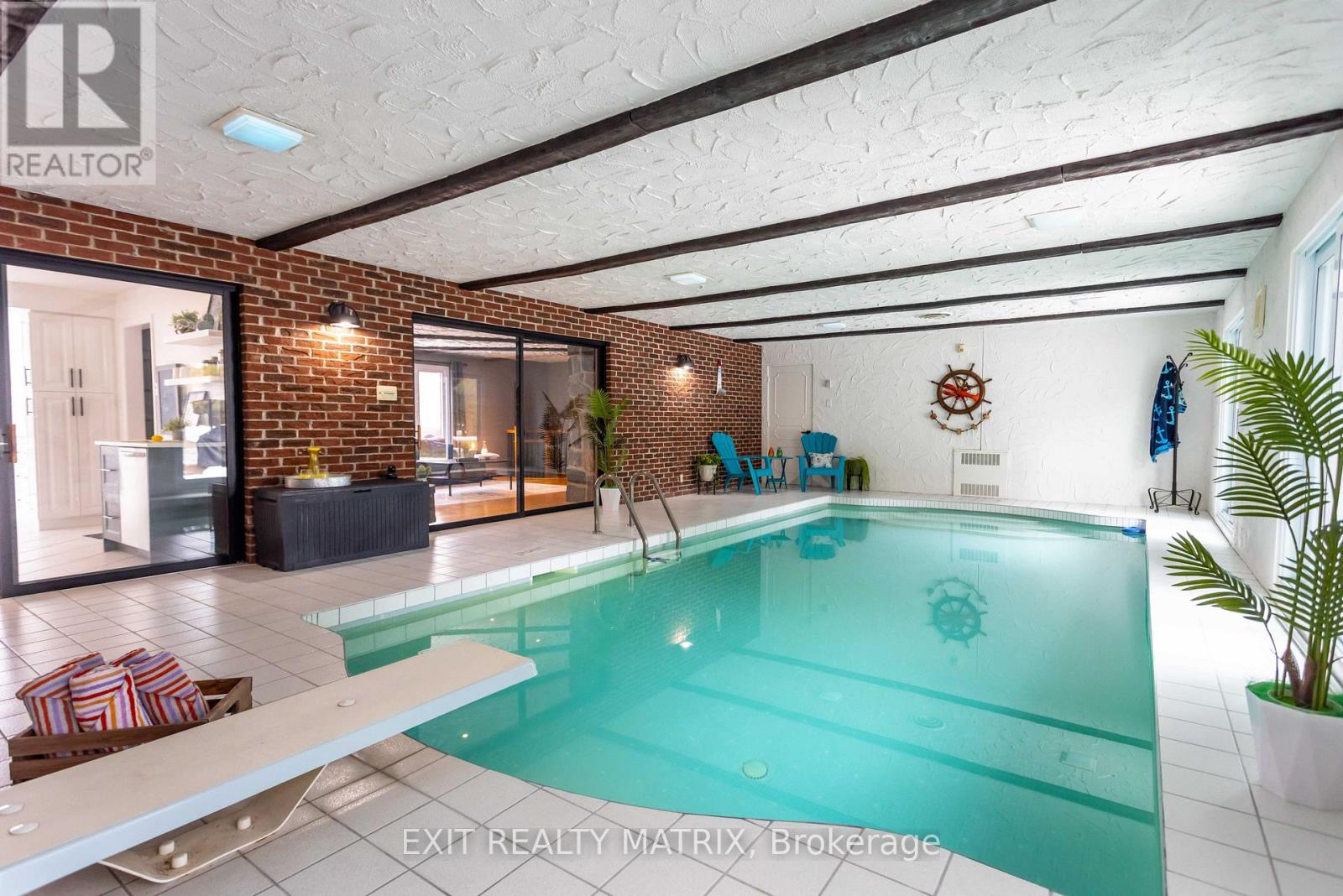 Welcome to a truly one-of-a-kind estate property in the heart of Casselman, where timeless elegance meets an outdoor lifestyle that is simply unmatched. Set on almost 2 acres, with a conservation area at the front and no rear neighbours, this remarkable, updated 4-bed, 5-bath home offers space, privacy, and an incredible connection to nature. From the moment you arrive, the home makes a lasting impression with its striking Vermont White Marble exterior & 4 car attached garage. A grand circular driveway welcomes you home, offering parking for family, guests, and all your recreational toys with ease. Step inside to discover an expansive layout designed for everyday living and unforgettable entertaining. The main level features a formal living and dining area, a spacious sun-filled gourmet kitchen with in-floor radiant heating, an island, gorgeous granite counters, abundant cabinetry, a coffee station, and a bright eat-in area. One of the most exceptional features is the indoor, heated inground pool. Imagine morning swims, evening relaxation, and entertaining in a space that feels like your own personal resort, no matter the season. Upstairs, the home continues to impress with generously sized bedrooms, including a stunning primary suite complete with a walk-in closet, and spa-like ensuite. The fully finished lower level expands your living space even further, with a large recreation room, two offices, a gym and ample storage. A 3-car detached garage is perfect for your toys. With direct proximity to green space, nearby trails, and access to a public dock and boat ramp, this property is perfectly suited for outdoor enthusiasts-whether it's kayaking, fishing, snowmobiling, or simply enjoying the tranquillity of your surroundings. With potential for 2 lots to be severed and located just steps from local amenities. You'll enjoy the quick 20-min commute to Ottawa. This home offers the perfect balance of rural serenity and commuter convenience. (id:64974)