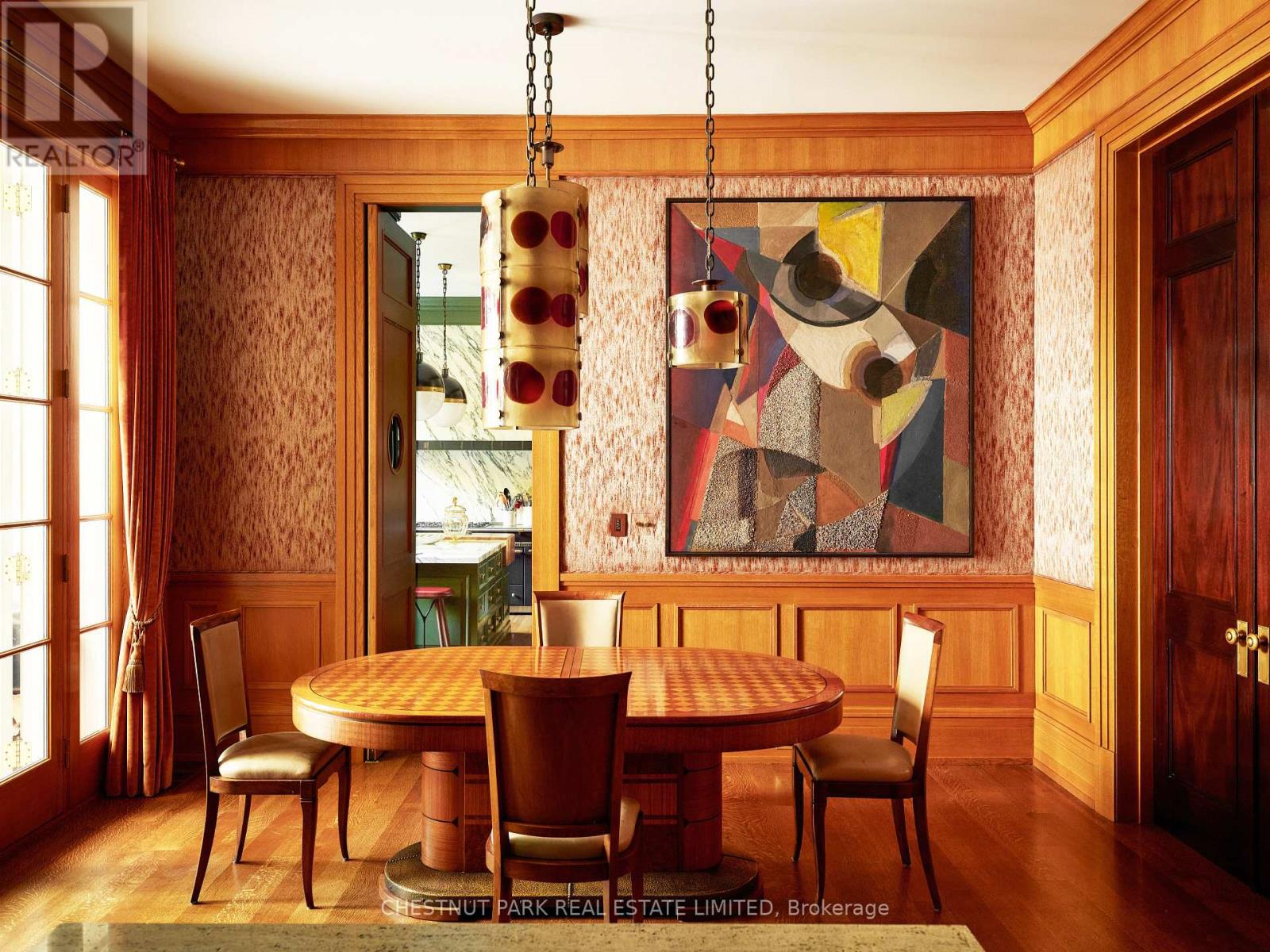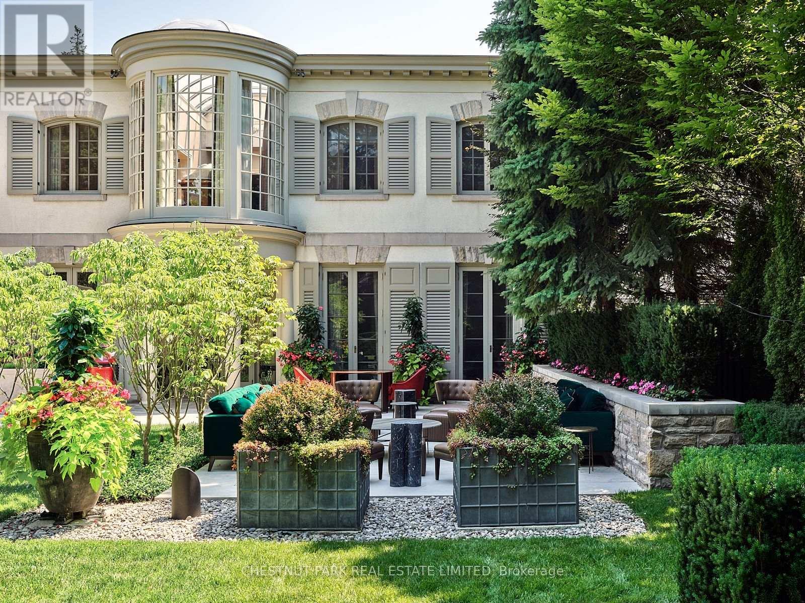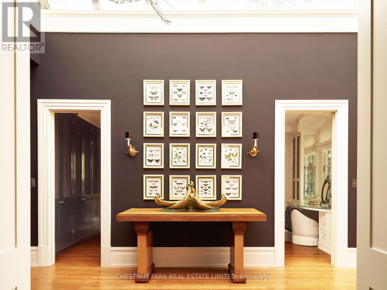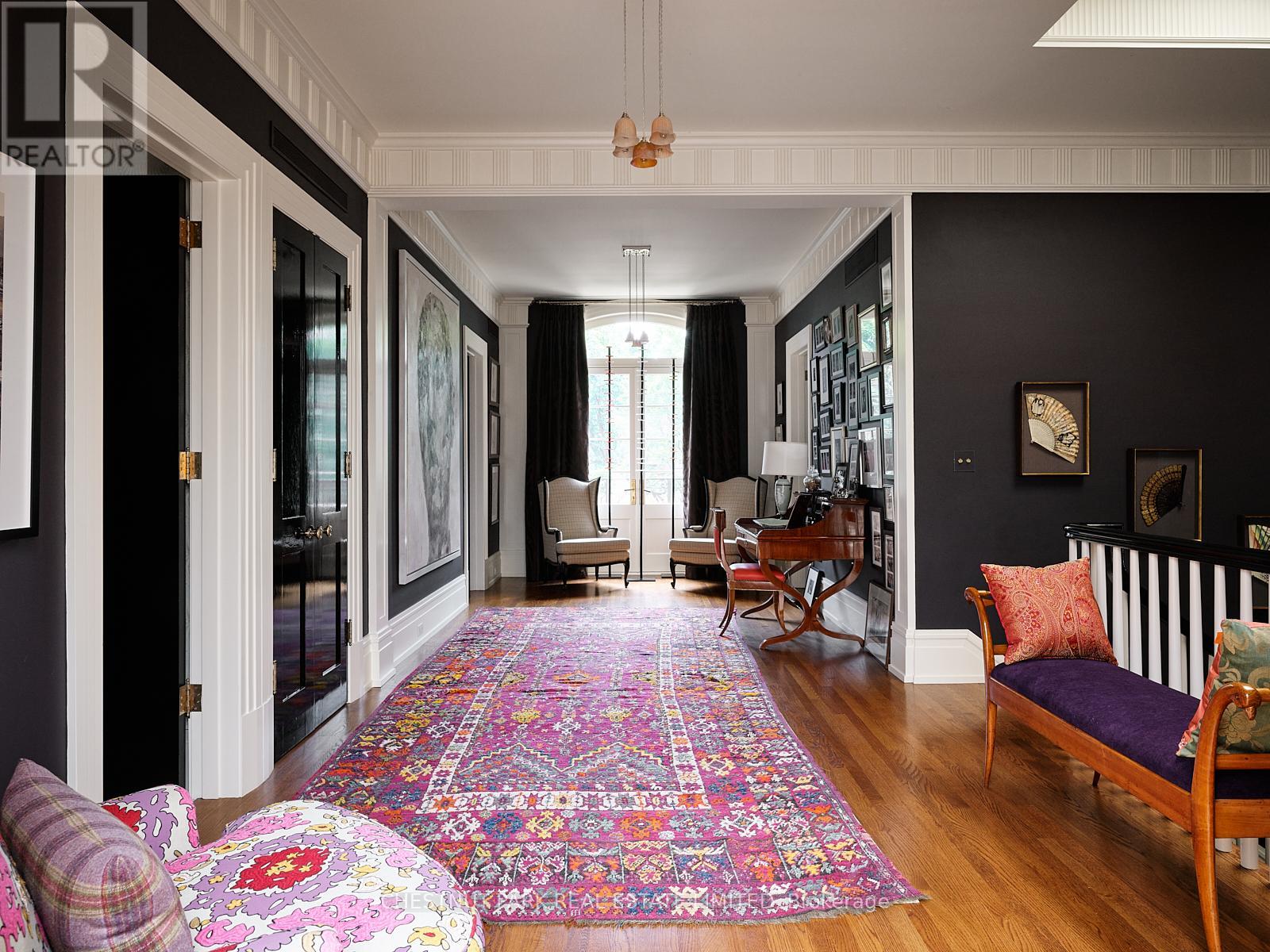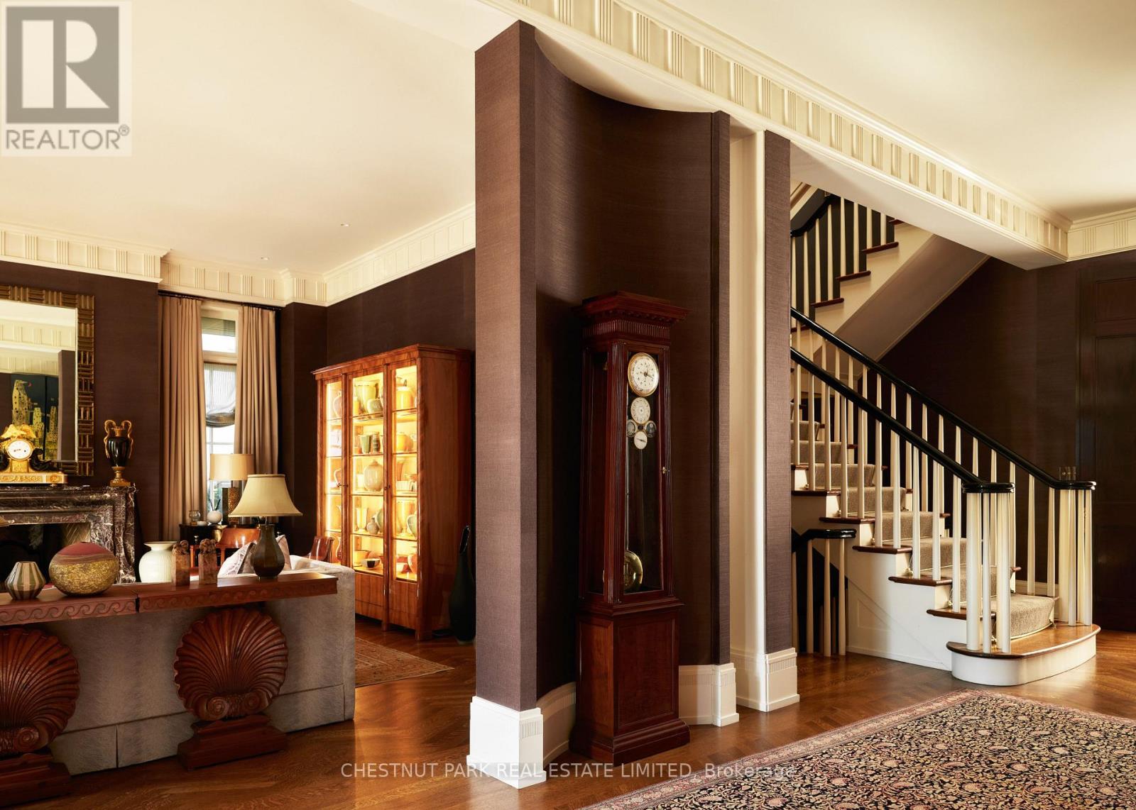 This remarkable residence stands apart among Forest Hill's most architecturally sophisticated homes. Designed & lived in by the current owners for their young family, its adaptable 8,345' layout easily accommodates executive lifestyles-from entertaining with ease to family-focused living where the stunning Kit can seamlessly open to the adjoining DR & Fam areas, & the lower media room/play room may be a children's play room or creative studio. Balancing warmth with precision, the interiors evoke serene modernism through tactile finishes & finely measured detail. Pale oak, bronze fixtures, honed limestone, & softly textured surfaces create a natural palette that diffuses light with quiet luxury. Expansive windows frame curated garden views, merging the exquisite interiors with the lush landscape. Featured in design publications, the home, built by Whitehall Homes, embodies elevated craftsmanship, soaring 11' clgs, Venetian plaster, de Gournay, molded & panelled walls, & a circular DR complemented by an elegant cherrywood study. Two offices on the main & a 14' high Library offer exceptional versatility for modern professionals. Thoughtful updates include gallery-grade lighting ('21), a Bloomsbury kitchen with servery & adjoining mudroom ('18/19), refinished rift-sawn oak herringbone floors ('18), & exquisite terraces & gardens by Janet Rosenberg ('17/18). Exemplary appointments include 2 1/4" thick veneered & hand-waxed crotch mahogany doors with custom Nanz hardware, a 31' grand hall anchored by a dramatic 3-floor split staircase, Scalamandré silk-upholstered walls in the Fam Rm, & a sumptuous PR suite featuring a vaulted Atrium Sitting area, dual ensuites with sep dressing zones, & handwoven silk broadloom. A light-filled 28' Hall Sitting area overlooks the grounds & striking Library. The lower provides a 5th & 6th BDRM, a fabulous Media/Play Rm, wine storage, a fitness or yoga studio, lots of storage & Lau. Radiant-heated floors in principal rooms. (id:64974)