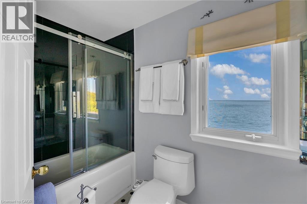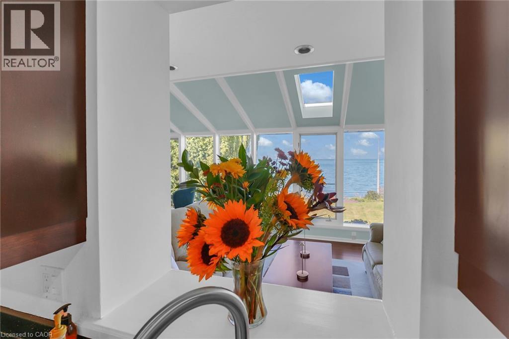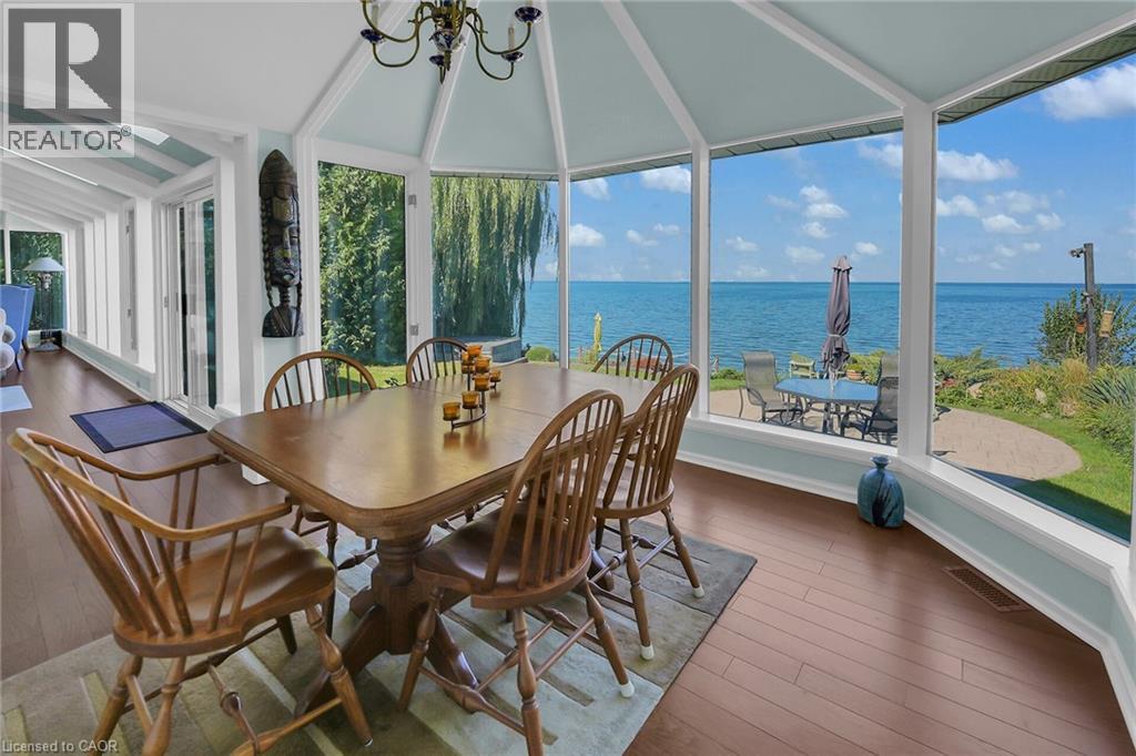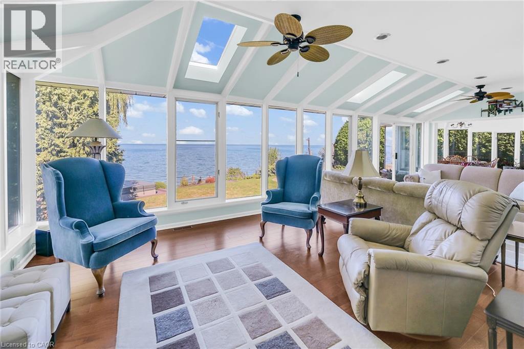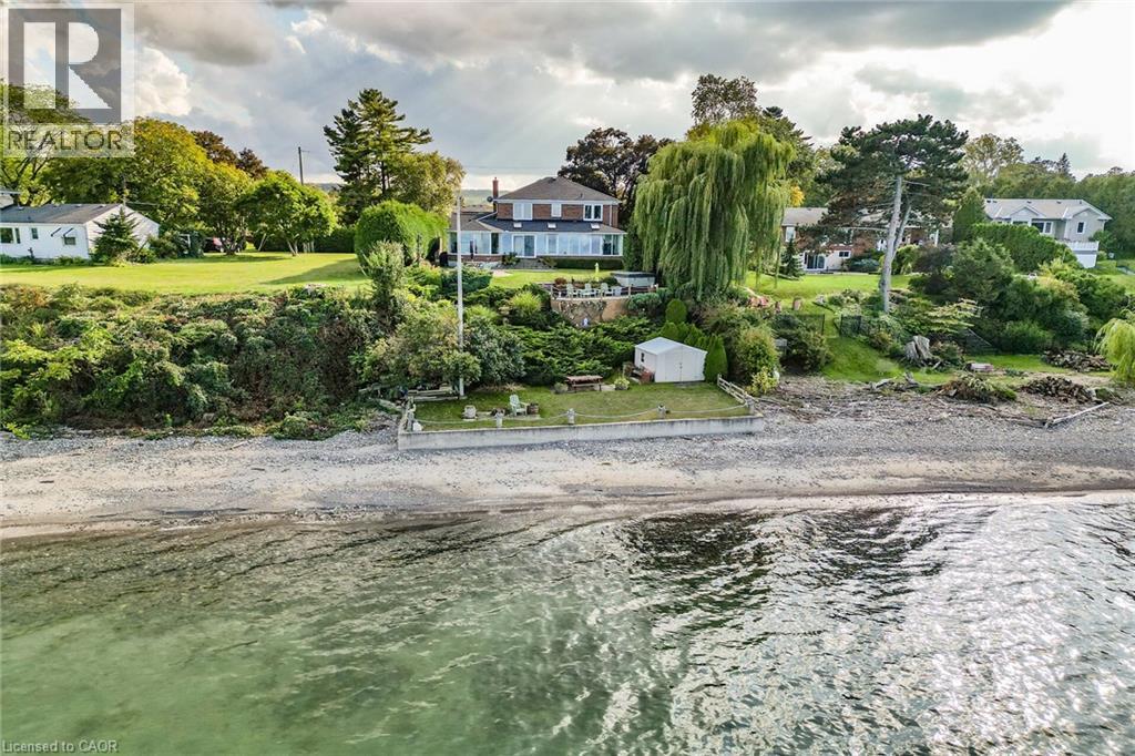 GRIMSBY BEACHFRONT WITH REMARKABLE LAKE ONTARIO AND GTA SKYLINE VIEWS – Welcome to an exceptional private beachfront home in Grimsby, where postcard-perfect Lake Ontario and GTA skyline views are a daily reality. The traditional center hall plan leads you into an elegant living room, complete with a cozy gas fireplace and unobstructed water views. The spacious kitchen features an abundance of cabinetry, while the breathtaking 500 sq ft, four-season sunroom serves as the home's centerpiece, offering wall-to-wall windows and ever-changing vistas. Upstairs, the primary bedroom suite is a private sanctuary with a walk-in closet and a three-piece ensuite, which features a custom glass shower and stunning views. Two additional, generous bedrooms and a four-piece bathroom complete the upper level. Downstairs, the finished basement provides a custom wine cellar, a large recreation/media room, and a built-in wet sauna with a two-piece bathroom. The true masterpiece is the meticulously landscaped backyard, which offers multiple entertaining areas, including a patio, a hot tub, and your own private beach—perfect for swimming, kayaking, or paddleboarding. This lakeside retreat also includes a single-car garage, double-wide parking for four cars, and easy access to the QEW, YMCA, and multiple schools. Come experience picturesque sunsets and a remarkable waterfront lifestyle. (id:64974)