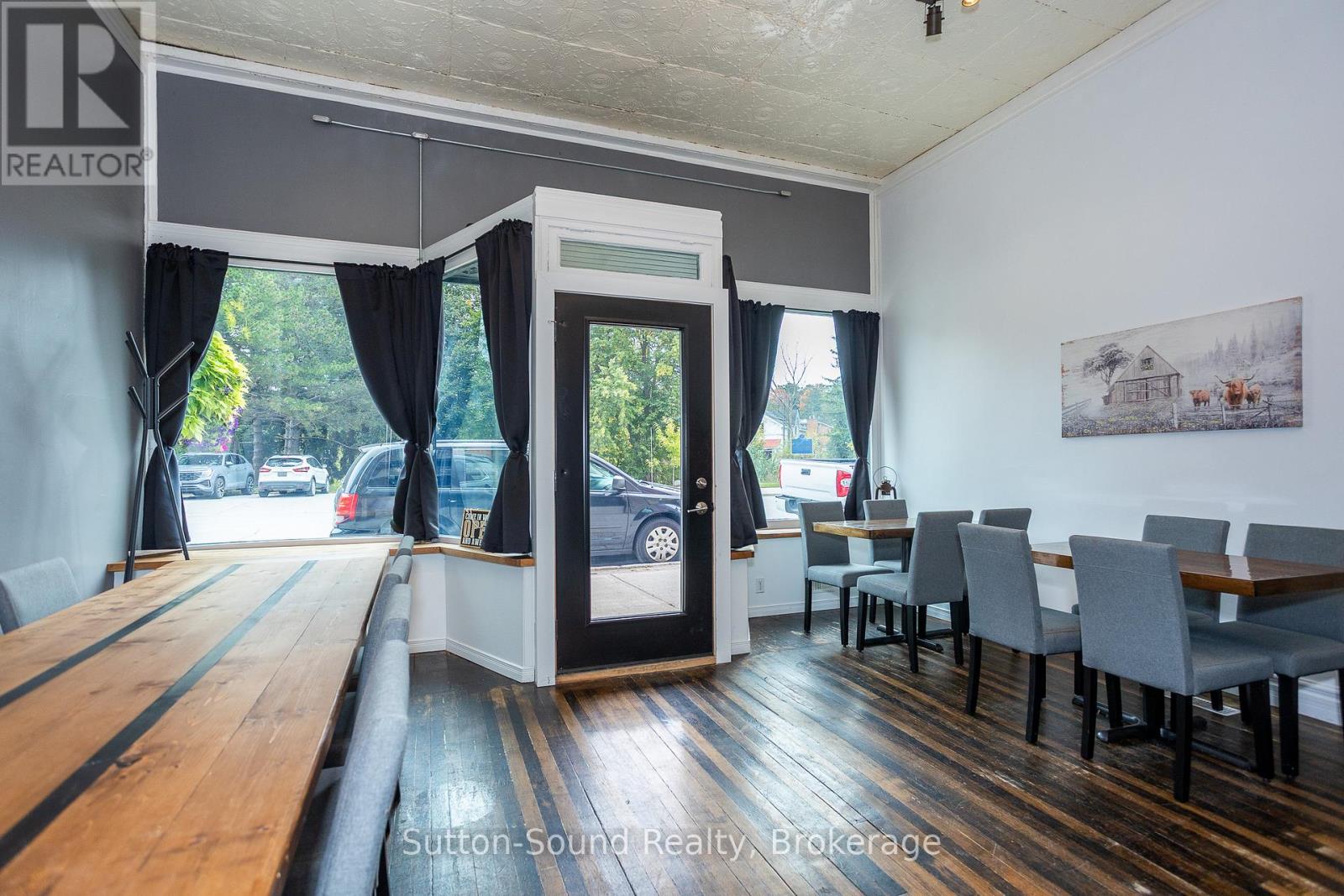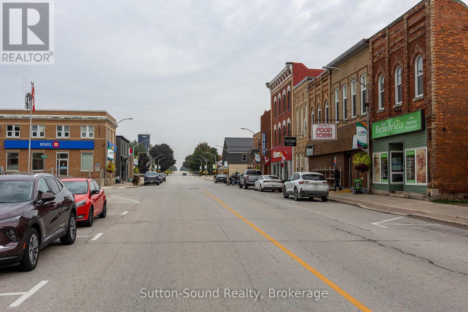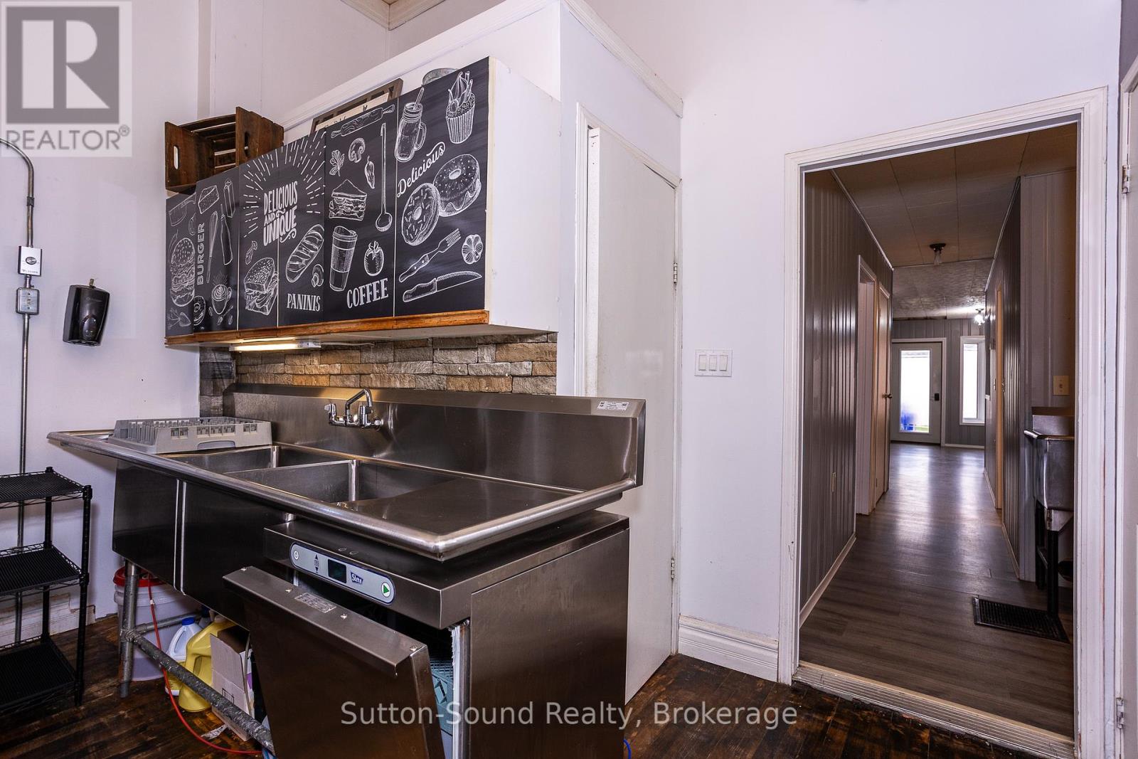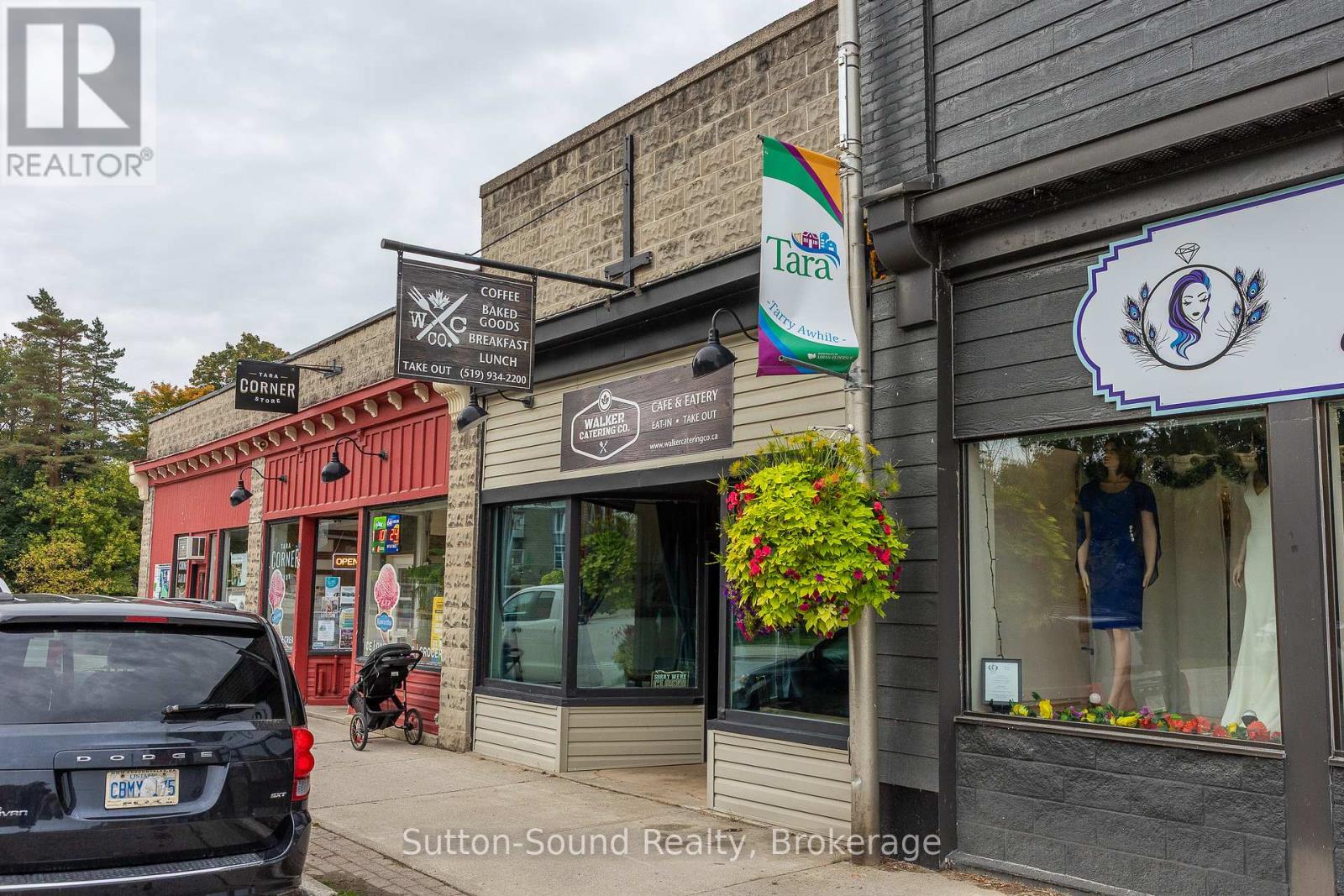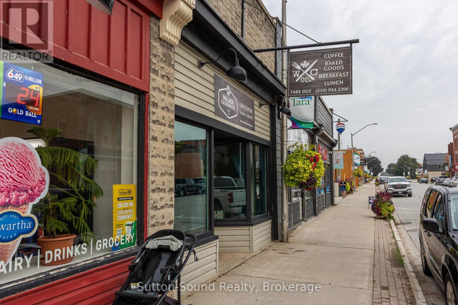 Welcome to this versatile commercial property with prime Main Street exposure in the charming village of Tara. Currently operating as a catering space, and formerly a restaurant, this property offers endless potential for your next business venture. Inside you'll find a functional layout with limited seating in the front, updated storage and work areas to the back, and two washrooms for convenience. A tidy, dry basement provides ample room for storage. The property has been well maintained, with the main flat roof replaced in 2021 and the back roof in good repair. Heating is provided by a gas furnace. An added bonus is the potential to re-establish a rear apartment, complete with space for an additional kitchen and 4-piece bathroom an excellent live-work opportunity for entrepreneurs looking to combine home and business in one location. Included in the sale are restaurant equipment and supplies, making this a turnkey opportunity for a bakery, café, pizza shop, or any creative venture you envision. While there is no dedicated parking, the excellent visibility and walkable location enhance accessibility for customers. Don't miss this chance to invest in a flexible commercial space with character, location, and multiple possibilities. (id:64974)