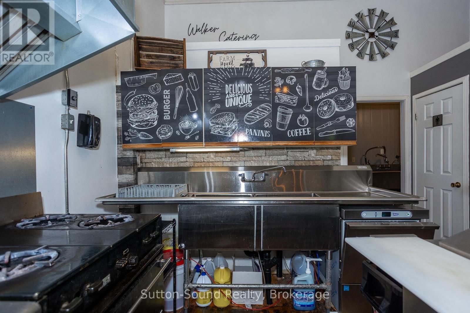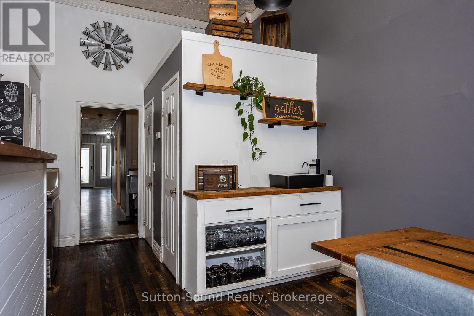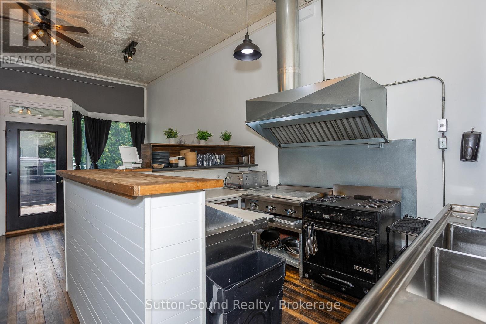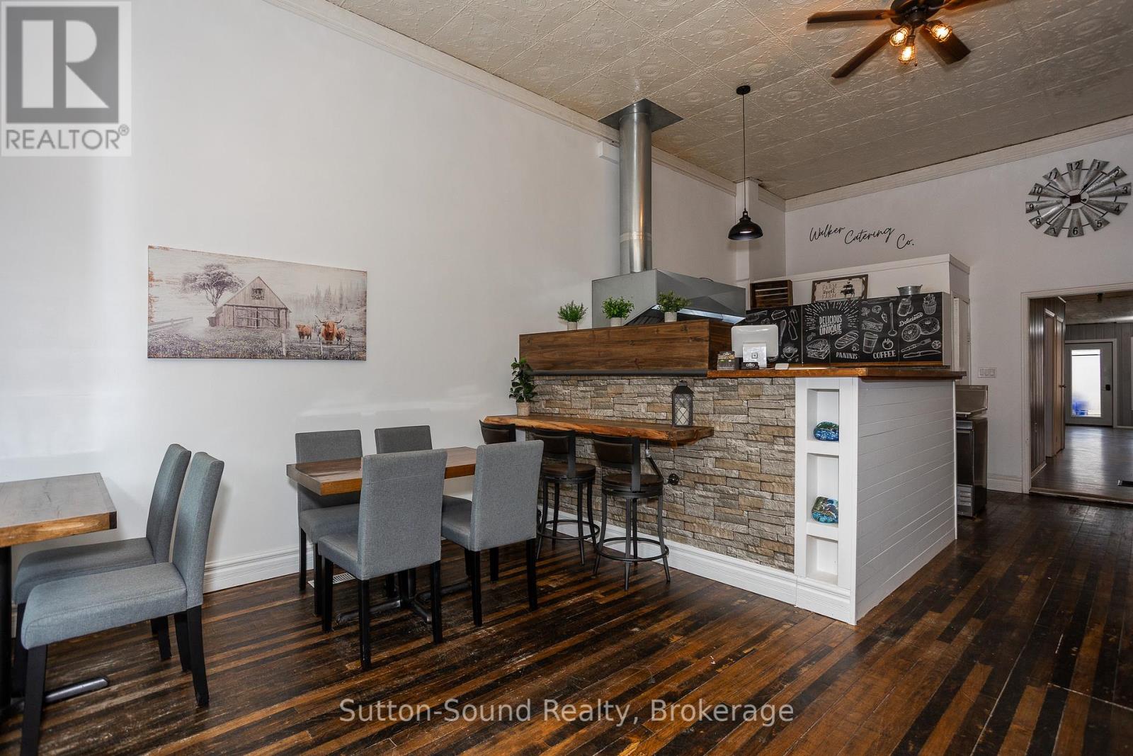 Welcome to this versatile commercial property with prime Main Street exposure in the charming village of Tara. Currently operating as a catering space, and formerly a restaurant, this property offers endless potential for your next business venture. Inside you'll find a functional layout with limited seating in the front, updated storage and work areas to the back, and two washrooms for convenience. A tidy, dry basement provides ample room for storage. The property has been well maintained, with the main flat roof replaced in 2021 and the back roof in good repair. Heating is provided by a gas furnace. An added bonus is the potential to re-establish a rear apartment, complete with space for an additional kitchen and 4-piece bathroom an excellent live-work opportunity for entrepreneurs looking to combine home and business in one location. Included in the sale are restaurant equipment and supplies, making this a turnkey opportunity for a bakery, café, pizza shop, or any creative venture you envision. While there is no dedicated parking, the excellent visibility and walkable location enhance accessibility for customers. Don't miss this chance to invest in a flexible commercial space with character, location, and multiple possibilities. (id:64974)