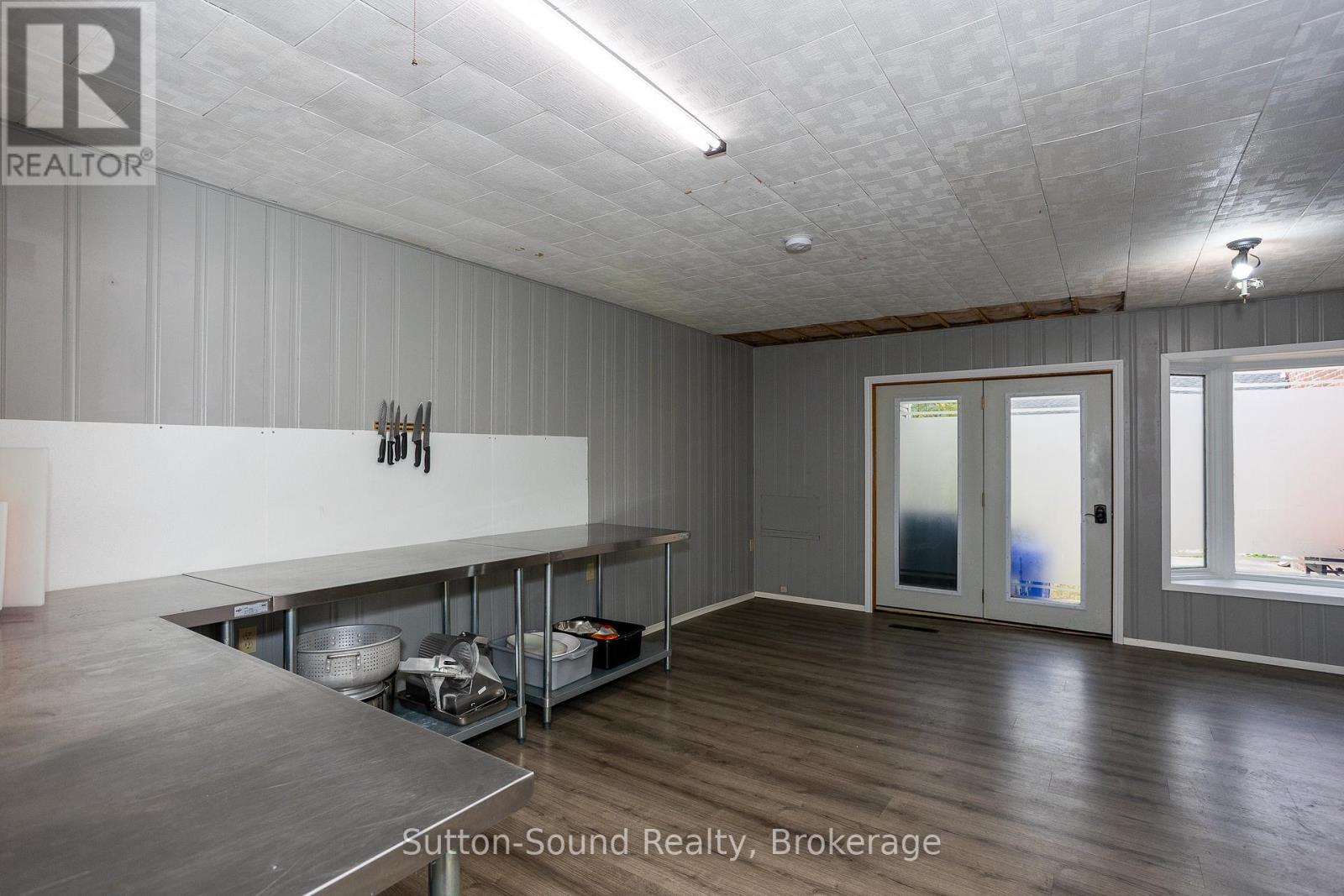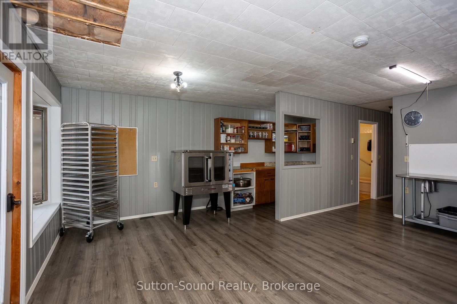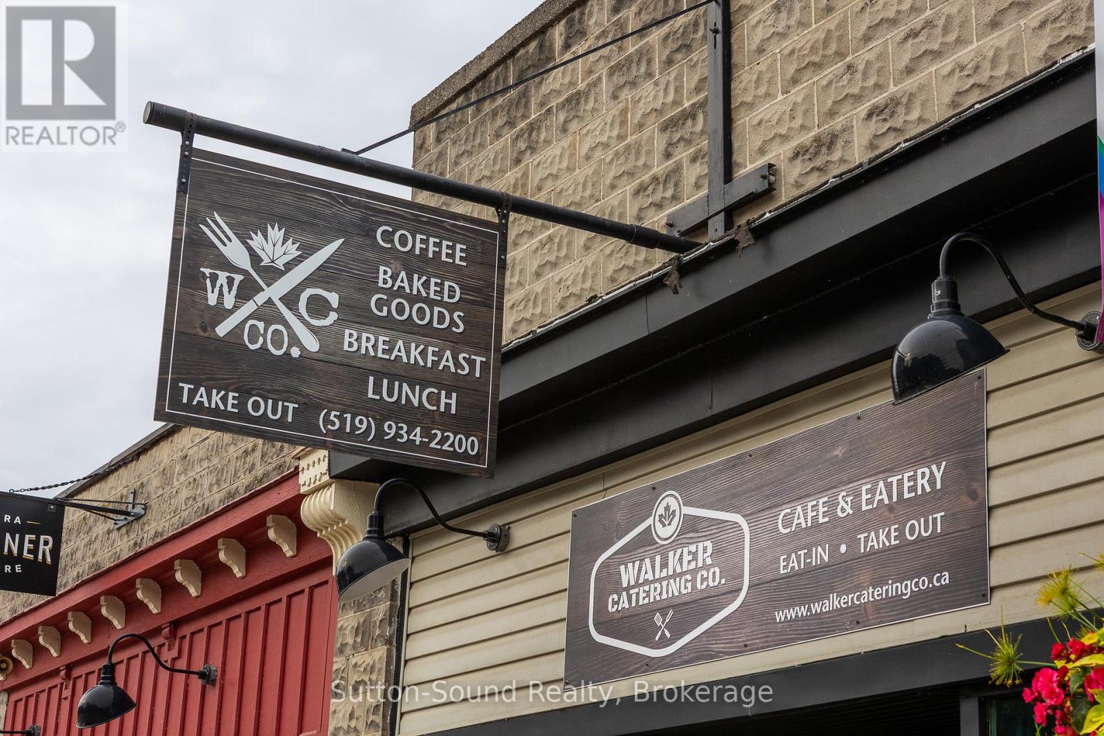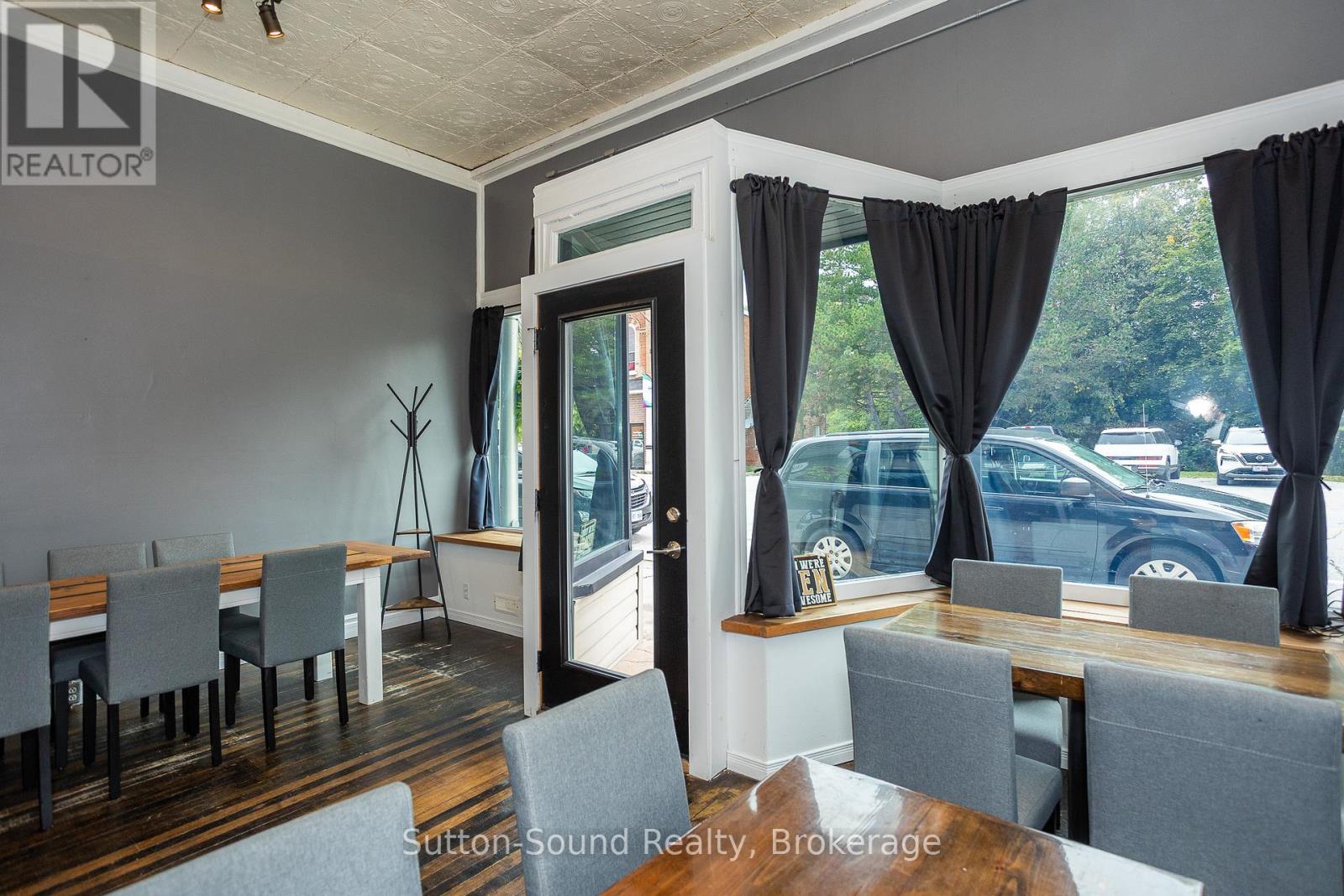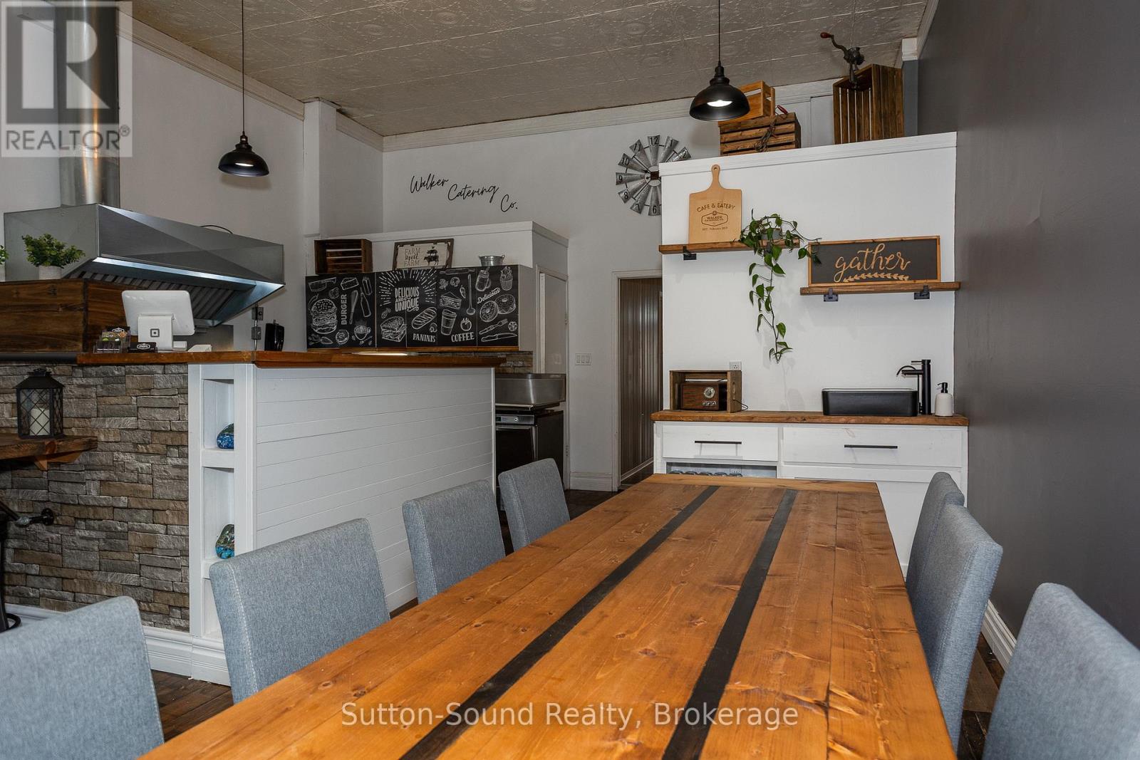 Welcome to this versatile commercial property with prime Main Street exposure in the charming village of Tara. Currently operating as a catering space, and formerly a restaurant, this property offers endless potential for your next business venture. Inside you'll find a functional layout with limited seating in the front, updated storage and work areas to the back, and two washrooms for convenience. A tidy, dry basement provides ample room for storage. The property has been well maintained, with the main flat roof replaced in 2021 and the back roof in good repair. Heating is provided by a gas furnace. An added bonus is the potential to re-establish a rear apartment, complete with space for an additional kitchen and 4-piece bathroom an excellent live-work opportunity for entrepreneurs looking to combine home and business in one location. Included in the sale are restaurant equipment and supplies, making this a turnkey opportunity for a bakery, café, pizza shop, or any creative venture you envision. While there is no dedicated parking, the excellent visibility and walkable location enhance accessibility for customers. Don't miss this chance to invest in a flexible commercial space with character, location, and multiple possibilities. (id:64974)
