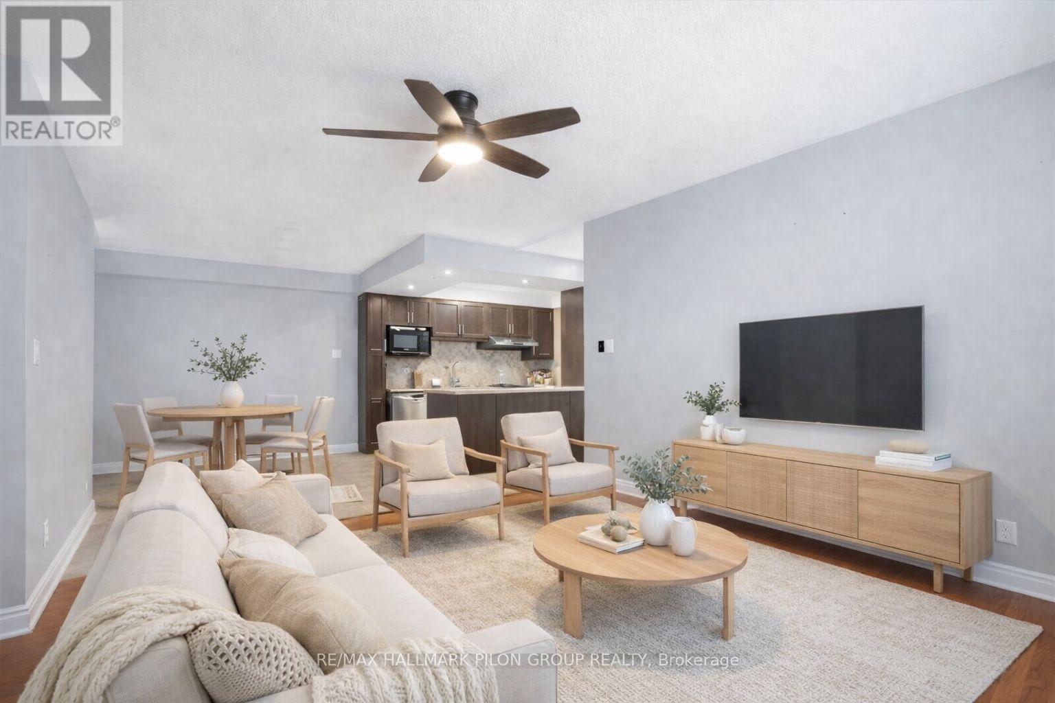 Welcome to this lovely and well-maintained 2-bedroom condo in the heart of Embrun - perfectly located near parks, shopping, schools, and within walking distance to all local amenities. This bright, open-concept unit offers a comfortable and functional layout ideal for investors, first-time buyers, and down-sizers alike.The renovated kitchen features modern cabinetry, ceramic flooring, breakfast bar and updated stainless steel appliances, including a gas oven. The adjoining dining and living areas are filled with natural light and modern pot lights. The unit also features include new remote-control ceiling fans and custom vertical blinds. Both bedrooms are generous in size with laminate flooring throughout, offering a clean and cohesive look. The renovated bathroom showcases a new vanity, backlit mirror, and waterfall shower head. Additional highlights include in-unit stacked laundry with additional storage space, natural gas forced-air heating with central air conditioning and two parking spaces. Whether you're looking for a move-in-ready home or a solid investment opportunity (currently rented at $1,947/month), this property offers exceptional value in a growing community. Enjoy comfort, convenience, and an ideal location right in the heart of Embrun. Don't be too late! Some photos virtually staged. (id:64974)