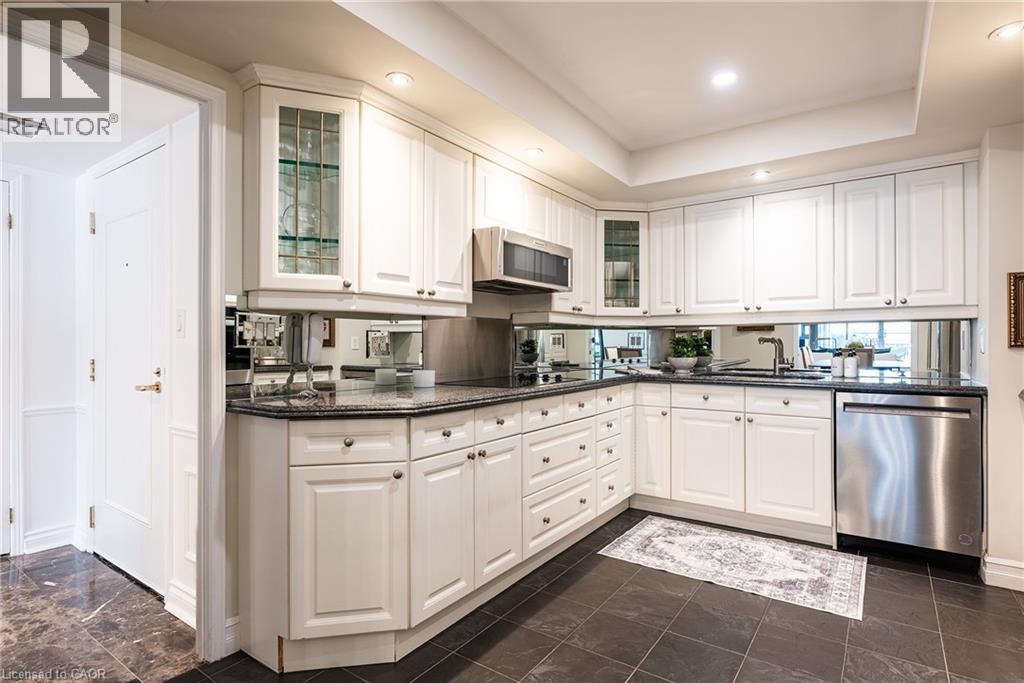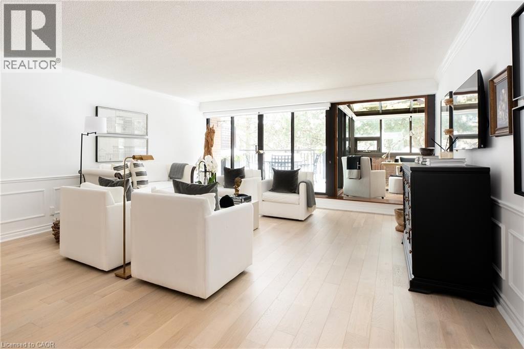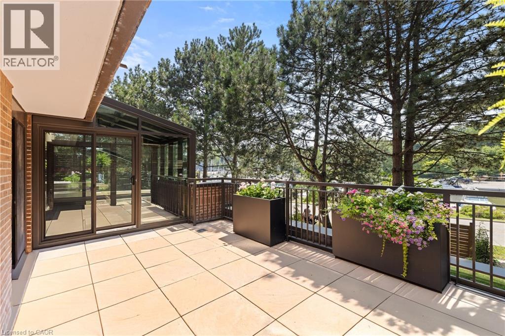 There's a certain calm that comes from living beside the water - and Suite 201 at 100 Lakeshore Road East captures it beautifully.Set within The Granary, one of Oakville's most established and sought-after waterfront residences, this second-floor suite offers a rare combination of privacy, scale, and permanently protected harbour views. Overlooking Sixteen Mile Creek, with mature trees framing the outlook, the setting feels peaceful and removed - yet steps from downtown, the harbour, and Lakeshore amenities.Inside, approximately 1,760 square feet of renovated living space is defined by generous proportions and exceptional natural light. The living and dining rooms flow effortlessly, ideal for both quiet evenings and hosting family and friends. Wide-plank light oak hardwood flooring, updated finishes, and a refreshed kitchen with updated stainless steel appliances bring a clean, timeless feel throughout.What truly sets this home apart are the outdoor spaces. Two expansive west-facing terraces - totalling approximately 365 square feet - extend the living experience outdoors. With five walk-outs, no overhang above, and open skies overhead, these terraces are sun-drenched, private, and perfectly positioned for afternoon light and evening sunsets.The primary bedroom offers a true retreat, complete with a walk-in closet, four-piece ensuite, and terrace access. A second bedroom with its own walk-out and walk-in closet provides versatility, while a dedicated laundry room and abundant storage add everyday convenience.Parking and locker are located on the same level as the suite, eliminating the need for elevators, and a nearby side stairwell provides direct access to Lakeshore Road. Quiet, private, and timelessly positioned, this is waterfront condo living without compromise. (id:64974)