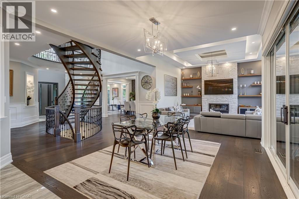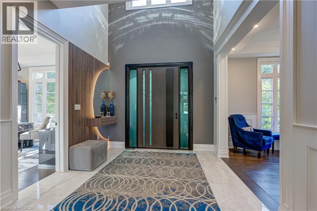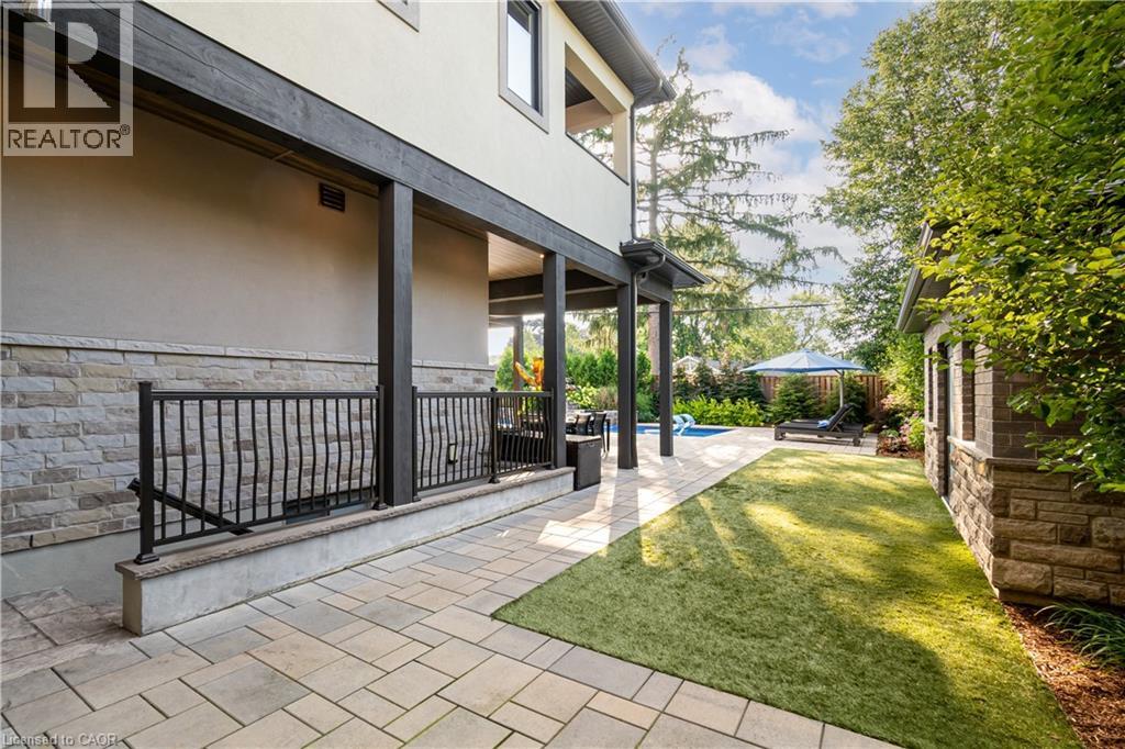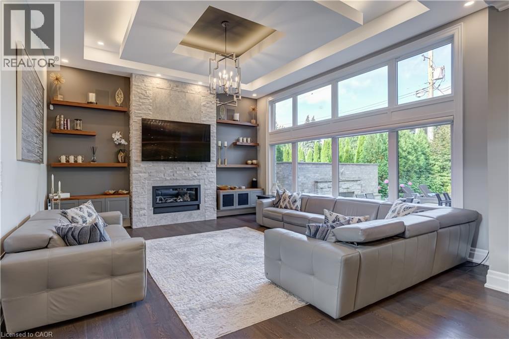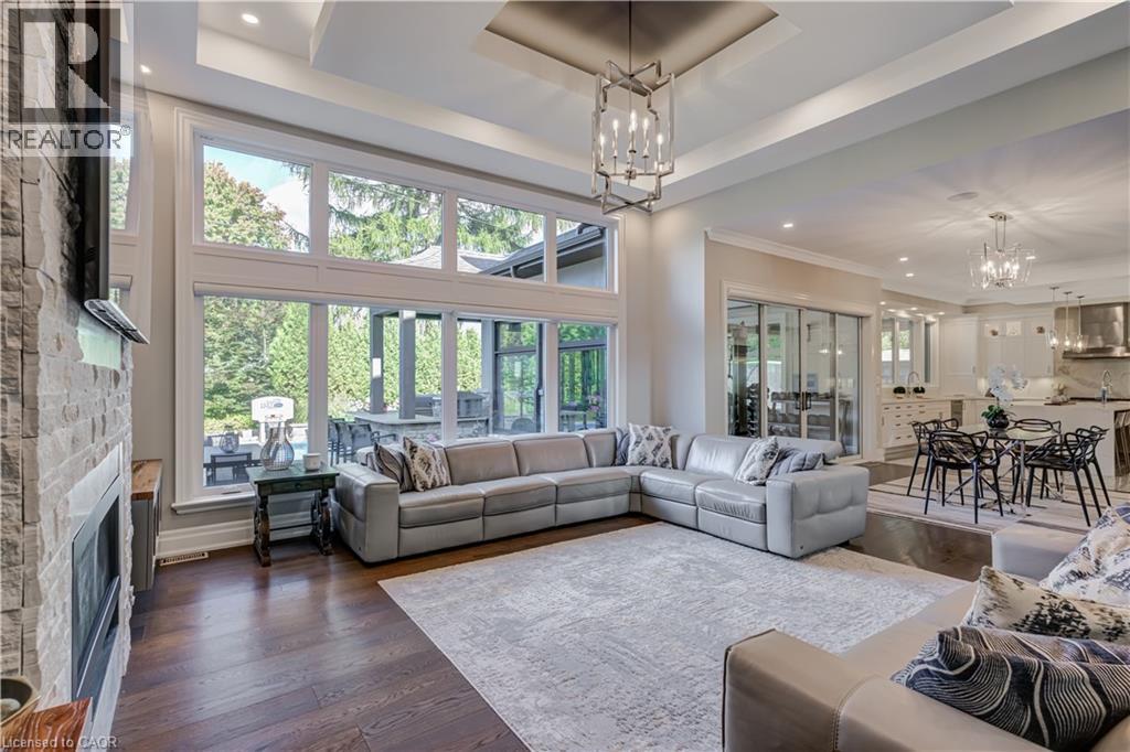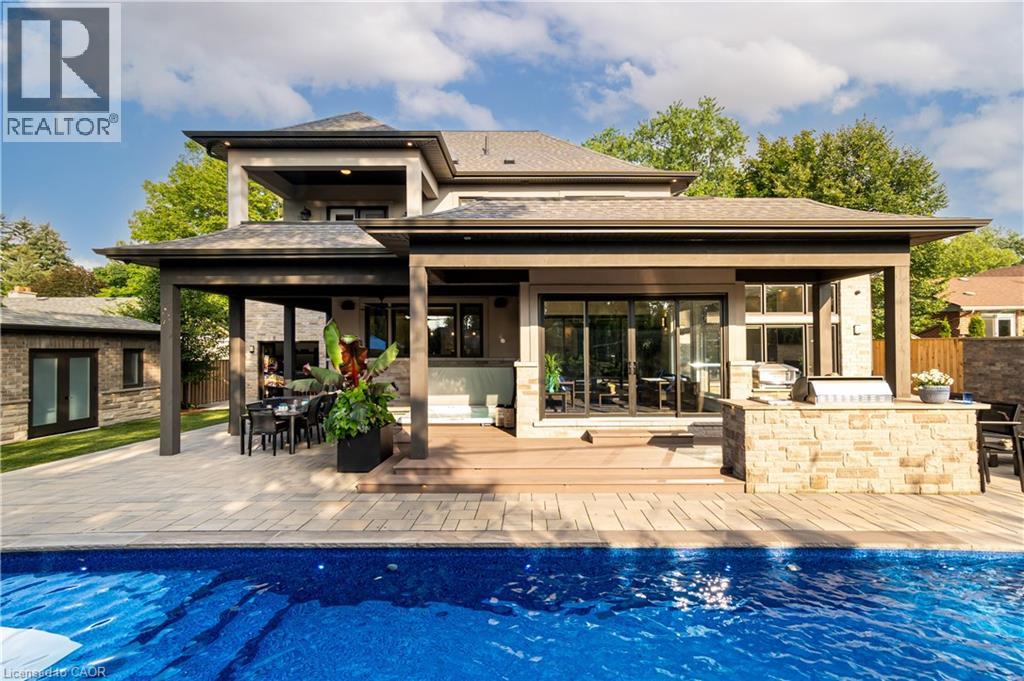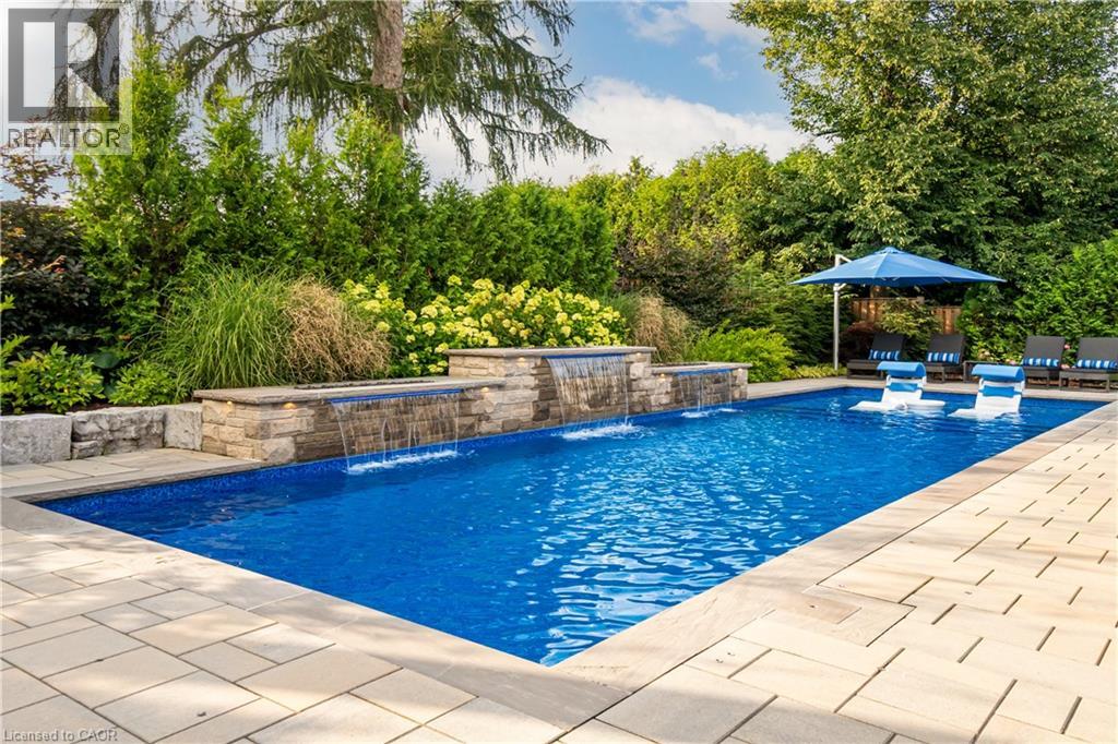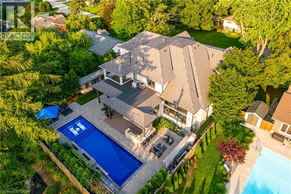 This architectural masterpiece offers 7,000 sq. ft. of luxurious living space with 4+2 bedrooms, 6 bathrooms, an incredible resort-style backyard oasis, and a fully finished basement with separate entrance. Set on an 85 x 135 ft. lot in a mature Ancaster neighbourhood, just one minute to highway access and all Power Centre amenities, this dream home impresses with striking curb appeal, professional landscaping, and an oversized triple garage with 14 ft. ceilings and two car lifts. The grand foyer with a soaring 21 ft. ceiling and curved staircase opens to a sophisticated interior featuring bold millwork, expansive porcelain, and wide-plank hardwood all illuminated by massive windows allowing plenty of natural light. The main level boasts formal living and dining rooms with 12 ft. ceilings, a private office, powder room, mudroom, and a gourmet eat-in kitchen with top-tier appliances. A 4-season sunroom with radiant in-floor heating and a family room with 11 ft. ceiling and stone fireplace create the perfect entertaining spaces. Upstairs, the sensational primary suite includes custom built-ins, spa-inspired 5-piece bath, private balcony, walk-in closet, and a custom dressing room fit for any wardrobe. Three additional bedrooms, all with ensuite baths (heated floors), and bedroom level laundry complete the upper level. The finished lower level offers a recreation area, home theatre, 2 bedrooms, full bath, second laundry, and kitchenette—ideal for family enjoyment or a multigenerational in-law suite. Step outside to a private resort-style retreat with heated saltwater pool (waterfalls, lights, fire features), sunken hot tub, outdoor kitchen with pizza oven, extensive hardscaping, artificial turf, storage shed, and an elite K-Array sound system. Upgrades include Control4 automation, integrated security with cameras, whole-home sound, and dual furnaces, A/Cs, and HRVs for comfort and efficiency. A rare opportunity to own one of Ancaster’s most extraordinary residences! (id:64974)