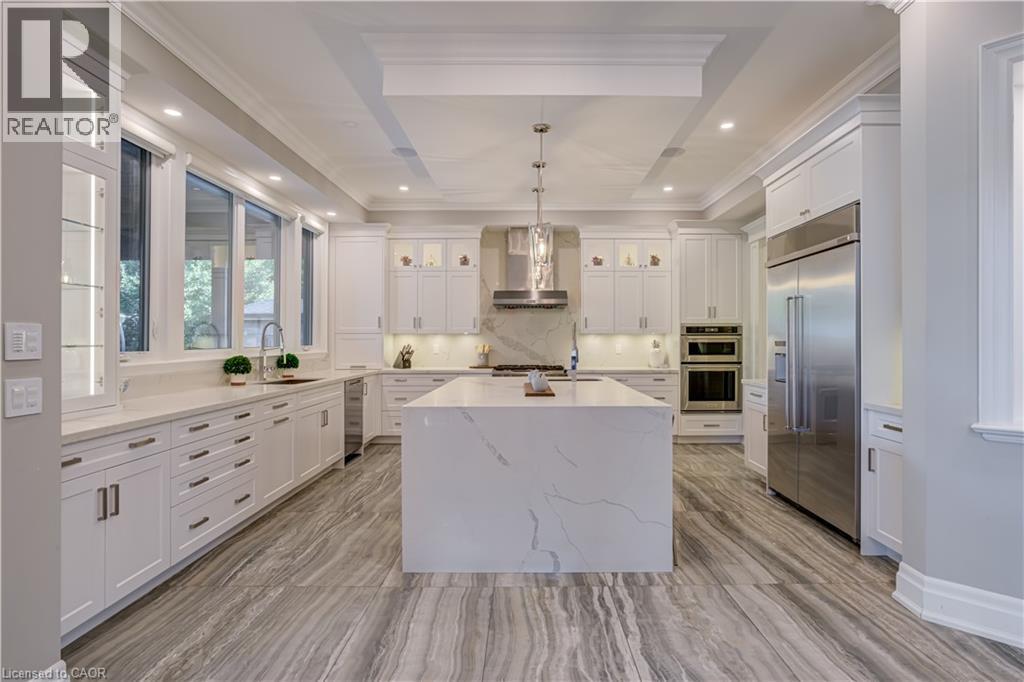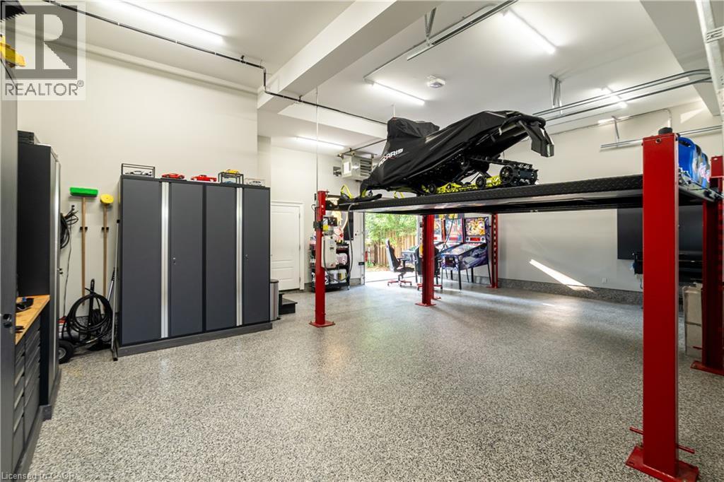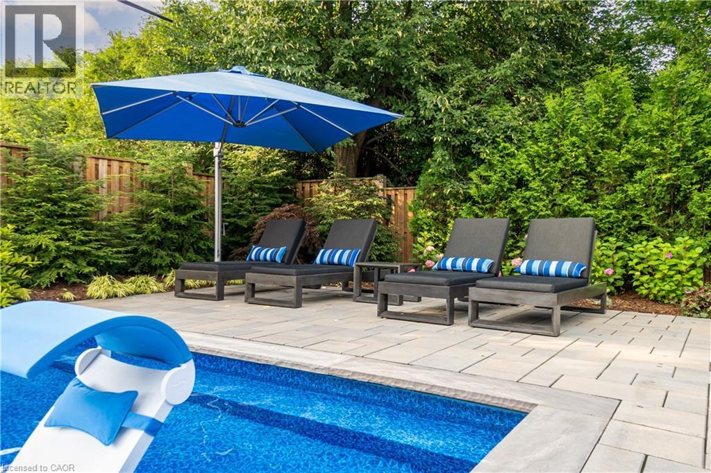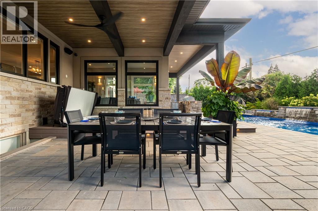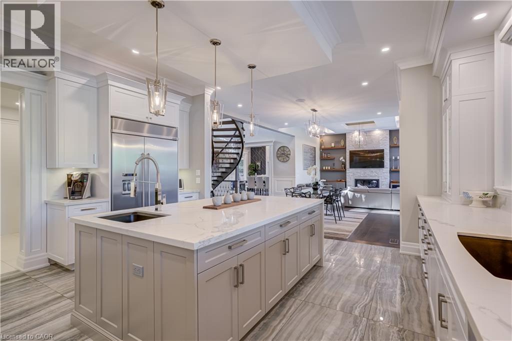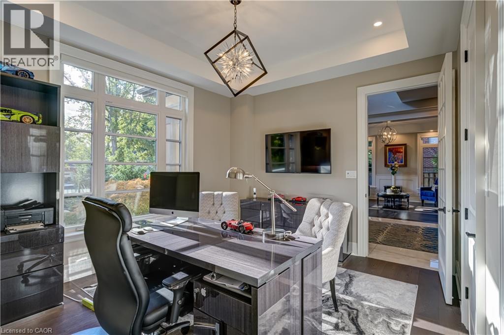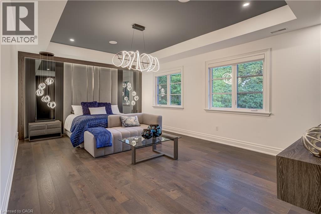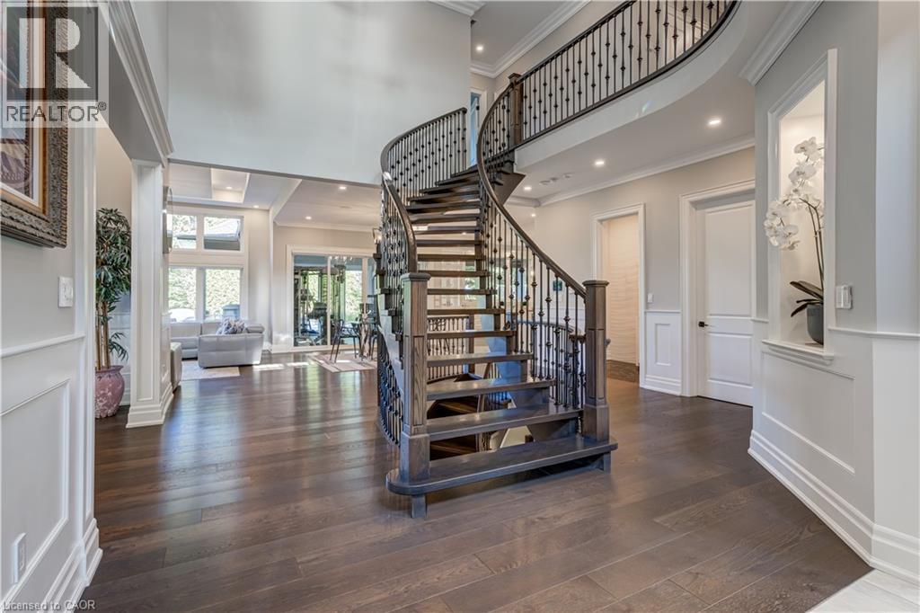 This architectural masterpiece offers 7,000 sq. ft. of luxurious living space with 4+2 bedrooms, 6 bathrooms, an incredible resort-style backyard oasis, and a fully finished basement with separate entrance. Set on an 85 x 135 ft. lot in a mature Ancaster neighbourhood, just one minute to highway access and all Power Centre amenities, this dream home impresses with striking curb appeal, professional landscaping, and an oversized triple garage with 14 ft. ceilings and two car lifts. The grand foyer with a soaring 21 ft. ceiling and curved staircase opens to a sophisticated interior featuring bold millwork, expansive porcelain, and wide-plank hardwood all illuminated by massive windows allowing plenty of natural light. The main level boasts formal living and dining rooms with 12 ft. ceilings, a private office, powder room, mudroom, and a gourmet eat-in kitchen with top-tier appliances. A 4-season sunroom with radiant in-floor heating and a family room with 11 ft. ceiling and stone fireplace create the perfect entertaining spaces. Upstairs, the sensational primary suite includes custom built-ins, spa-inspired 5-piece bath, private balcony, walk-in closet, and a custom dressing room fit for any wardrobe. Three additional bedrooms, all with ensuite baths (heated floors), and bedroom level laundry complete the upper level. The finished lower level offers a recreation area, home theatre, 2 bedrooms, full bath, second laundry, and kitchenette—ideal for family enjoyment or a multigenerational in-law suite. Step outside to a private resort-style retreat with heated saltwater pool (waterfalls, lights, fire features), sunken hot tub, outdoor kitchen with pizza oven, extensive hardscaping, artificial turf, storage shed, and an elite K-Array sound system. Upgrades include Control4 automation, integrated security with cameras, whole-home sound, and dual furnaces, A/Cs, and HRVs for comfort and efficiency. A rare opportunity to own one of Ancaster’s most extraordinary residences! (id:64974)