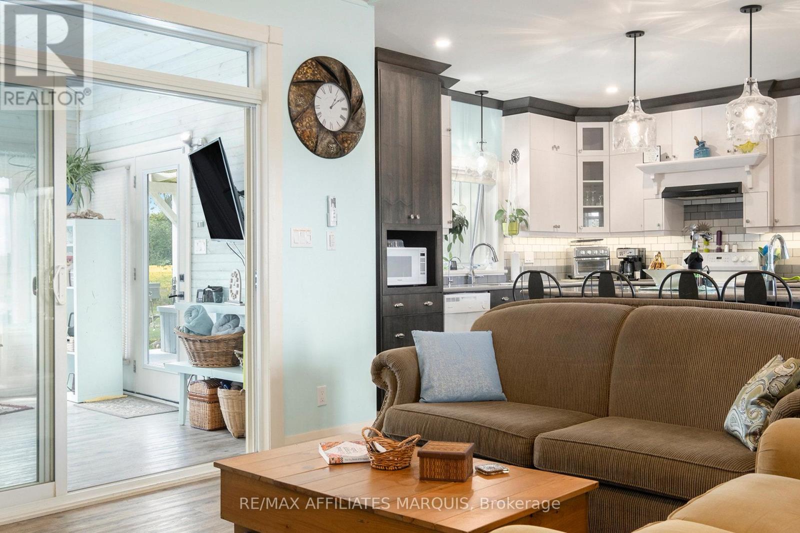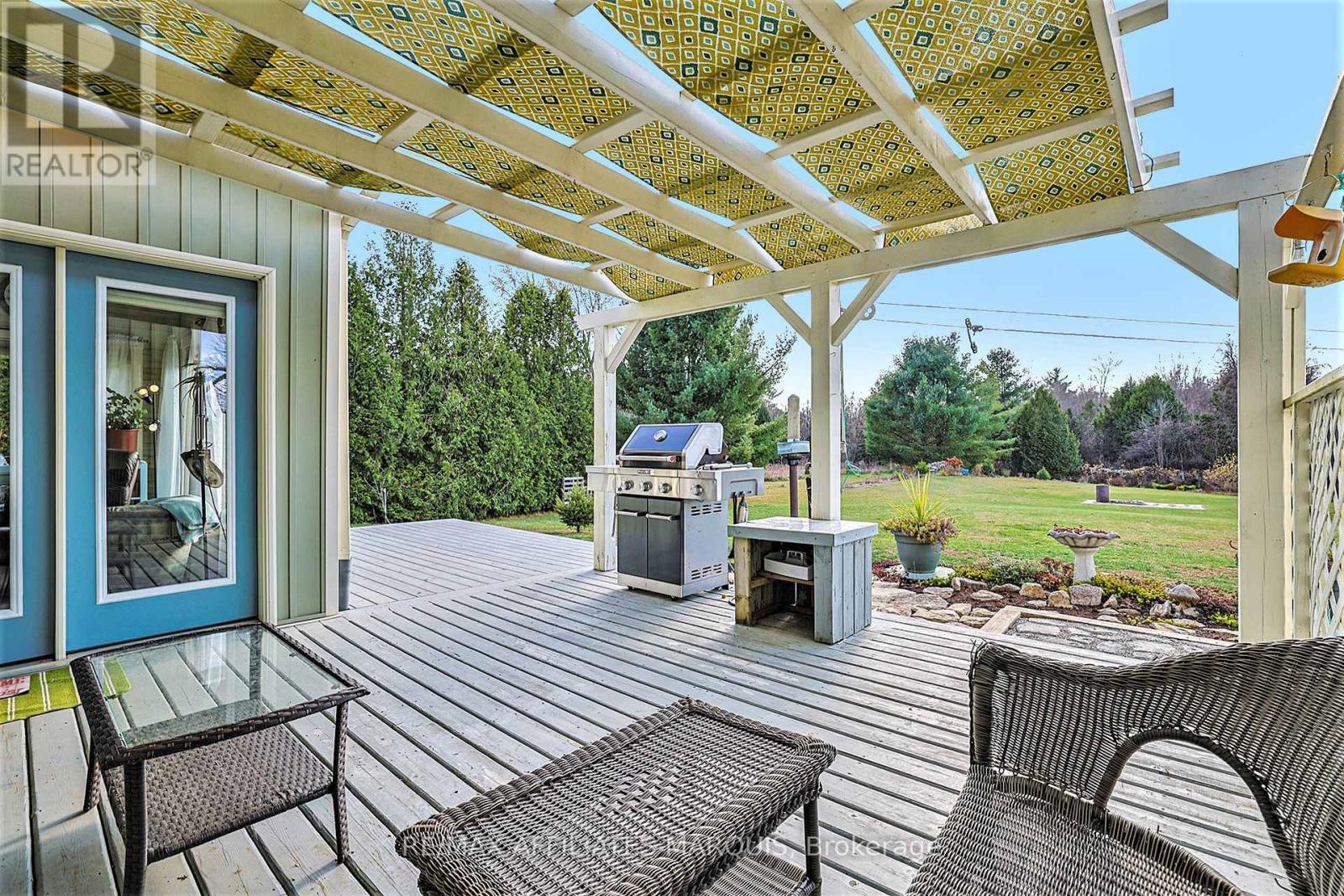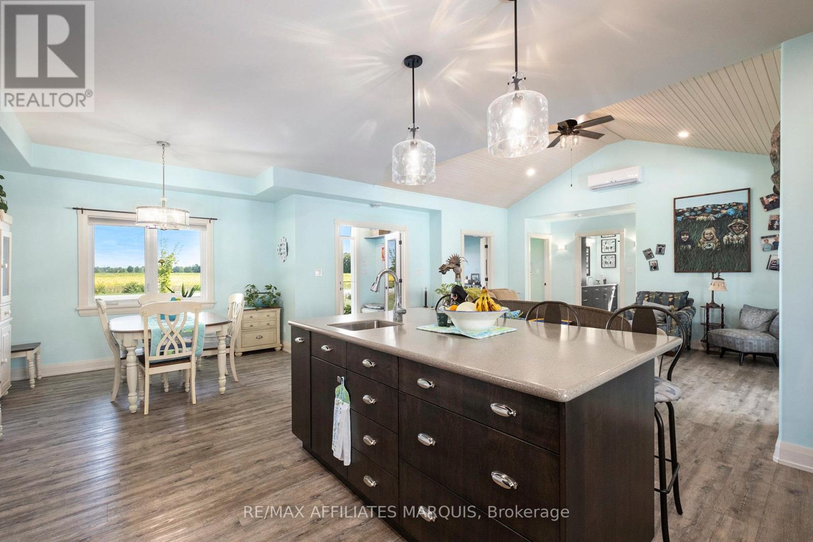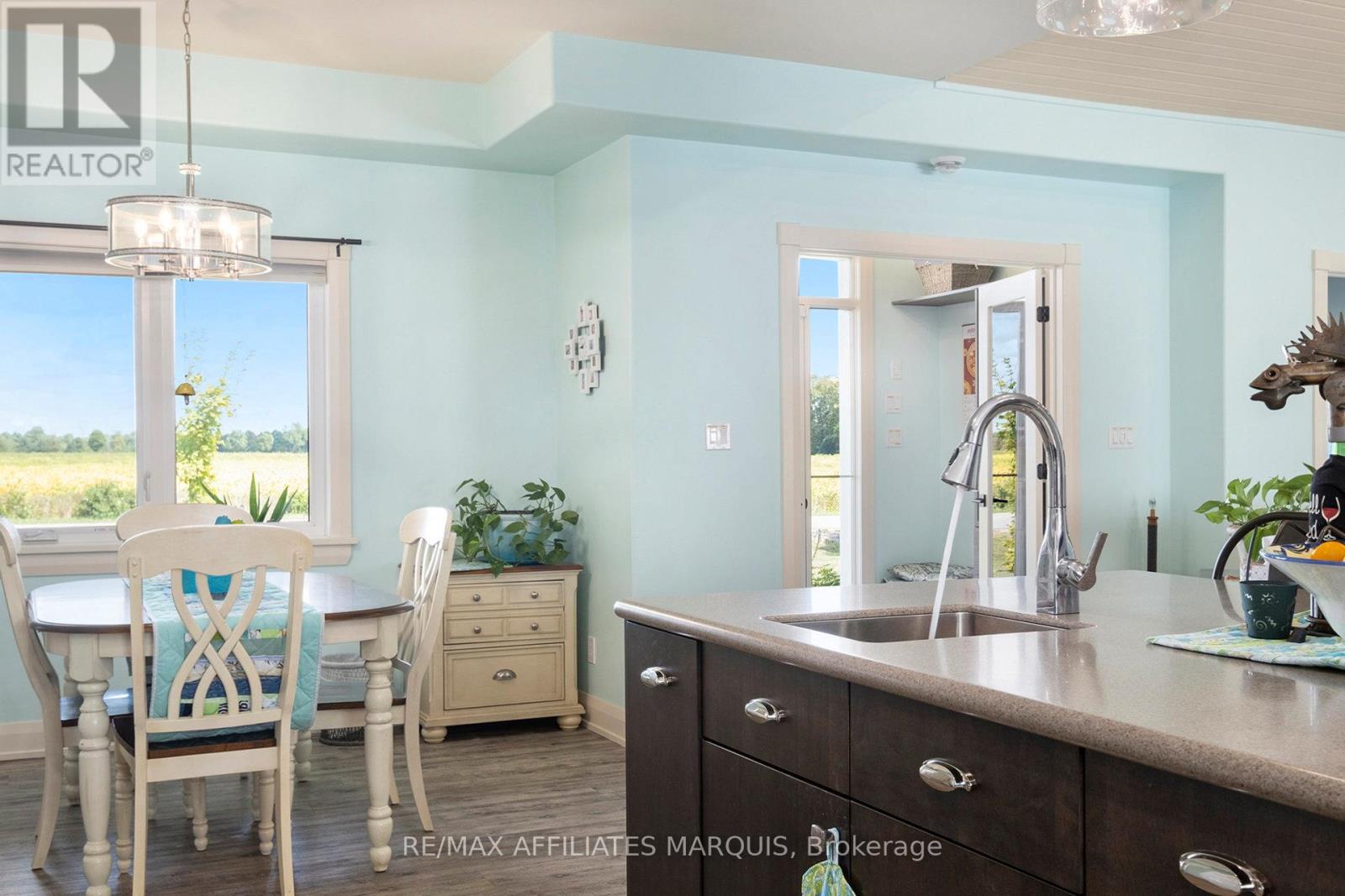 Welcome home to this 5 year old energy efficient slab on grade 1796 sq ft home on a 1 acre landscaped lot. Most everything a family needs is here. Radiant in-floor heating plus heat pumps for additional heat and air conditioning, on-demand hot water boiler system, 9 ft ceilings, awesome sunroom to watch the sunsets and leads to covered deck with a piped in propane BBQ. The gourmet kitchen with Corian counter tops and breakfast bar is a delight for the house chef. There are 3 bedrooms, 2 full baths, an office, 2 single attached garages, 2 garden sheds 14X20 and14X12, and for those hot summer days an above ground pool. All house appliances are included. This home is ready for its new family or semiretired couple. Garden area and beautiful flower gardens. Located on the edge of Elgin. Just 40 mins from Brockville, Kingston, and Smiths Falls. Well worth a look. Note the home has been re-painted inside since the video tour was taken. (id:64974)