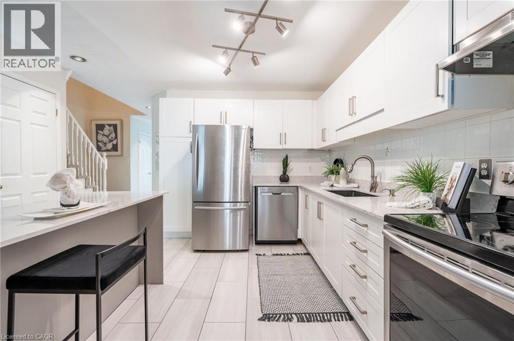 Charming End Unit Townhouse with Stylish Updates! Welcome to this beautifully maintained end unit townhouse, condo fees include lots of maintenance items, as well as water, Cable TV and high speed internet! From the moment you drive up you can see how well cared for it is, the entrance steps recently done with aggregate concrete. Step inside and you will find new flooring leading up to the newer kitchen with modern cabinetry and new sleek stone countertops. Includes all stainless steel appliances, fridge, stove and b/i dishwasher. Open kitchen to the living room area that has gorgeous oak hardwood floors and features a sleek electric fireplace. Interior entrance from attached garage. As you go up the stairs you will find new carpet on the stairs, fresh paint throughout the home, and all new laminate flooring on the second level. Large master with walk-in closets and newly renovated master ensuite bath featuring oversized walk-in shower. All new light fixtures in the bedrooms. In the basement you will find a nice space for a rec room with a cozy gas fireplace and an additional room that can be used as office space, den or even 4th bedroom. With a fully fenced backyard you can enjoy privacy when you relax outside. Come check out this 3 bed, 3 bath decked out townhouse, all you have to do is move-in! Perfect location for young families or downsizers providing a quiet space and convenience with lots of amenities nearby. Limeridge mall and LINC highway are just a 5 minute drive. (id:64974)