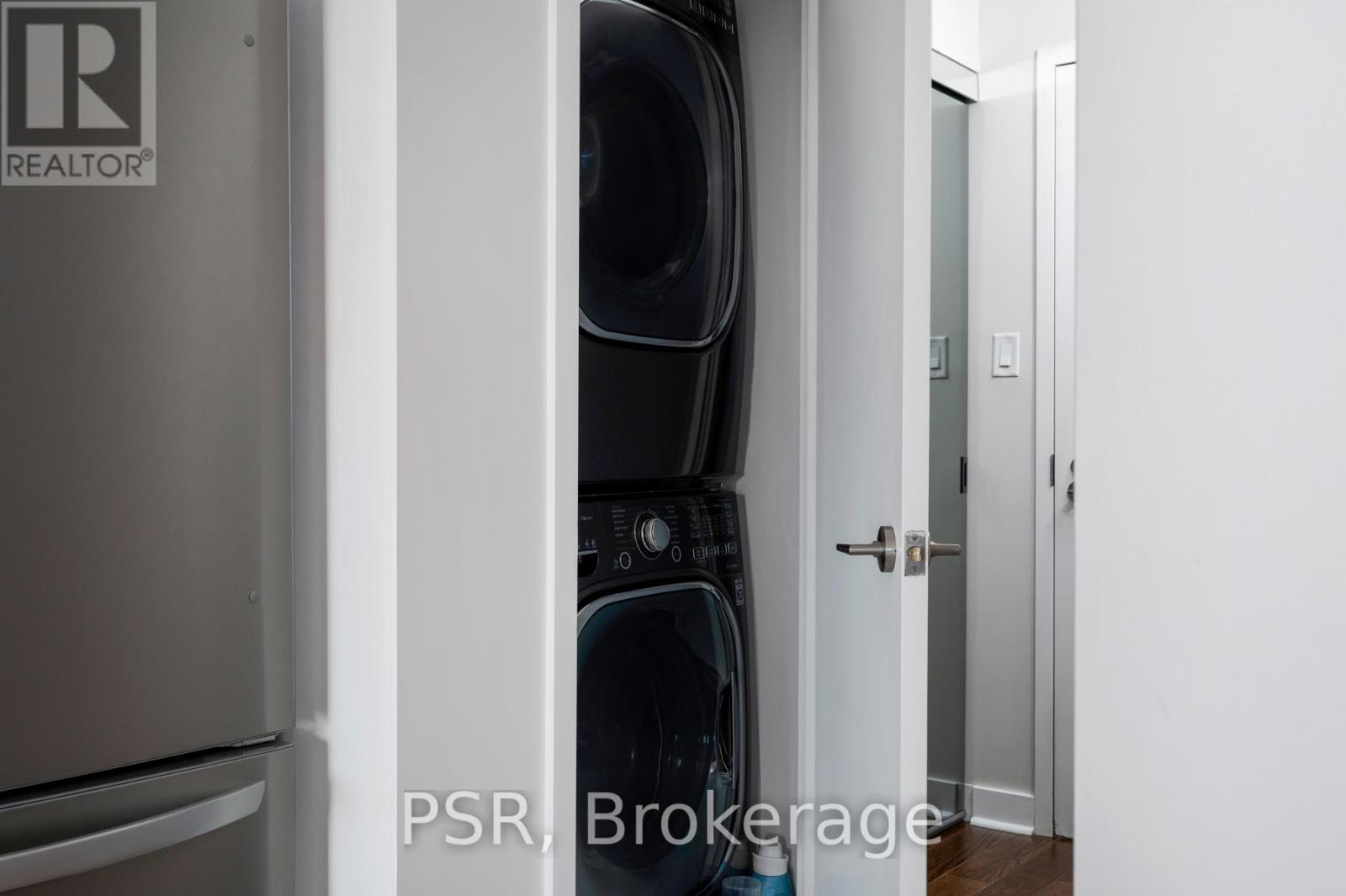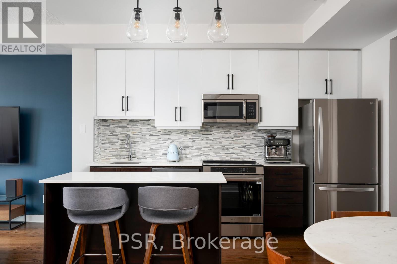 Turn-key and thoughtfully designed, this west-facing 1-bedroom offers a smart, efficient layout with no wasted space and distinct areas for living, dining and everyday life. Dark flooring grounds the space, while the kitchen pairs white counters and upper cabinetry with contrasting base cupboards for a clean, modern look. A large island, upgraded stainless steel appliances, mosaic tile backsplash and generous storage make the kitchen as functional as it is polished, flowing naturally into proper dining and living areas rarely found in a one bedroom layout. Floor-to-ceiling windows bring in afternoon light and open to a west-facing balcony. The bedroom is well-proportioned and includes a walk-in closet, while in-suite laundry and thoughtful finishes throughout add to the suite's refined, move-in-ready feel. The building is currently undergoing a full renovation of its common areas, with renderings in the listing photos showcasing the updated design and the rare combination of a like-new feel and the space and functionality of an established condo. Set at Queen and Gladstone, this is a low - maintenance home with style, substance and everyday practicality in one of Toronto's most established west-end pockets. (id:64974)