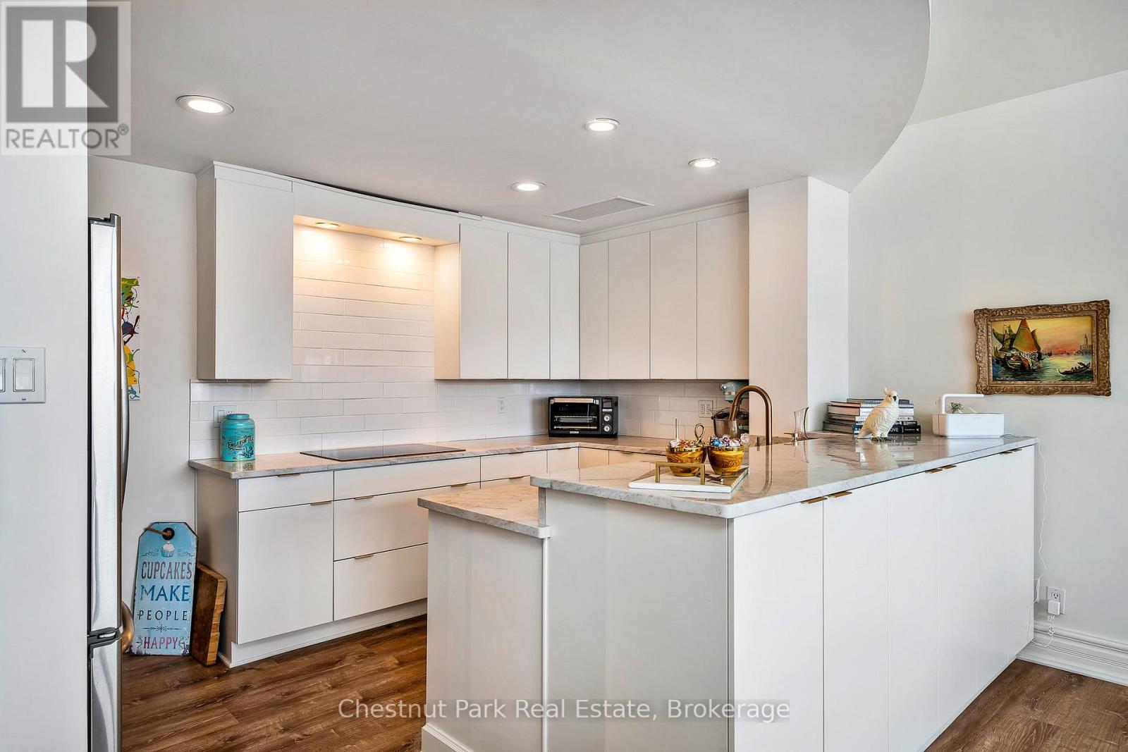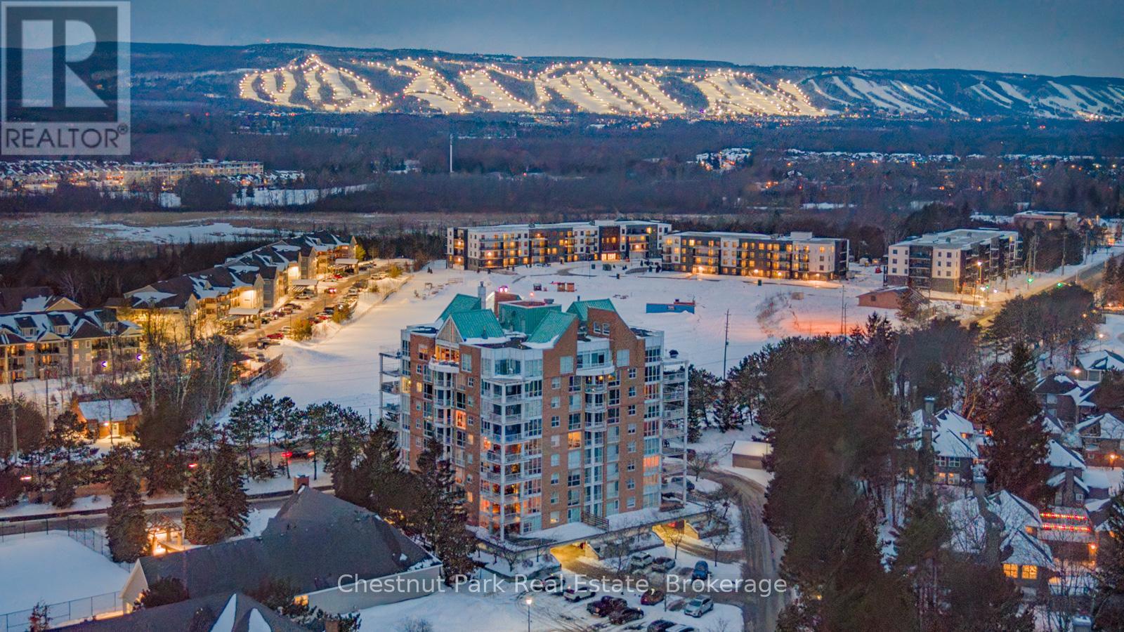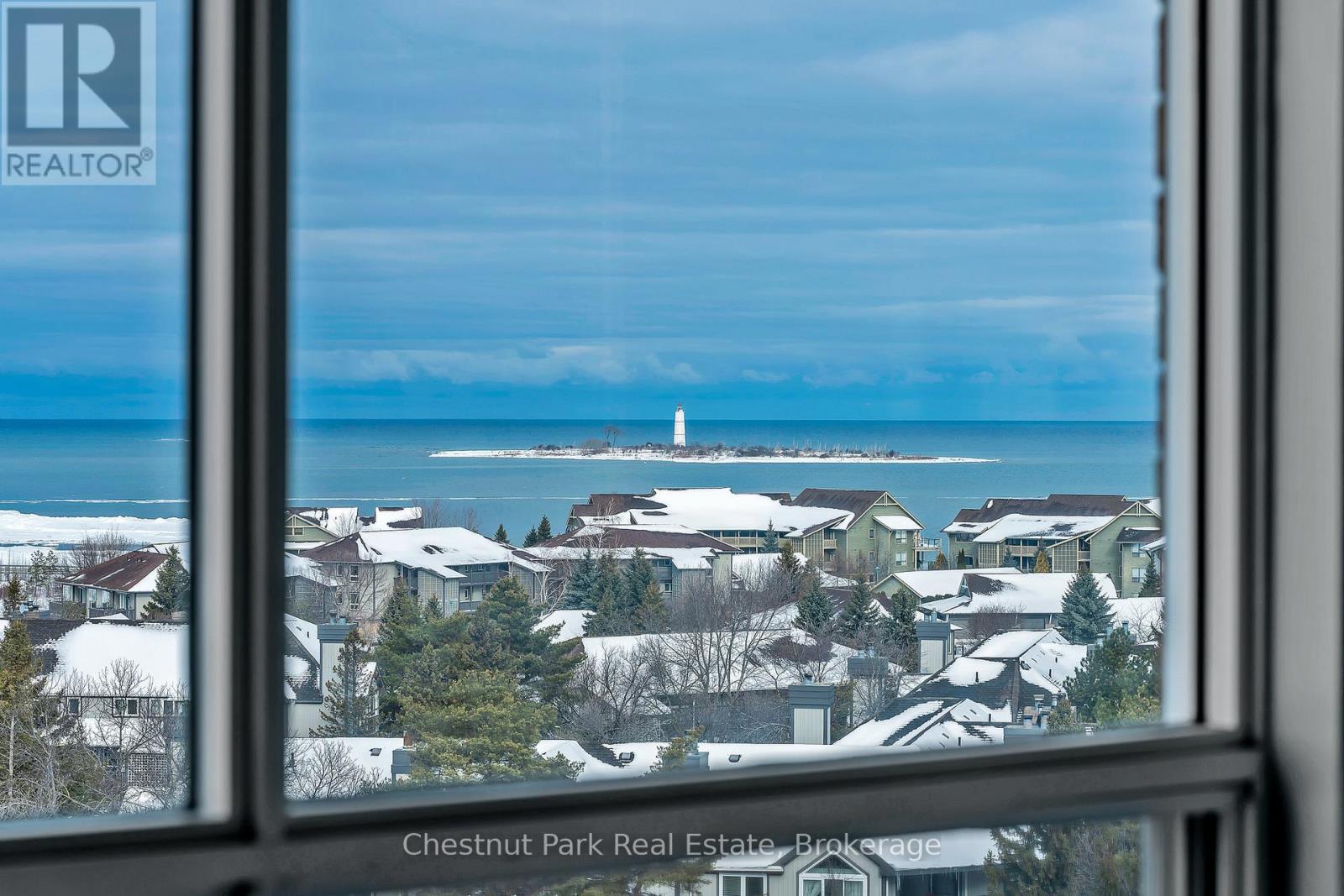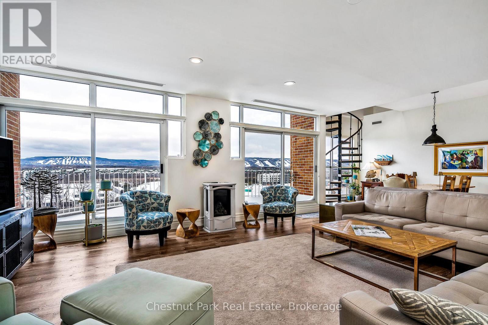 Experience premier penthouse living at its finest in this breathtaking 1894 sq.ft. condo offering panoramic views of the Escarpment, ski hills and the iconic Lighthouse Island. This is the tallest penthouse in this Southern Georgian Bay area - a home that truly makes a statement. Two deeded, covered parking spaces with inside entry to the building provide convenience during the rain or winter months. Here, the value of your monthly maintenance fees lies in what you gain. Water, cable, high-speed internet and premium amenities are all included, saving you thousands annually on outside services you'd pay for separately. Forget monthly gym memberships, court fees, or driving in town for recreation - everything is right here. Enjoy the marina, indoor pool, sauna, tennis, pickleball, squash, fitness centre plus social lounges and more. This is a home designed for those who value comfort and a worry-free lifestyle. Every season brings a new masterpiece outside your window; snow covered ski hills glowing at night, the fiery colors of autumn across the escarpment, and the shimmering blues of summer water. Inside the penthouse is just as impressive as the views. Floor-to-ceiling windows in the living room and bedrooms flood the space with natural light and frame the changing scenery like works of art. The open-concept kitchen, dining and living areas are perfect for entertaining, complete with a Napoleon gas fireplace and seamless access to one of two spacious decks. The primary suite feels like a retreat of its own, offering a private deck, gas fireplace in the office/sitting area, a spacious walk-in closet, and a beautifully updated 3 pc ensuite. The guest bedroom captures the western sunsets while a versatile loft space, reached by a circular staircase off the dining room is ideal as a home office, yoga studio or quiet hideaway. This is a rare opportunity to own a home that simplifies life, while offering the best of Collingwood living. (id:64974)