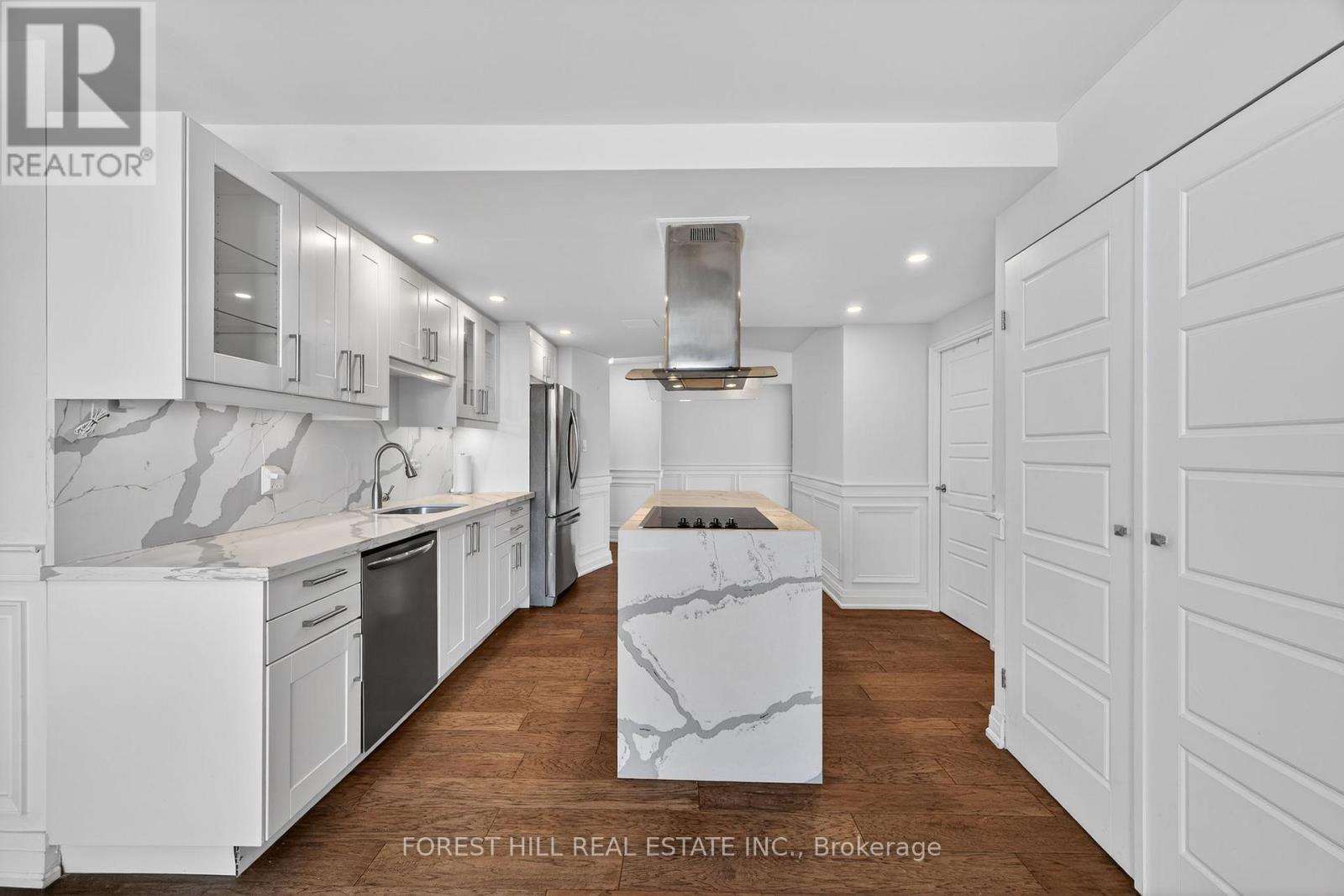 Experience modern living in this FULLY RENOVATED bright, open-concept corner unit. Featuring high-end finishes and functional upgrades, this suite offers a seamless blend of style and value. The renovated kitchen features stainless steel appliances, a large centre island, and a massive, over 130 sqft eat-in area with a walk-out to the balcony where you can enjoy unobstructed South-West views. This suite features modern flooring, pot lights, and a beautiful accent wall in the living room. Added bonus of a spacious sun-filled enclosed den that can easily be used as an office. Enjoy the convenience of an oversized storage room right inside your unit. Low maintenance fees which include all utilities and cable and internet! Enjoy fantastic amenities like an outdoor pool, tennis court, gym, sauna, 24 hour gatehouse and party room. EXRA-WIDE parking oversized parking spot right by entrance. This building is perfectly situated near major transit, schools, grocery shopping and places of worship. This is truly a turnkey suite you can be proud to call your home. (id:64974)