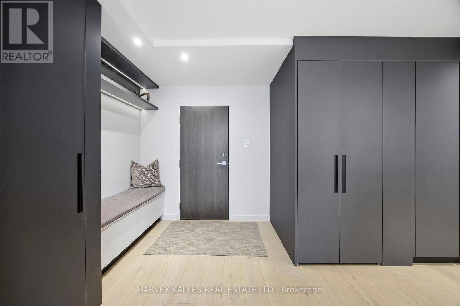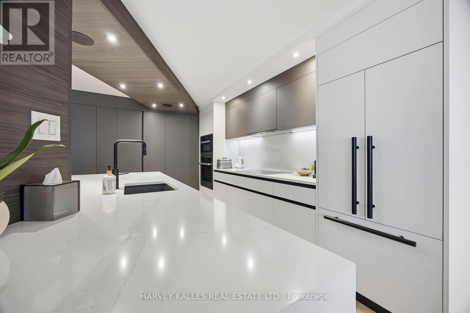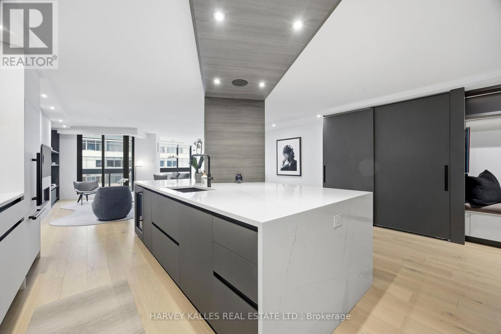 This stunning condominium has been renovated from the studs up with no expense spared. Italian hardwood floors run throughout, complemented by new windows and a sliding glass door opening to the balcony. An electric fireplace anchors the living space, while automated blinds enhance comfort and privacy throughout the home.The residence is exquisitely finished with custom Scavolini millwork, including a bespoke built-in bar with illuminated glass cabinetry, integrated shelving, closets, and fully designed Scavolini kitchen and bathrooms. Heated bathroom floors add an elevated touch of everyday luxury, while a full-length built-in mirror enhances the primary bedroom.The kitchen is equipped with premium appliances, including a Miele induction cooktop, dishwasher, wall oven, speed oven/microwave, and hood fan, alongside a Fisher & Paykel refrigerator and Marvel wine fridge. A full-size LG washer and dryer complete the functional spaces.Thoughtful details continue with a statement Bocci dining room light fixture, Somfy automatic blackout and screen blinds in both bedrooms, and automated blinds in the living and dining areas. Comfort and technology are seamlessly integrated with a new HVAC system controlled by an Ecobee thermostat and a built-in Sonos speaker system throughout the residence, including both bathrooms. (id:64974)