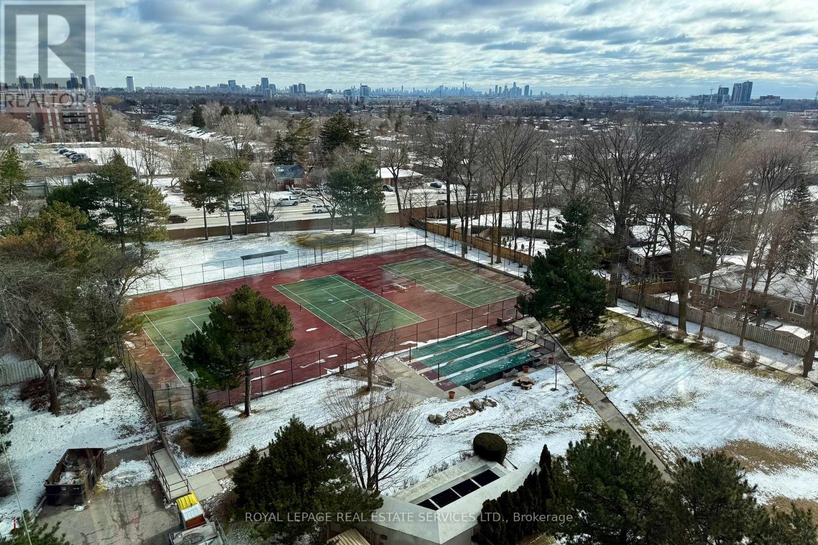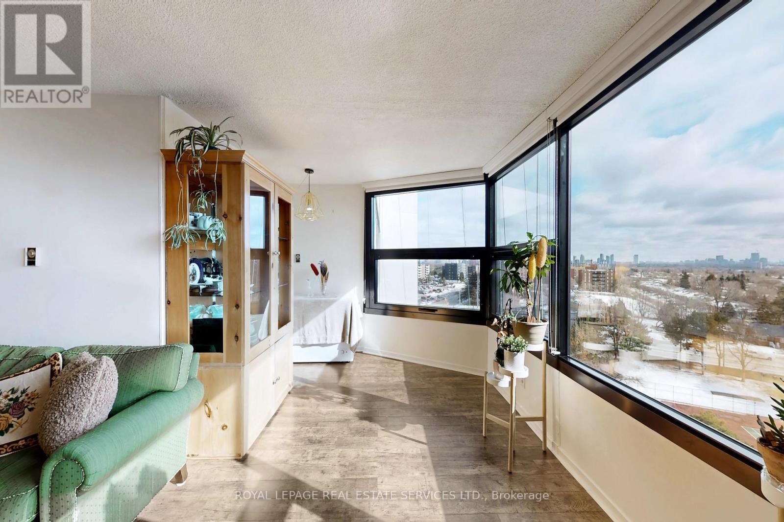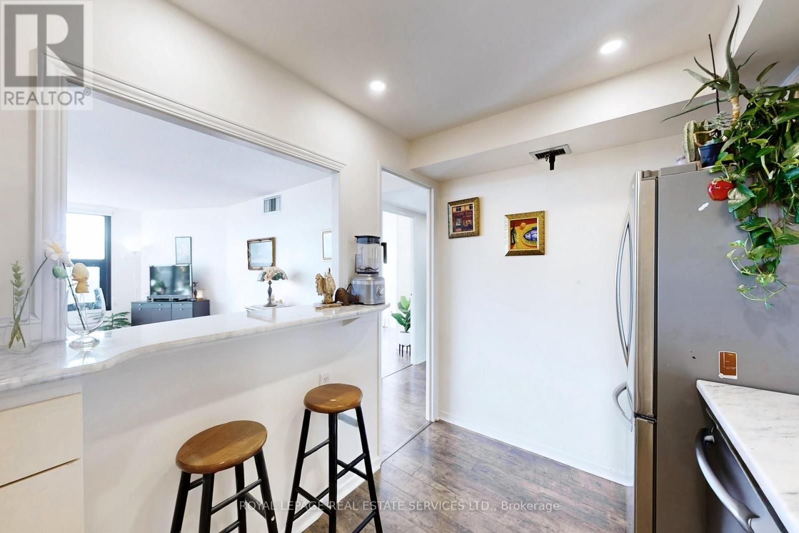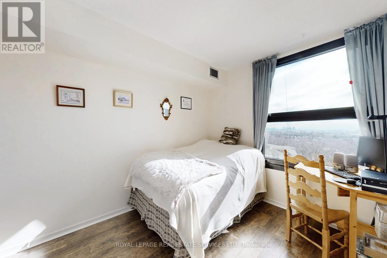 Welcome to your move-in ready, sun-drenched urban sanctuary featuring breathtaking panoramic views of the Toronto skyline. This turnkey, carpet-free home boasts premium laminate flooring throughout, providing a sleek and modern aesthetic that is as durable as it is stylish. The open-concept living area is designed for seamless entertaining and flows beautifully into the kitchen, which features a convenient breakfast bar for casual dining. While the updated washroom offers contemporary finishes, large windows in every other room flood the living spaces with natural light. Adding to the property's incredible value, this unit comes complete with one dedicated parking space and a storage locker. Experience ultimate peace of mind with an all-inclusive lifestyle, as the maintenance fees cover your heat, hydro, and water, along with unlimited Bell Fibe internet. Residents also enjoy an incredible suite of amenities including a 24-hour concierge, a rooftop deck, an indoor car wash with a car vacuum and tire inflator, a general convenience store, a pickleball court, shuffleboard, a billiard room, and even a woodworking shop. Whether you are watching the city lights at night or enjoying the airy flow of the interior during the day, this unit offers the perfect blend of sophisticated design and effortless convenience in the heart of the city. (id:64974)