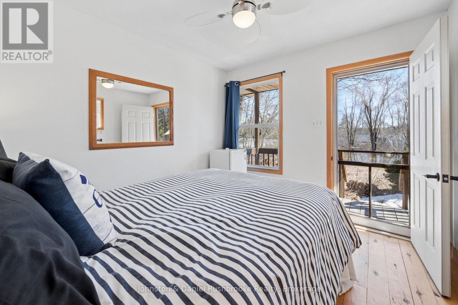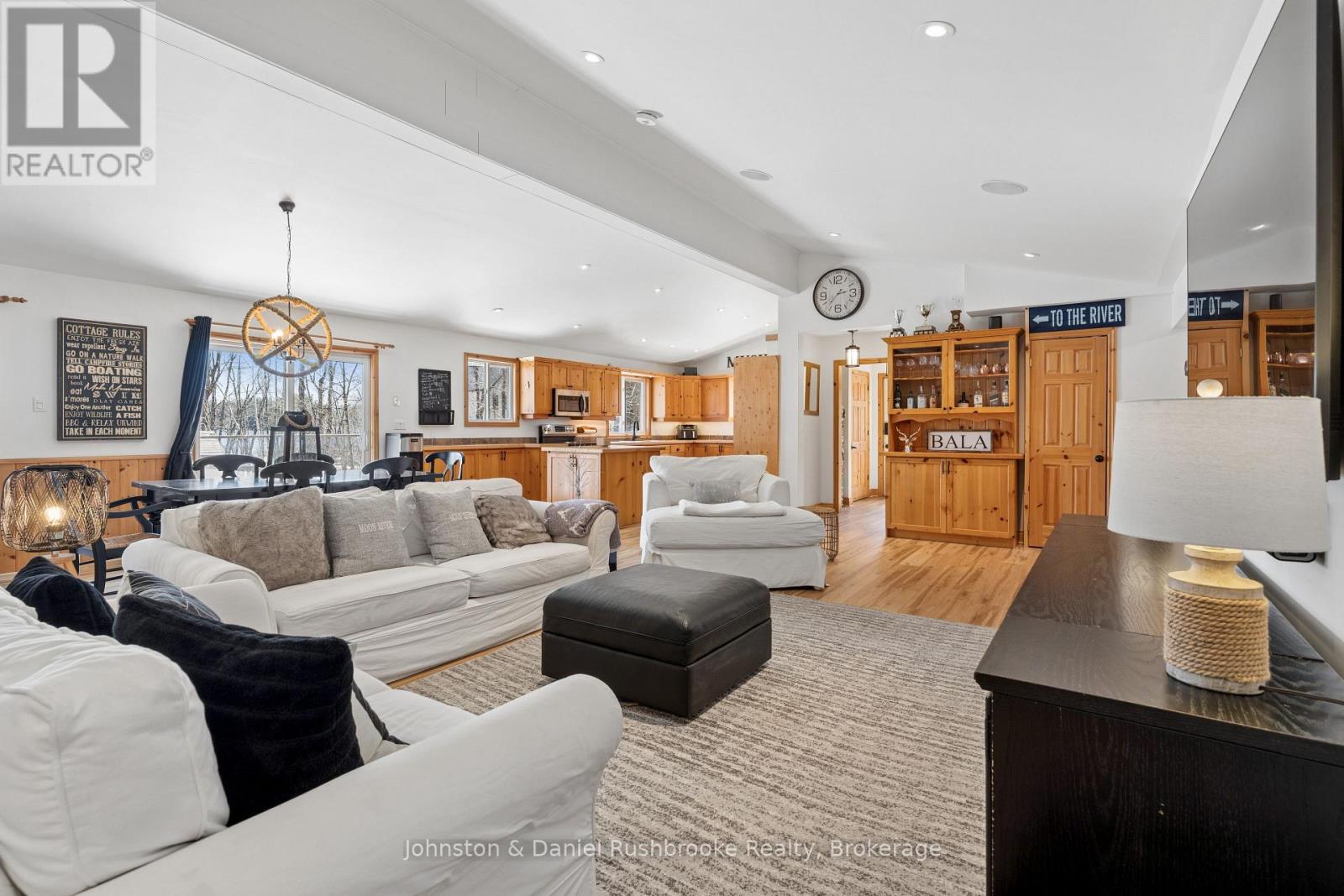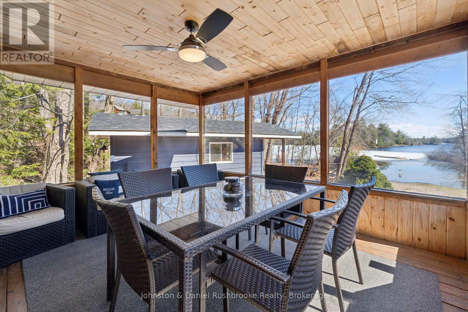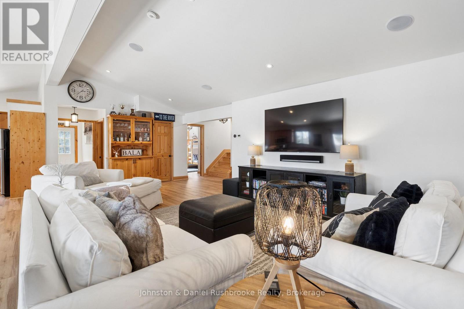 This beautiful four-season retreat occupies a coveted stretch of shoreline on the wide-open waters of Echo Bay on Moon River, a location ideal for tubing, water skiing, and wakeboarding. The level, family-friendly property provides 135' of southeast-facing waterfront, where a natural, hard-packed sandy beach offers a gentle entry for children and deeper water off the dock invites paddling, boating and swimming. Designed for relaxed cottage living, the two-storey interior revolves around an open-concept kitchen, dining, and living area. Creamy white walls, light floors, pine accents, and a centre piece propane fireplace create a warm atmosphere for entertaining. The river-facing deck extends the living space for morning coffee and barbecues, while the screened Muskoka Room remains the preferred sanctuary for sharing stories on hot summer evenings. With 4 bedrooms, a den, and 2 full bathrooms, including a private second-floor primary bedroom with a 4-piece ensuite, the layout comfortably accommodates family and friends. An alcove on the second floor with an office provides a quiet workspace next to the den. The separate bunkie with its own 3-piece bathroom is a welcome retreat for teens or guests. Outside, mature trees frame an open, level grassy areas that provide a spacious playground for children. The Moon River flows for approximately 25 km from Lake Muskoka in Bala, through a series of portages, before eventually reaching Georgian Bay. This storied waterway is lined with Precambrian rock shelves and dramatic cliffs, offering endless opportunities for hiking and paddleboarding. This quiet escape feels tucked away, yet it is located only minutes from the heart of Bala's trendy restaurants and shops, by boat or car, and a short 15-minute drive to the hub of Port Carling and premier Muskoka golf courses. Positioned roughly 1 hr 45 min from the GTA, this cherished family cottage is ready for you to enjoy this season. (id:64974)