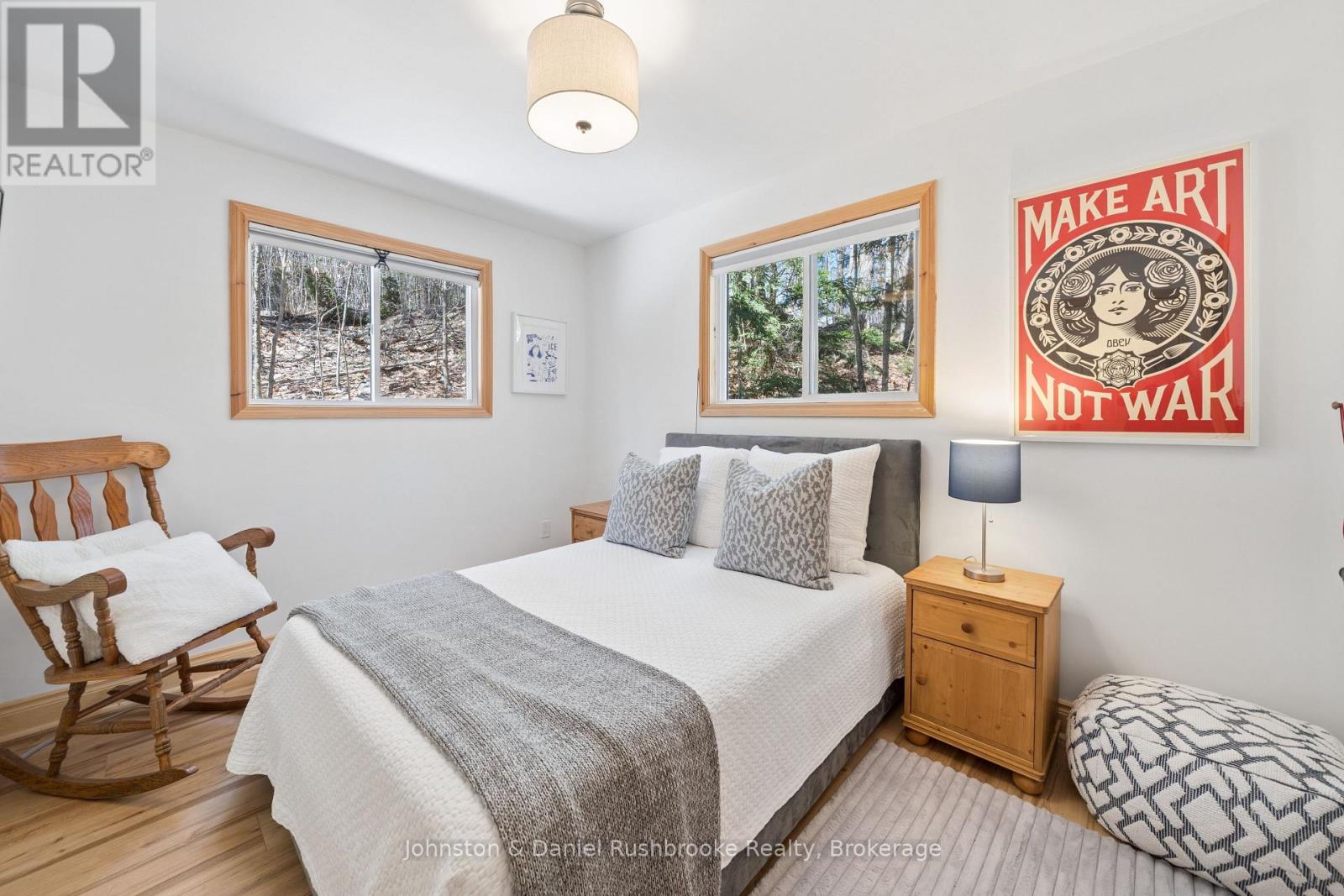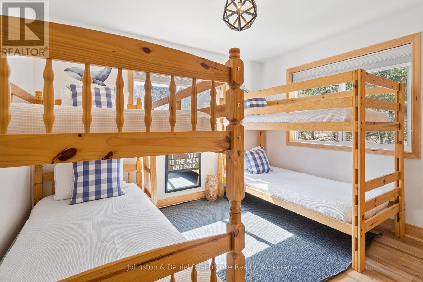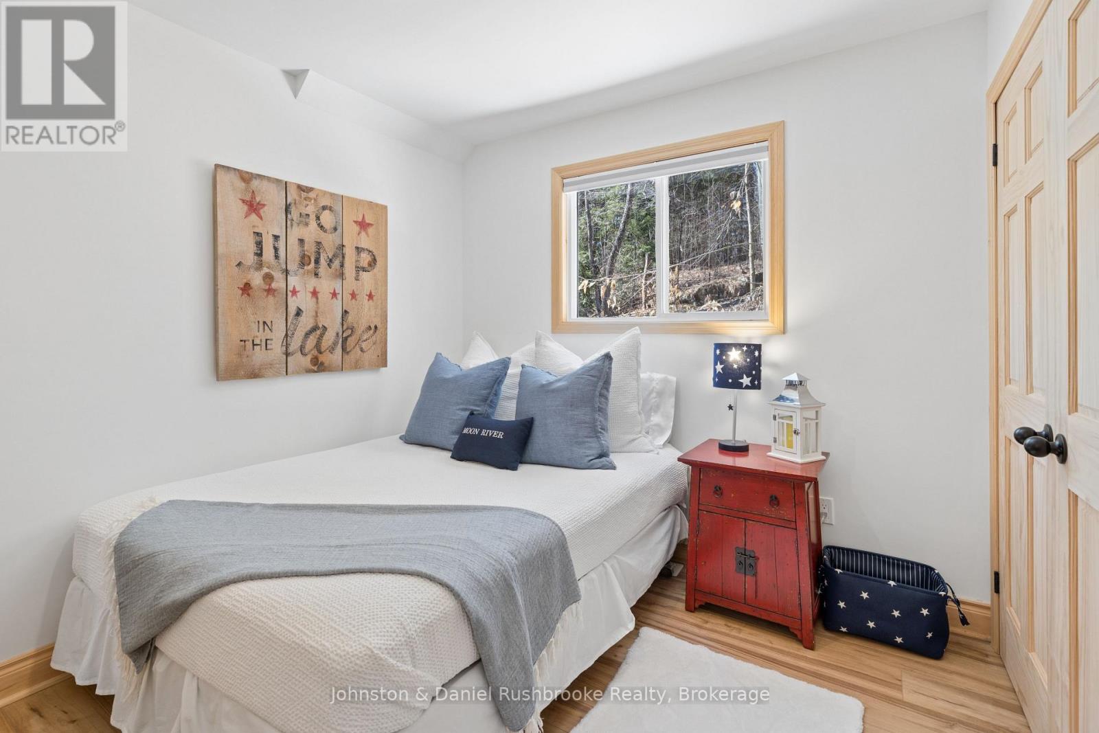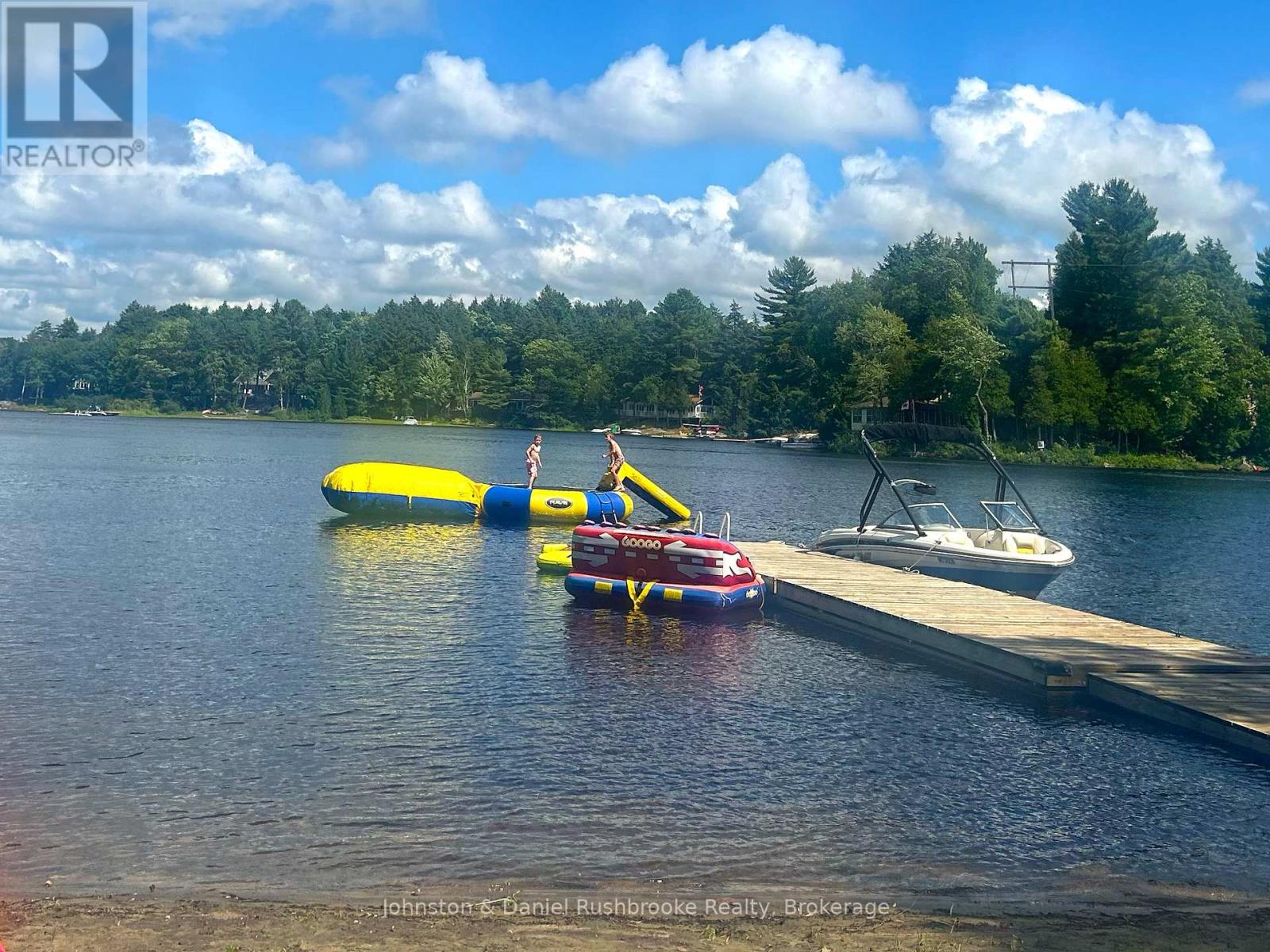 This beautiful four-season retreat occupies a coveted stretch of shoreline on the wide-open waters of Echo Bay on Moon River, a location ideal for tubing, water skiing, and wakeboarding. The level, family-friendly property provides 135' of southeast-facing waterfront, where a natural, hard-packed sandy beach offers a gentle entry for children and deeper water off the dock invites paddling, boating and swimming. Designed for relaxed cottage living, the two-storey interior revolves around an open-concept kitchen, dining, and living area. Creamy white walls, light floors, pine accents, and a centre piece propane fireplace create a warm atmosphere for entertaining. The river-facing deck extends the living space for morning coffee and barbecues, while the screened Muskoka Room remains the preferred sanctuary for sharing stories on hot summer evenings. With 4 bedrooms, a den, and 2 full bathrooms, including a private second-floor primary bedroom with a 4-piece ensuite, the layout comfortably accommodates family and friends. An alcove on the second floor with an office provides a quiet workspace next to the den. The separate bunkie with its own 3-piece bathroom is a welcome retreat for teens or guests. Outside, mature trees frame an open, level grassy areas that provide a spacious playground for children. The Moon River flows for approximately 25 km from Lake Muskoka in Bala, through a series of portages, before eventually reaching Georgian Bay. This storied waterway is lined with Precambrian rock shelves and dramatic cliffs, offering endless opportunities for hiking and paddleboarding. This quiet escape feels tucked away, yet it is located only minutes from the heart of Bala's trendy restaurants and shops, by boat or car, and a short 15-minute drive to the hub of Port Carling and premier Muskoka golf courses. Positioned roughly 1 hr 45 min from the GTA, this cherished family cottage is ready for you to enjoy this season. (id:64974)