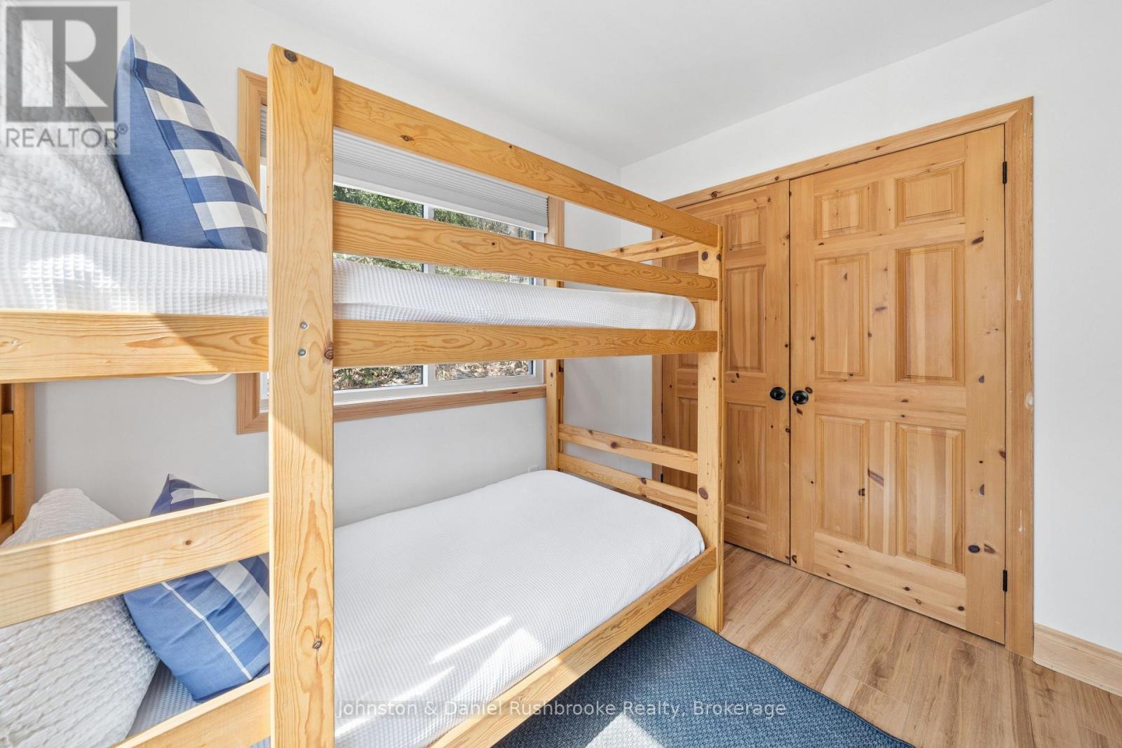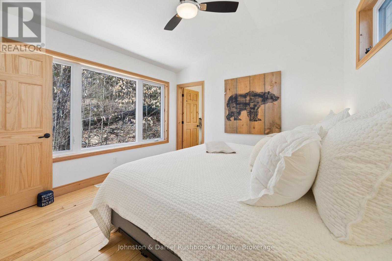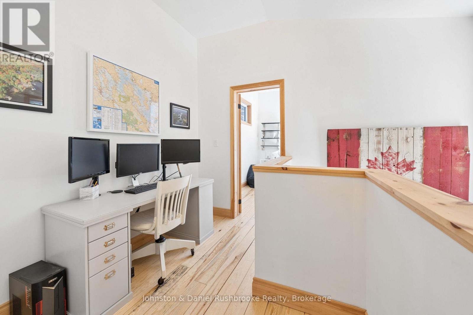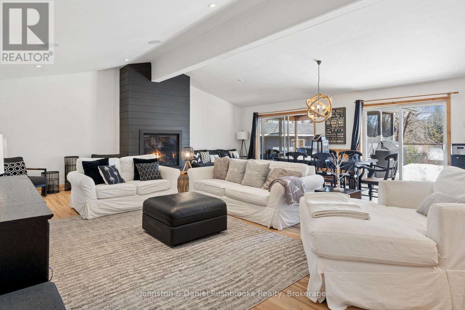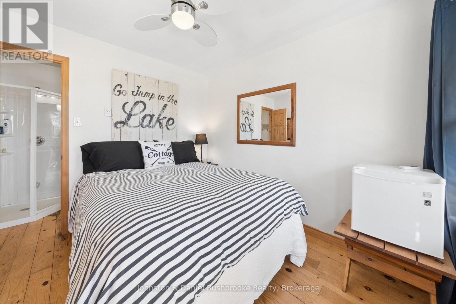This beautiful four-season retreat occupies a coveted stretch of shoreline on the wide-open waters of Echo Bay on Moon River, a location ideal for tubing, water skiing, and wakeboarding. The level, family-friendly property provides 135' of southeast-facing waterfront, where a natural, hard-packed sandy beach offers a gentle entry for children and deeper water off the dock invites paddling, boating and swimming. Designed for relaxed cottage living, the two-storey interior revolves around an open-concept kitchen, dining, and living area. Creamy white walls, light floors, pine accents, and a centre piece propane fireplace create a warm atmosphere for entertaining. The river-facing deck extends the living space for morning coffee and barbecues, while the screened Muskoka Room remains the preferred sanctuary for sharing stories on hot summer evenings. With 4 bedrooms, a den, and 2 full bathrooms, including a private second-floor primary bedroom with a 4-piece ensuite, the layout comfortably accommodates family and friends. An alcove on the second floor with an office provides a quiet workspace next to the den. The separate bunkie with its own 3-piece bathroom is a welcome retreat for teens or guests. Outside, mature trees frame an open, level grassy areas that provide a spacious playground for children. The Moon River flows for approximately 25 km from Lake Muskoka in Bala, through a series of portages, before eventually reaching Georgian Bay. This storied waterway is lined with Precambrian rock shelves and dramatic cliffs, offering endless opportunities for hiking and paddleboarding. This quiet escape feels tucked away, yet it is located only minutes from the heart of Bala's trendy restaurants and shops, by boat or car, and a short 15-minute drive to the hub of Port Carling and premier Muskoka golf courses. Positioned roughly 1 hr 45 min from the GTA, this cherished family cottage is ready for you to enjoy this season. (id:64974)