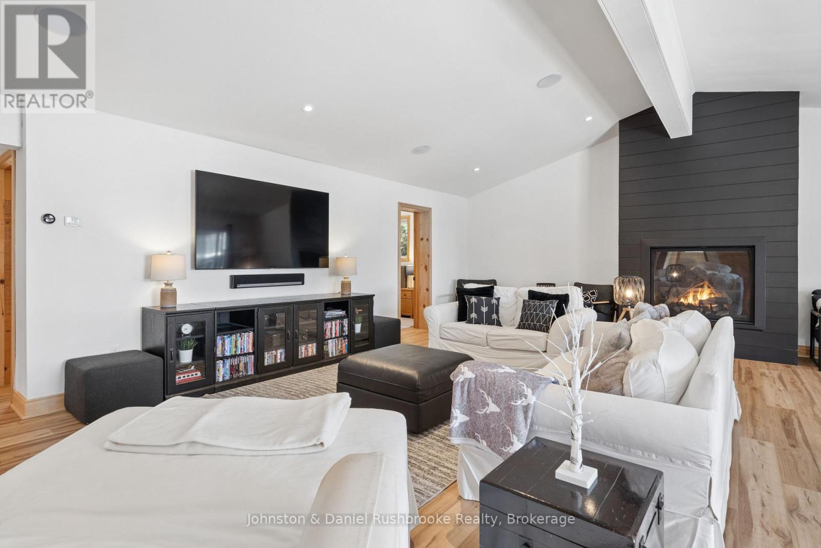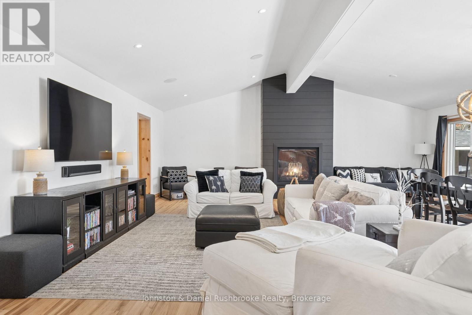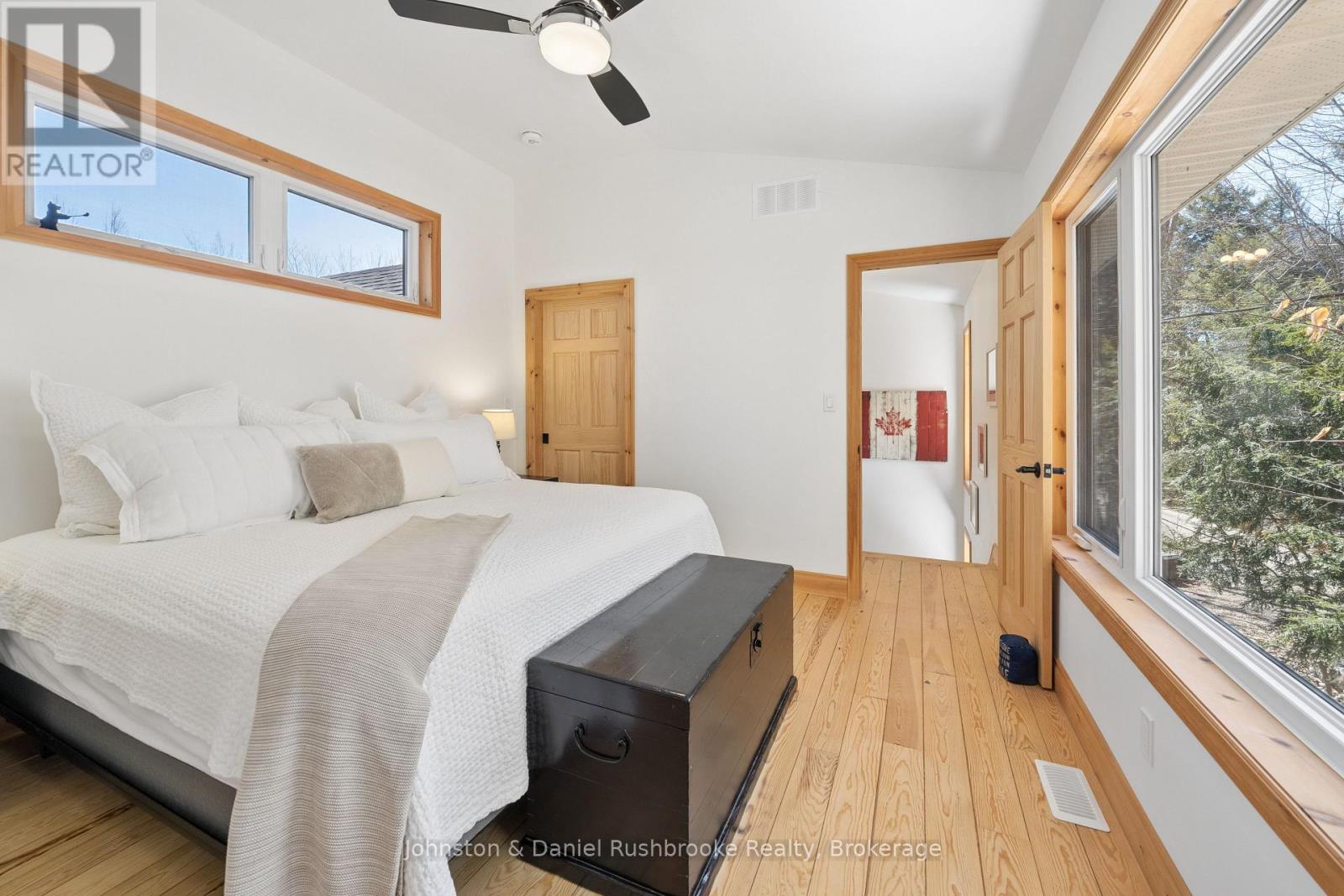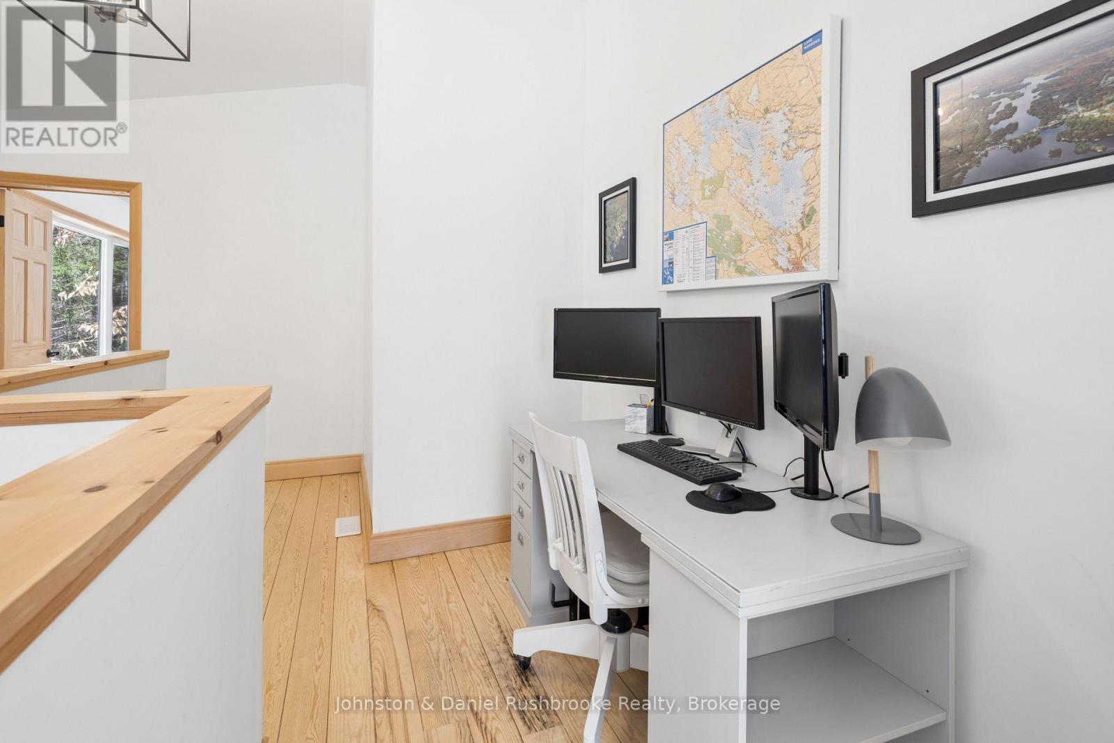 This beautiful four-season retreat occupies a coveted stretch of shoreline on the wide-open waters of Echo Bay on Moon River, a location ideal for tubing, water skiing, and wakeboarding. The level, family-friendly property provides 135' of southeast-facing waterfront, where a natural, hard-packed sandy beach offers a gentle entry for children and deeper water off the dock invites paddling, boating and swimming. Designed for relaxed cottage living, the two-storey interior revolves around an open-concept kitchen, dining, and living area. Creamy white walls, light floors, pine accents, and a centre piece propane fireplace create a warm atmosphere for entertaining. The river-facing deck extends the living space for morning coffee and barbecues, while the screened Muskoka Room remains the preferred sanctuary for sharing stories on hot summer evenings. With 4 bedrooms, a den, and 2 full bathrooms, including a private second-floor primary bedroom with a 4-piece ensuite, the layout comfortably accommodates family and friends. An alcove on the second floor with an office provides a quiet workspace next to the den. The separate bunkie with its own 3-piece bathroom is a welcome retreat for teens or guests. Outside, mature trees frame an open, level grassy areas that provide a spacious playground for children. The Moon River flows for approximately 25 km from Lake Muskoka in Bala, through a series of portages, before eventually reaching Georgian Bay. This storied waterway is lined with Precambrian rock shelves and dramatic cliffs, offering endless opportunities for hiking and paddleboarding. This quiet escape feels tucked away, yet it is located only minutes from the heart of Bala's trendy restaurants and shops, by boat or car, and a short 15-minute drive to the hub of Port Carling and premier Muskoka golf courses. Positioned roughly 1 hr 45 min from the GTA, this cherished family cottage is ready for you to enjoy this season. (id:64974)