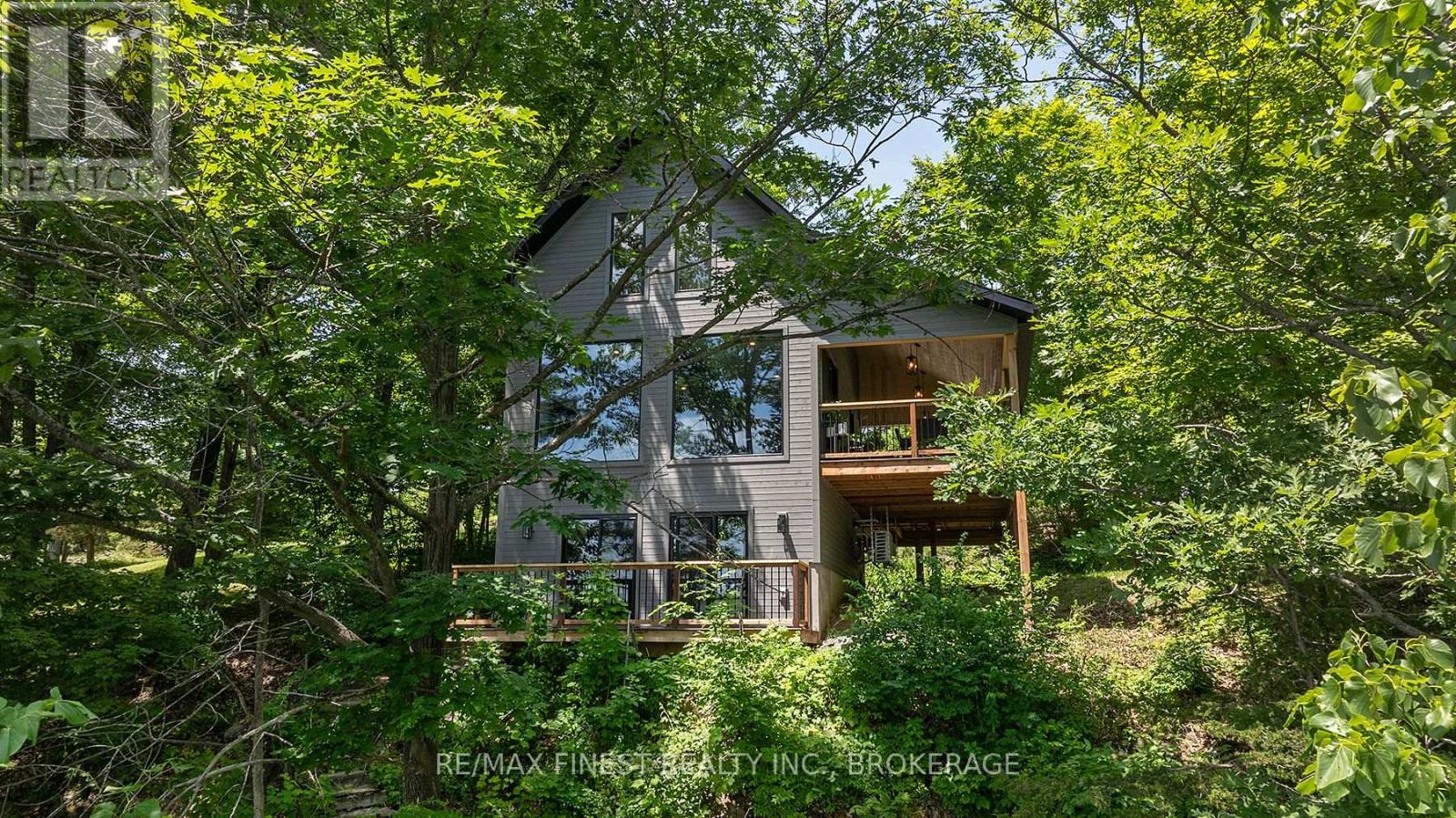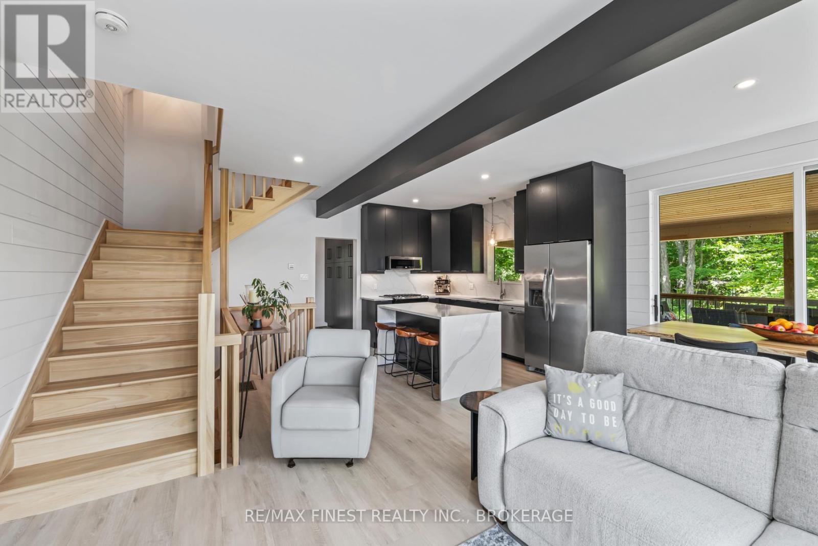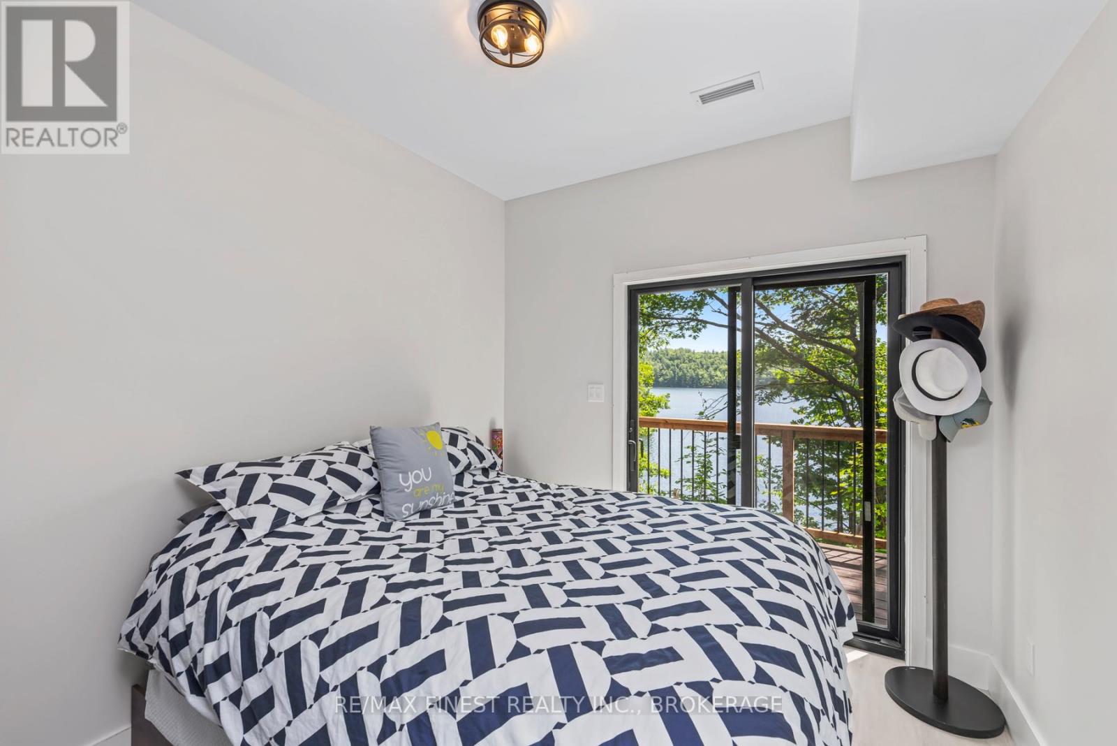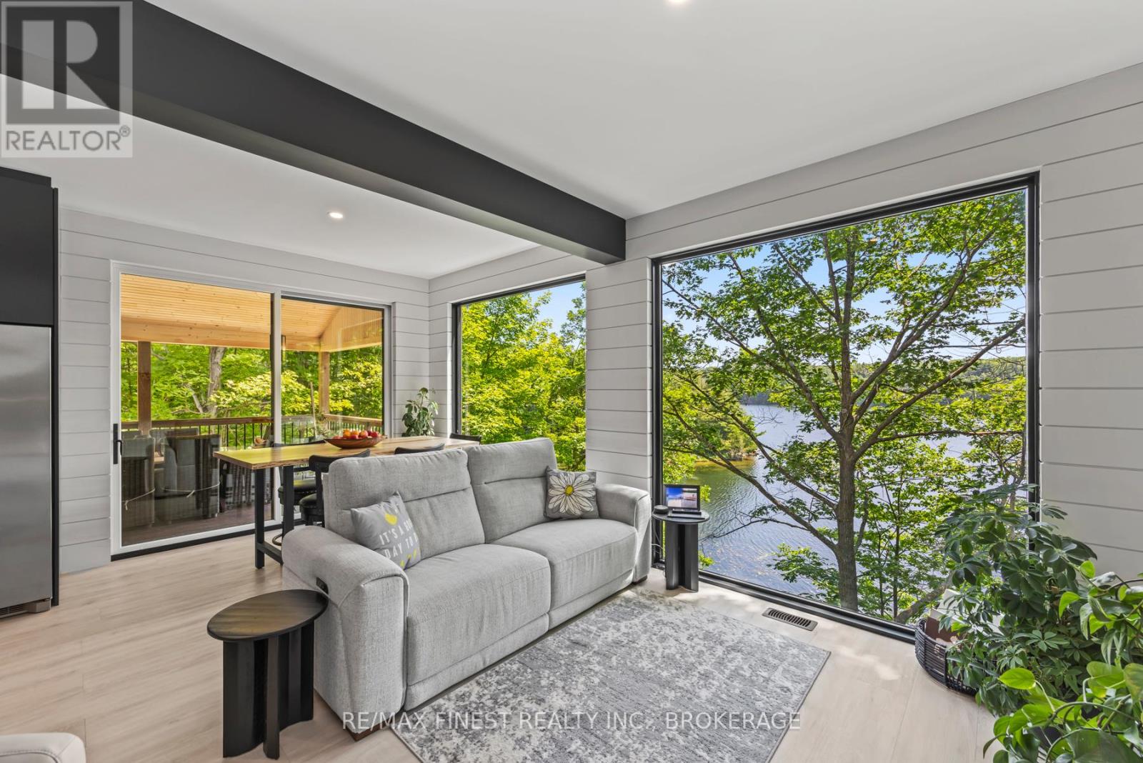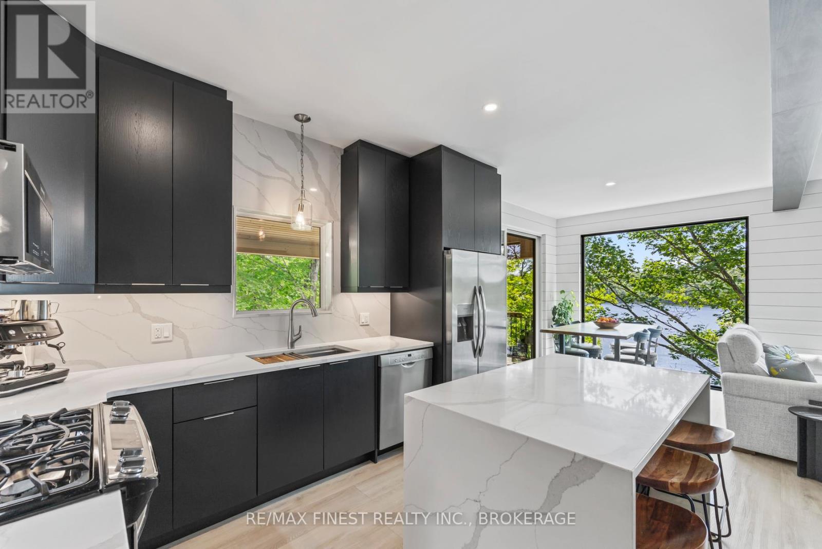 As you enter this immaculate waterfront year round home or cottage, you are welcomed by the stunning views of BuckLake through the massive floor to ceiling Living Room windows. This truly amazing 2 year old maibec wood sided home provides 1416 square feet of total living space, and is constructed to exacting standards with the highest quality materials. No expenses spared in this owner built home which features a bright Kitchen with Quartz counter tops and waterfall island, solid, painted, white oak cabinetry, and stainless steel appliances including a propane range below alow profile Microwave oven......and that view!! The bright and spacious Living/Dining area boasts 10 ft ceilings, luxury vinyl plank flooring throughout and walk out to a wonderfully inviting large covered deck with custom cut cedar ceiling and propane line for the BBQ. What a comfortable space to relax rain or shine! Take a walk up the solid poplar natural staircase to the loft area, and you'll find the Primary Bedroom with soaring cathedral ceilings, a spa-like 4pc Main Bathroom with its unique Slik free standing stone soaker tub and separate glass shower, and a small office area. A huge bonus is that the loft area has it's own heating/cooling system, separate from the levels below. The Basement features two Bedrooms, each with their own walkout to a deck overlooking the lake, a beautiful 4pc Bathroom and Laundry. This is truly a must see property! (id:64974)