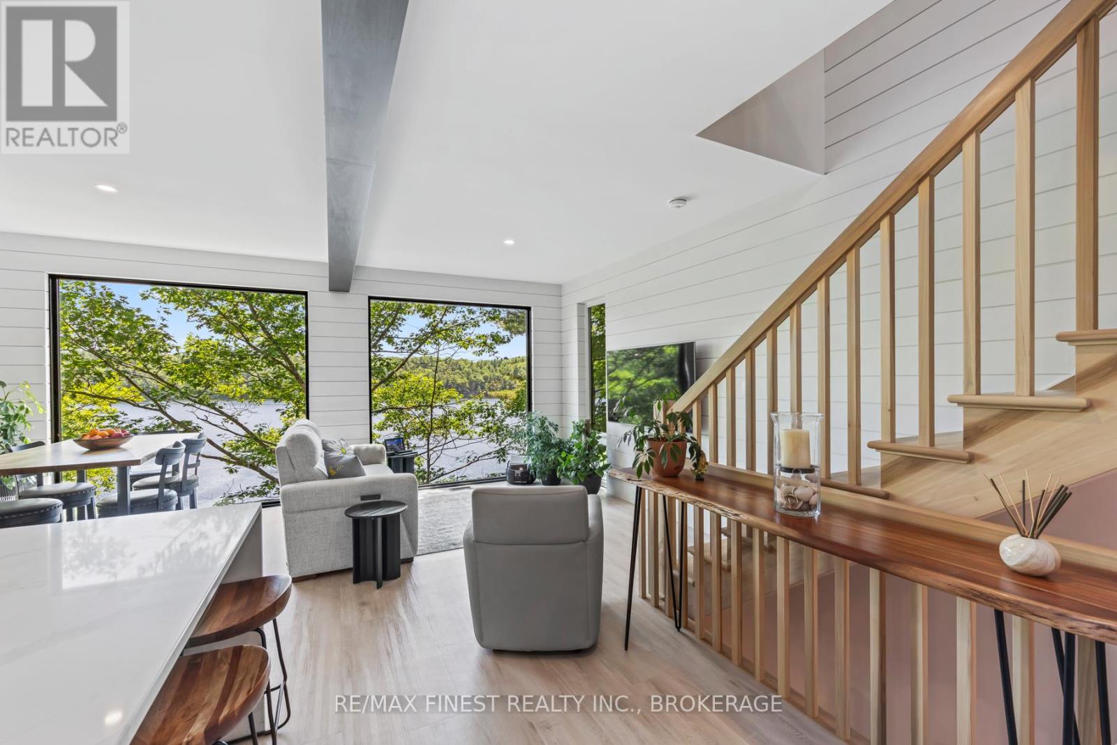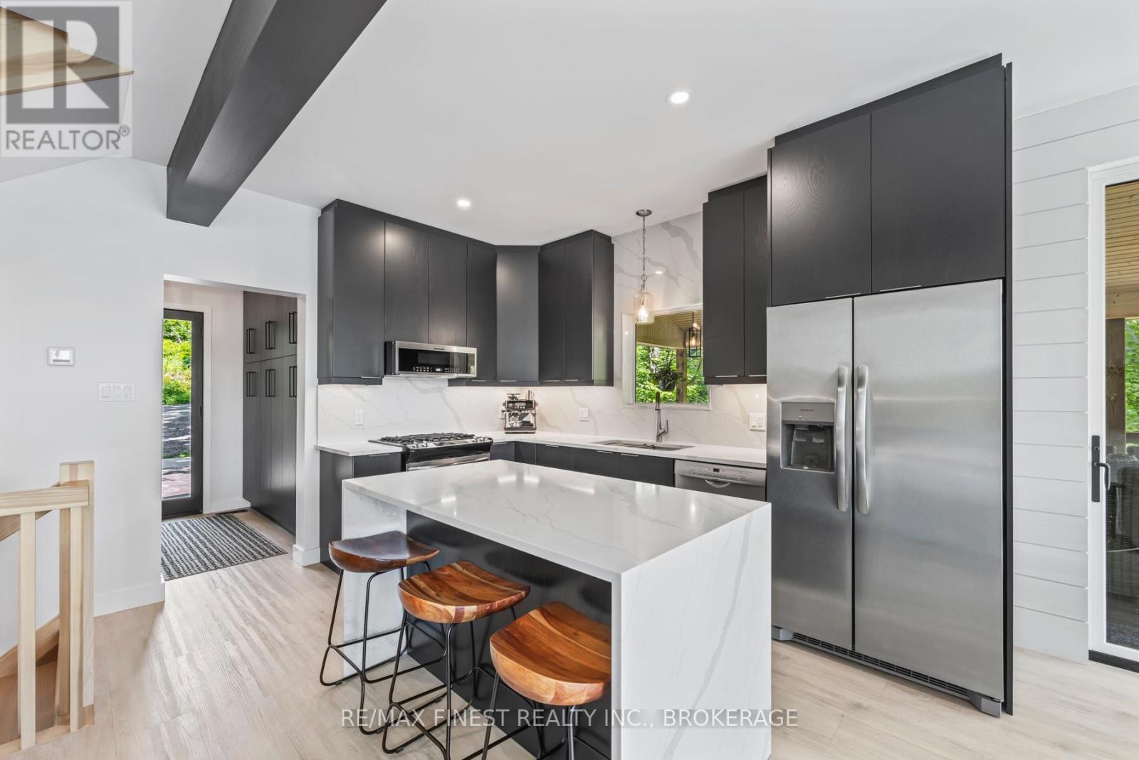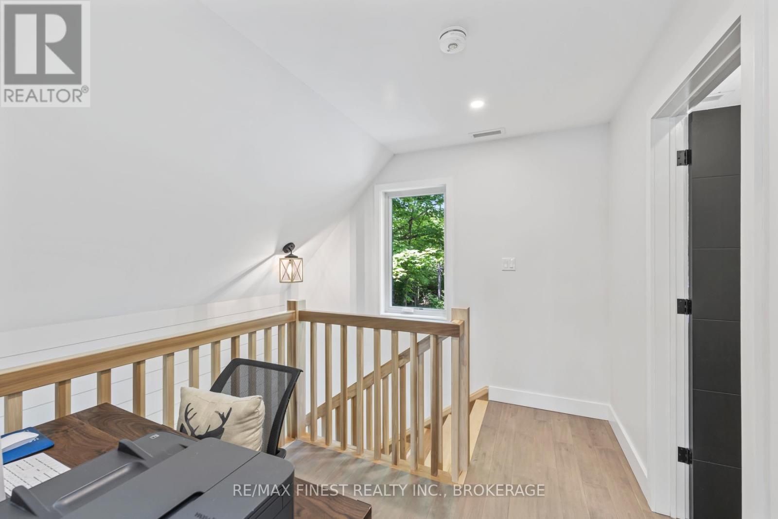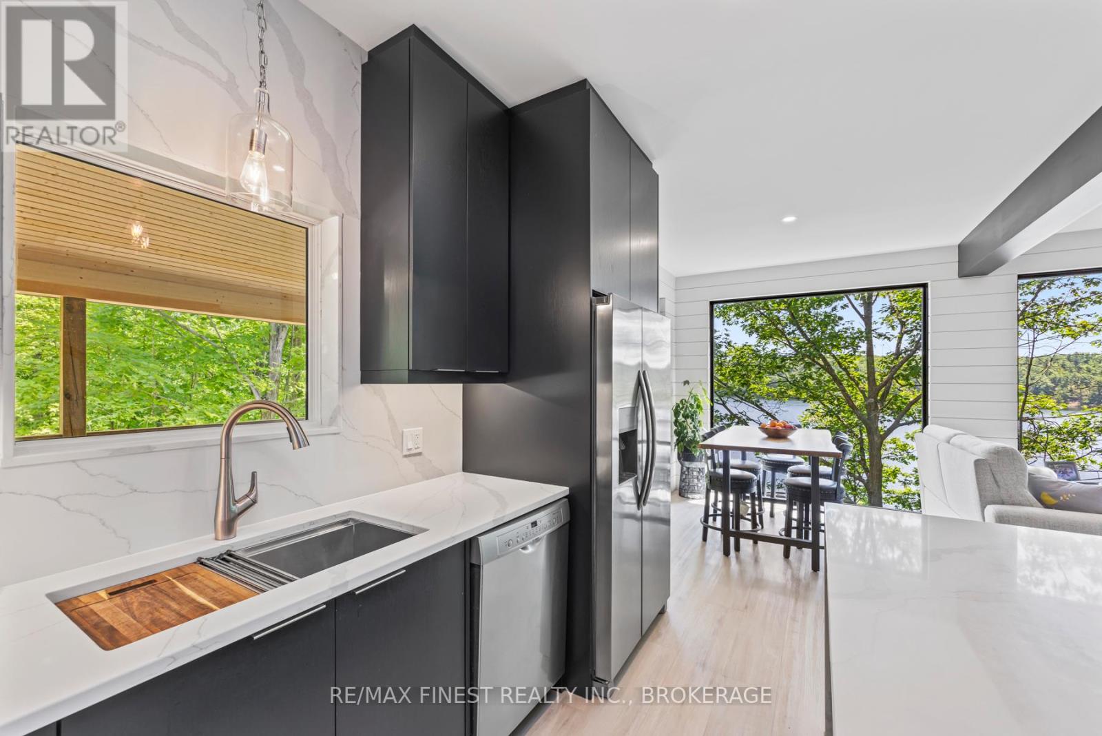As you enter this immaculate waterfront year round home or cottage, you are welcomed by the stunning views of BuckLake through the massive floor to ceiling Living Room windows. This truly amazing 2 year old maibec wood sided home provides 1416 square feet of total living space, and is constructed to exacting standards with the highest quality materials. No expenses spared in this owner built home which features a bright Kitchen with Quartz counter tops and waterfall island, solid, painted, white oak cabinetry, and stainless steel appliances including a propane range below alow profile Microwave oven......and that view!! The bright and spacious Living/Dining area boasts 10 ft ceilings, luxury vinyl plank flooring throughout and walk out to a wonderfully inviting large covered deck with custom cut cedar ceiling and propane line for the BBQ. What a comfortable space to relax rain or shine! Take a walk up the solid poplar natural staircase to the loft area, and you'll find the Primary Bedroom with soaring cathedral ceilings, a spa-like 4pc Main Bathroom with its unique Slik free standing stone soaker tub and separate glass shower, and a small office area. A huge bonus is that the loft area has it's own heating/cooling system, separate from the levels below. The Basement features two Bedrooms, each with their own walkout to a deck overlooking the lake, a beautiful 4pc Bathroom and Laundry. This is truly a must see property! (id:64974)