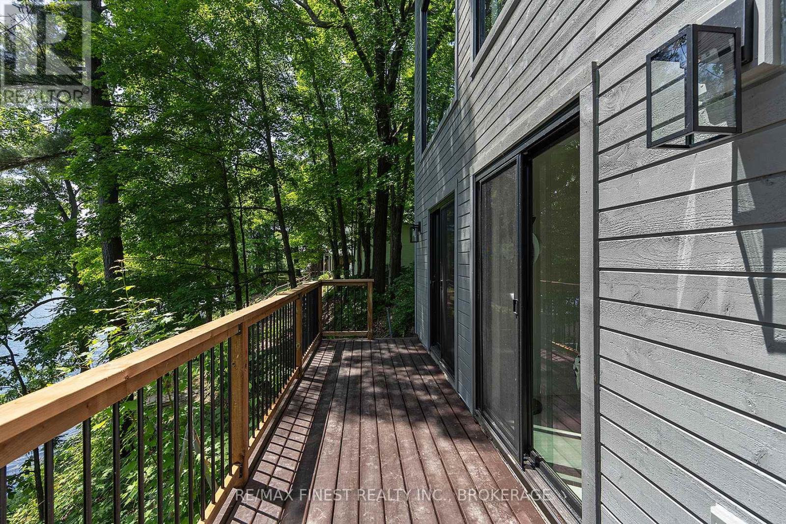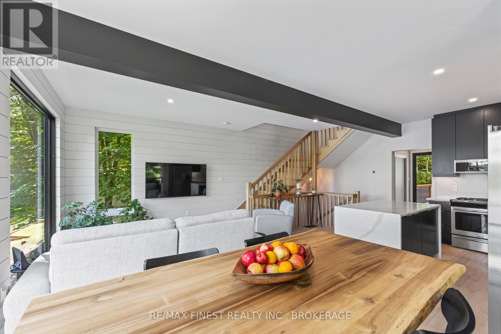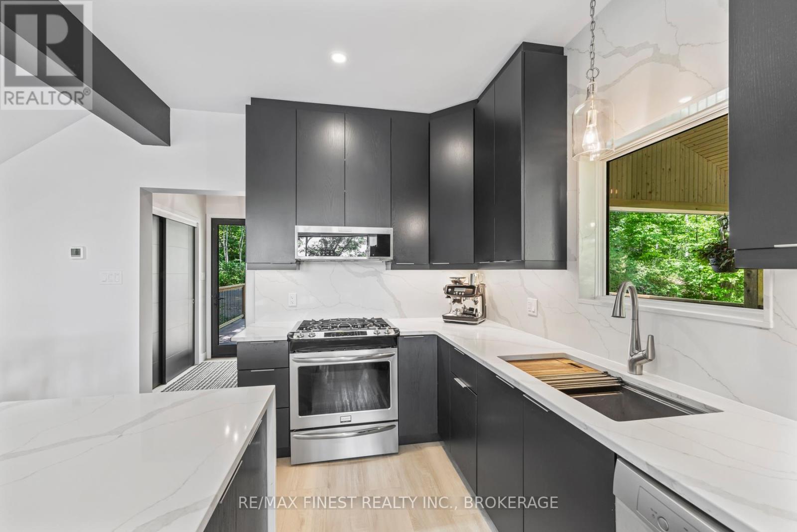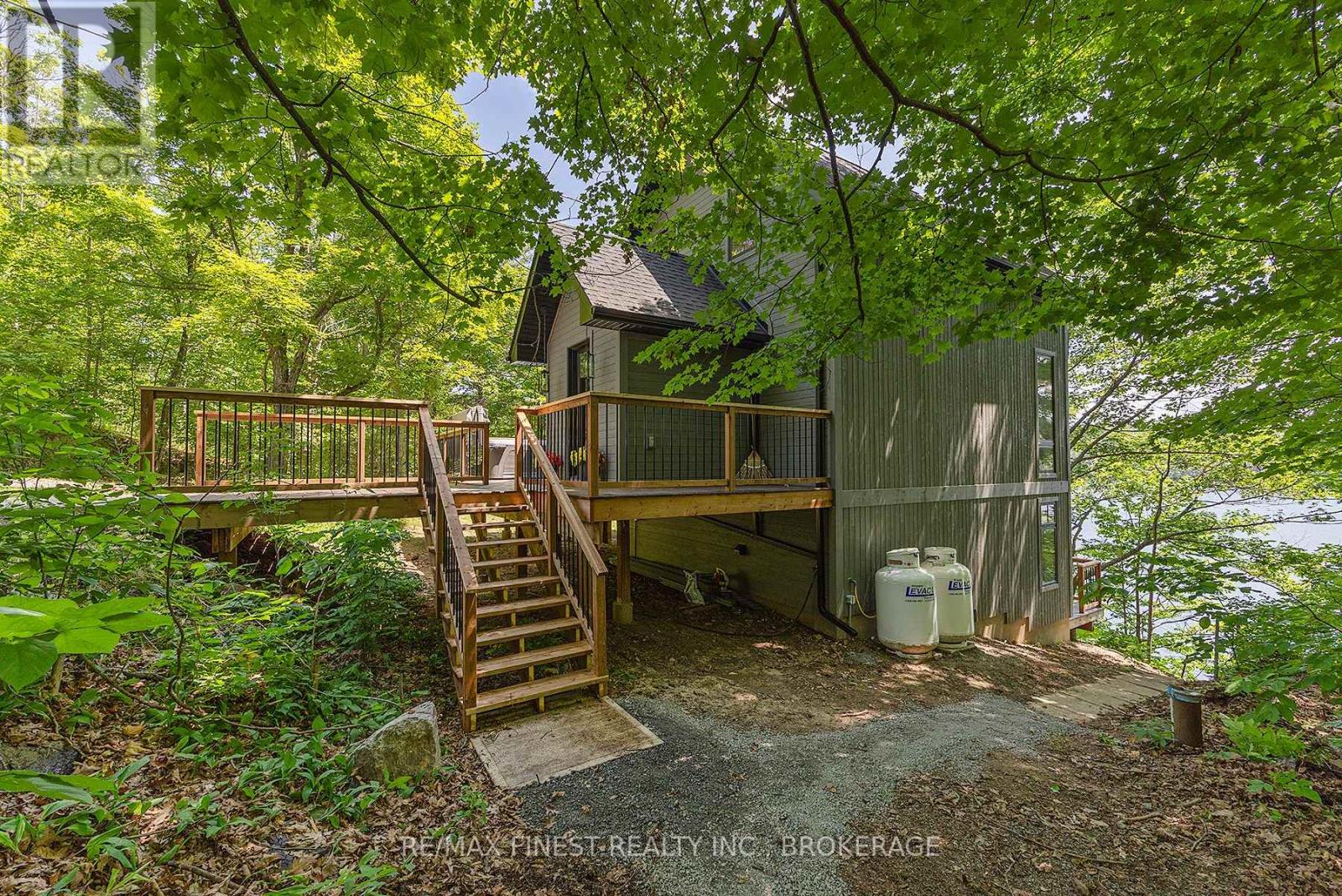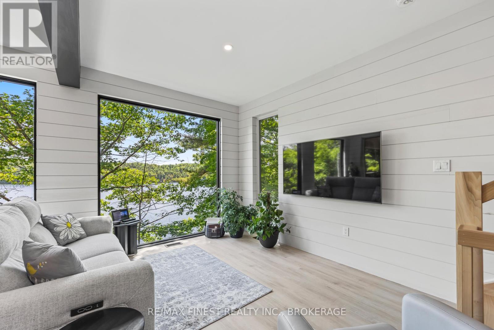 As you enter this immaculate waterfront year round home or cottage, you are welcomed by the stunning views of BuckLake through the massive floor to ceiling Living Room windows. This truly amazing 2 year old maibec wood sided home provides 1416 square feet of total living space, and is constructed to exacting standards with the highest quality materials. No expenses spared in this owner built home which features a bright Kitchen with Quartz counter tops and waterfall island, solid, painted, white oak cabinetry, and stainless steel appliances including a propane range below alow profile Microwave oven......and that view!! The bright and spacious Living/Dining area boasts 10 ft ceilings, luxury vinyl plank flooring throughout and walk out to a wonderfully inviting large covered deck with custom cut cedar ceiling and propane line for the BBQ. What a comfortable space to relax rain or shine! Take a walk up the solid poplar natural staircase to the loft area, and you'll find the Primary Bedroom with soaring cathedral ceilings, a spa-like 4pc Main Bathroom with its unique Slik free standing stone soaker tub and separate glass shower, and a small office area. A huge bonus is that the loft area has it's own heating/cooling system, separate from the levels below. The Basement features two Bedrooms, each with their own walkout to a deck overlooking the lake, a beautiful 4pc Bathroom and Laundry. This is truly a must see property! (id:64974)