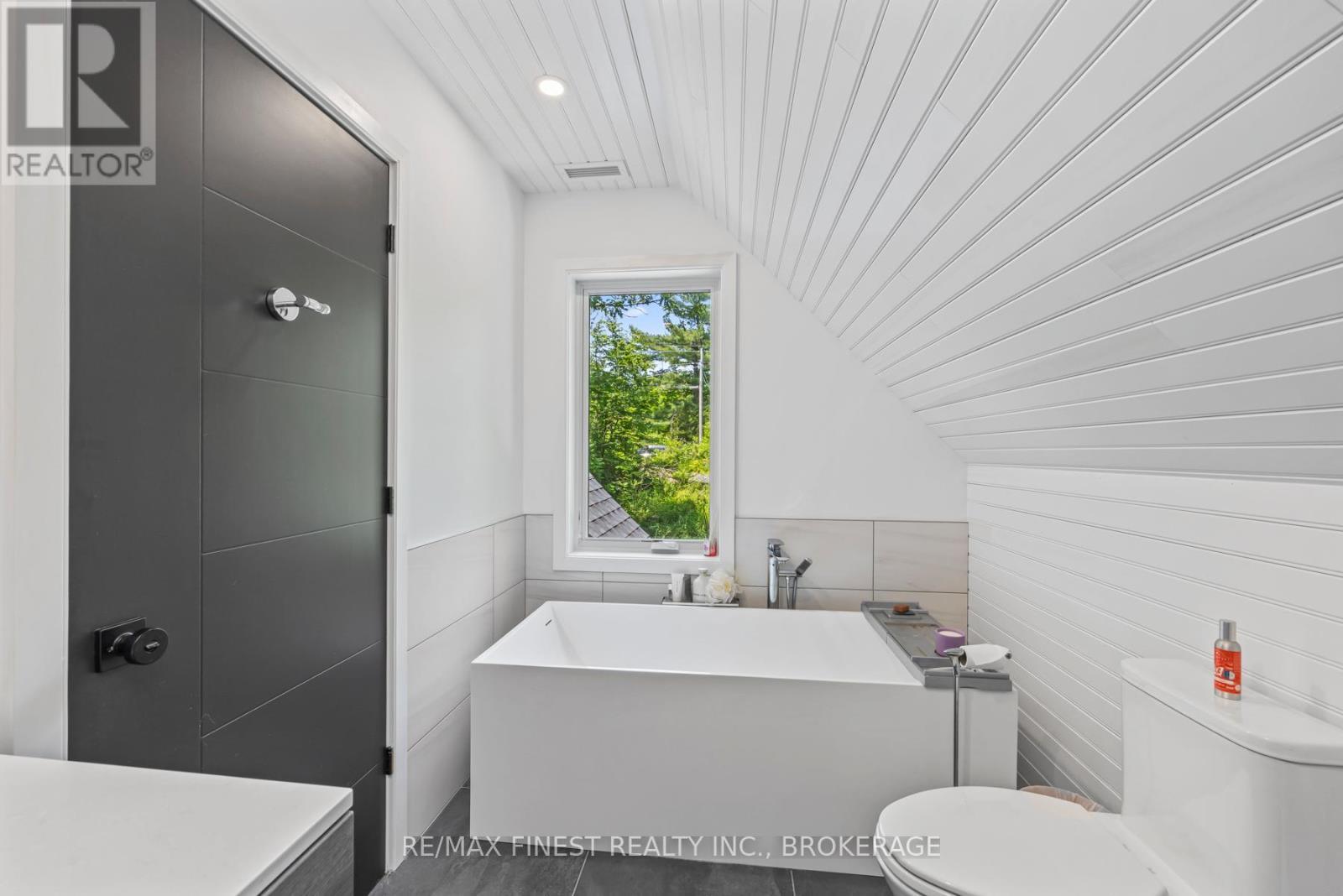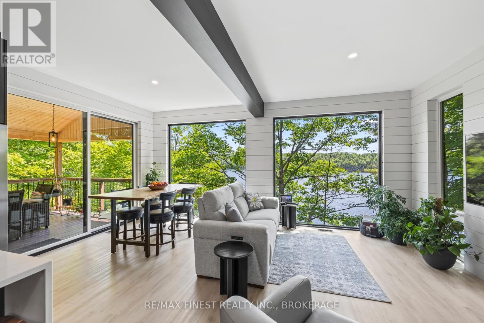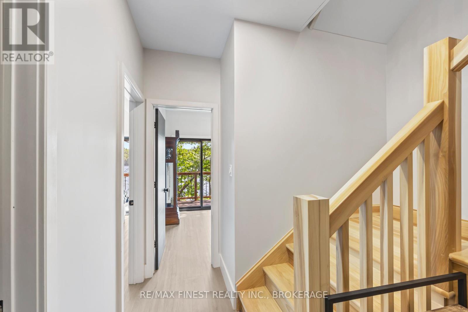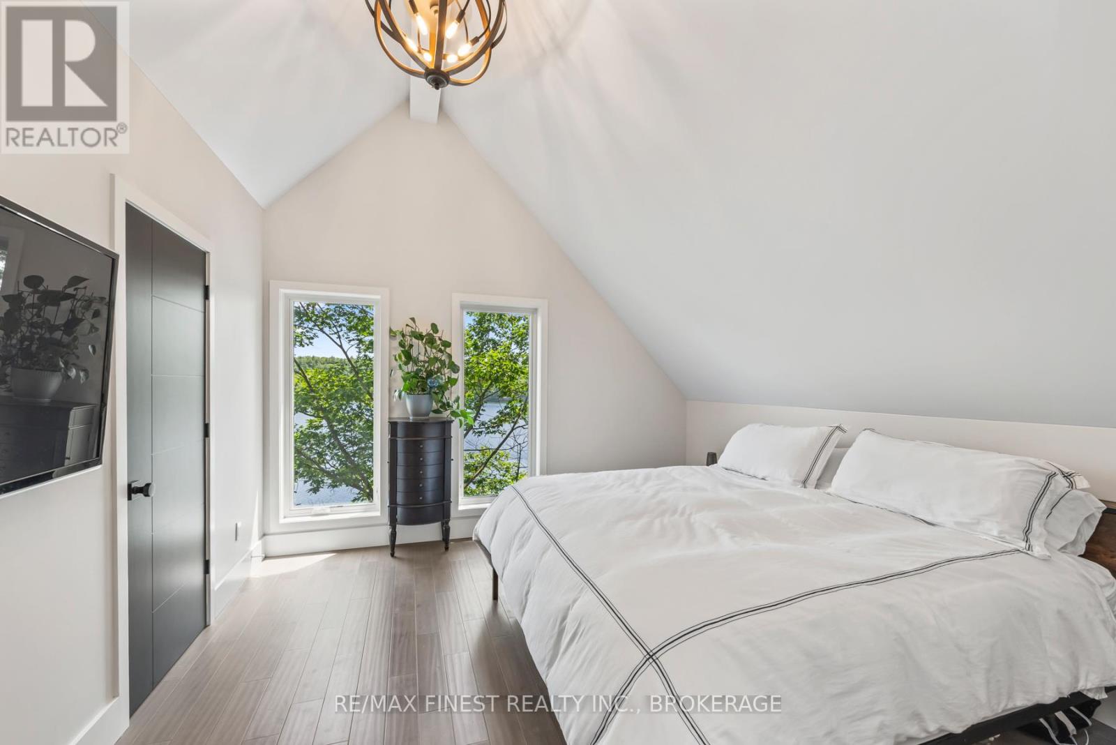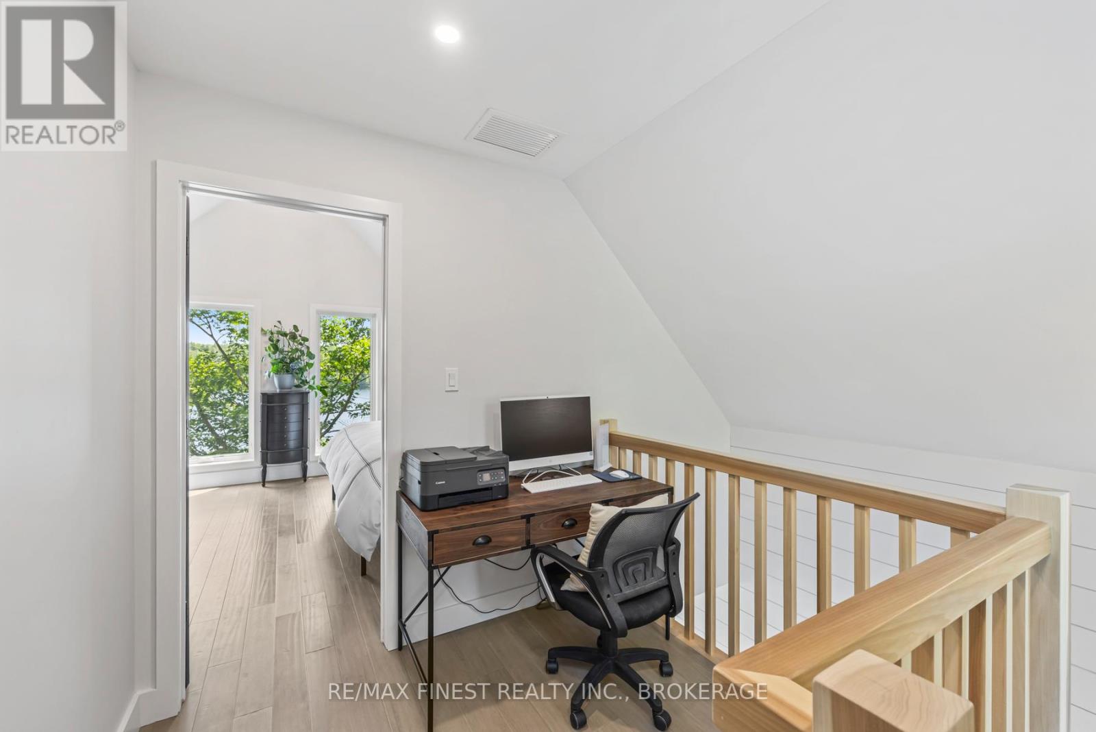 As you enter this immaculate waterfront year round home or cottage, you are welcomed by the stunning views of BuckLake through the massive floor to ceiling Living Room windows. This truly amazing 2 year old maibec wood sided home provides 1416 square feet of total living space, and is constructed to exacting standards with the highest quality materials. No expenses spared in this owner built home which features a bright Kitchen with Quartz counter tops and waterfall island, solid, painted, white oak cabinetry, and stainless steel appliances including a propane range below alow profile Microwave oven......and that view!! The bright and spacious Living/Dining area boasts 10 ft ceilings, luxury vinyl plank flooring throughout and walk out to a wonderfully inviting large covered deck with custom cut cedar ceiling and propane line for the BBQ. What a comfortable space to relax rain or shine! Take a walk up the solid poplar natural staircase to the loft area, and you'll find the Primary Bedroom with soaring cathedral ceilings, a spa-like 4pc Main Bathroom with its unique Slik free standing stone soaker tub and separate glass shower, and a small office area. A huge bonus is that the loft area has it's own heating/cooling system, separate from the levels below. The Basement features two Bedrooms, each with their own walkout to a deck overlooking the lake, a beautiful 4pc Bathroom and Laundry. This is truly a must see property! (id:64974)