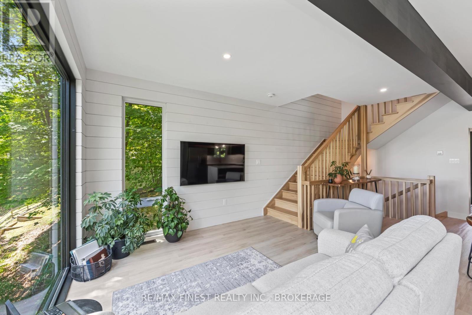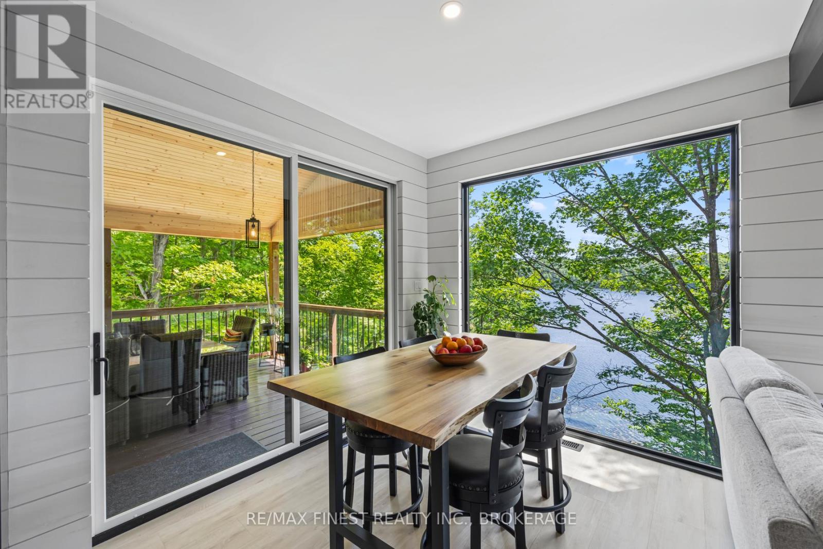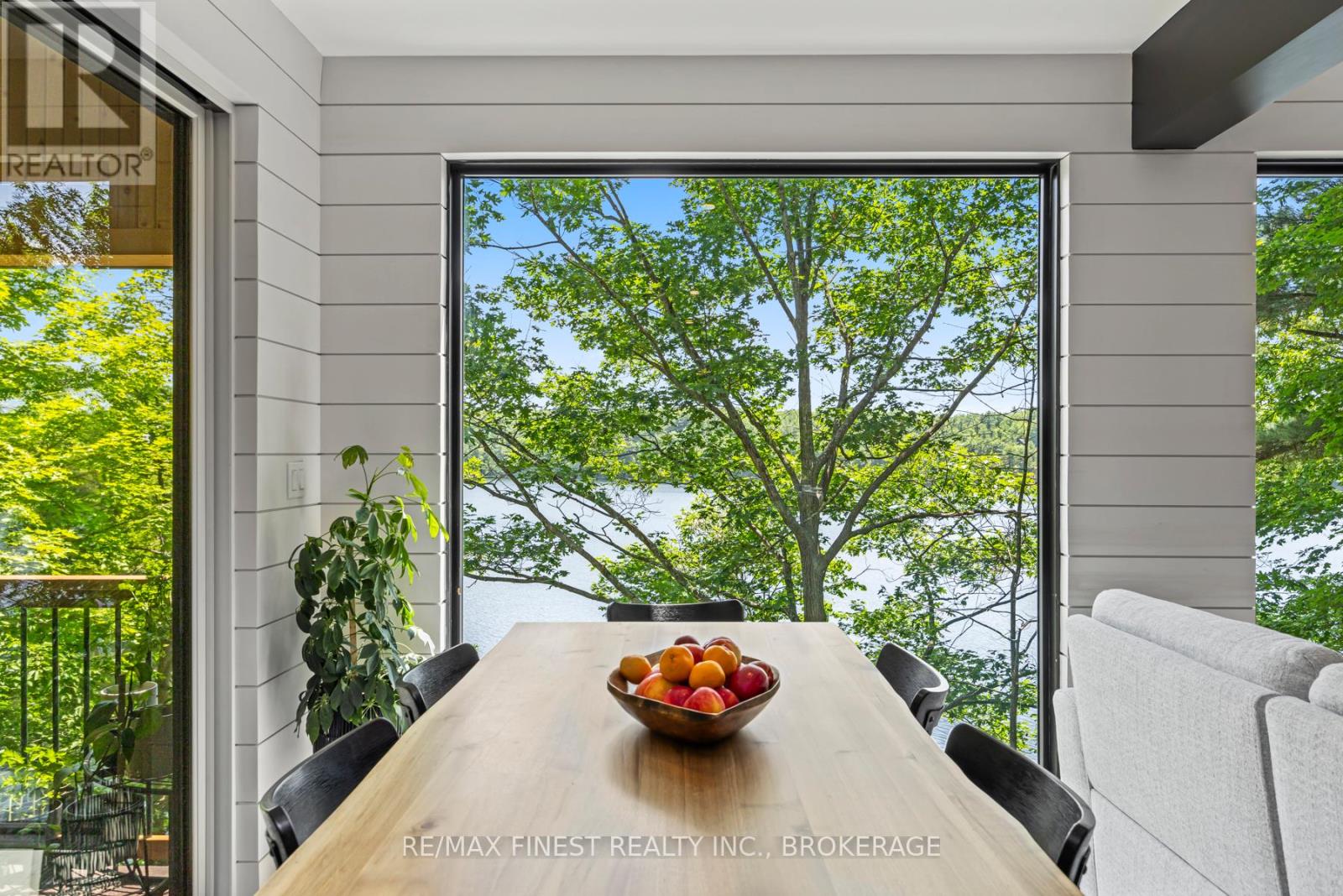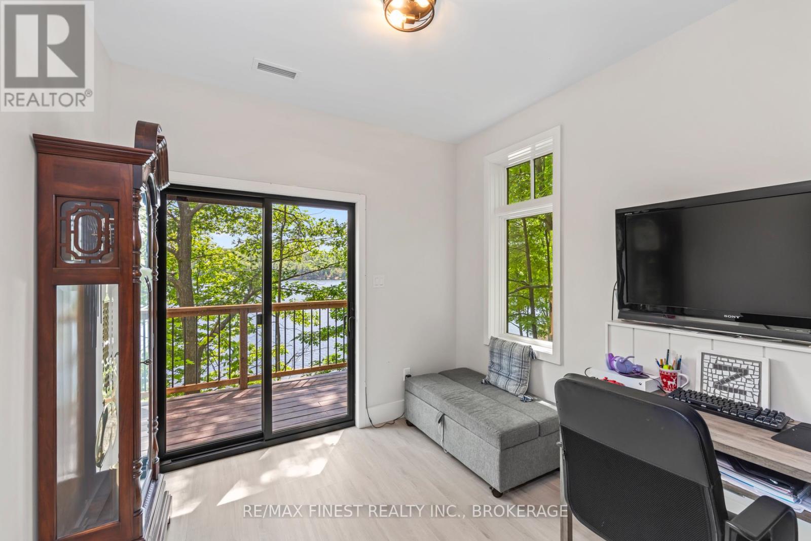 As you enter this immaculate waterfront year round home or cottage, you are welcomed by the stunning views of BuckLake through the massive floor to ceiling Living Room windows. This truly amazing 2 year old maibec wood sided home provides 1416 square feet of total living space, and is constructed to exacting standards with the highest quality materials. No expenses spared in this owner built home which features a bright Kitchen with Quartz counter tops and waterfall island, solid, painted, white oak cabinetry, and stainless steel appliances including a propane range below alow profile Microwave oven......and that view!! The bright and spacious Living/Dining area boasts 10 ft ceilings, luxury vinyl plank flooring throughout and walk out to a wonderfully inviting large covered deck with custom cut cedar ceiling and propane line for the BBQ. What a comfortable space to relax rain or shine! Take a walk up the solid poplar natural staircase to the loft area, and you'll find the Primary Bedroom with soaring cathedral ceilings, a spa-like 4pc Main Bathroom with its unique Slik free standing stone soaker tub and separate glass shower, and a small office area. A huge bonus is that the loft area has it's own heating/cooling system, separate from the levels below. The Basement features two Bedrooms, each with their own walkout to a deck overlooking the lake, a beautiful 4pc Bathroom and Laundry. This is truly a must see property! (id:64974)