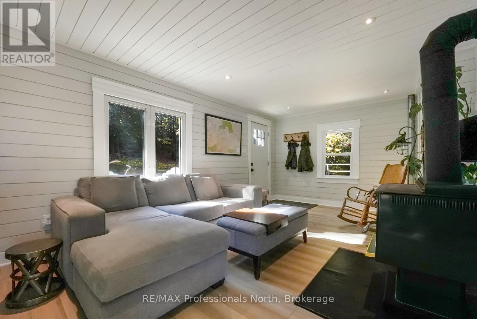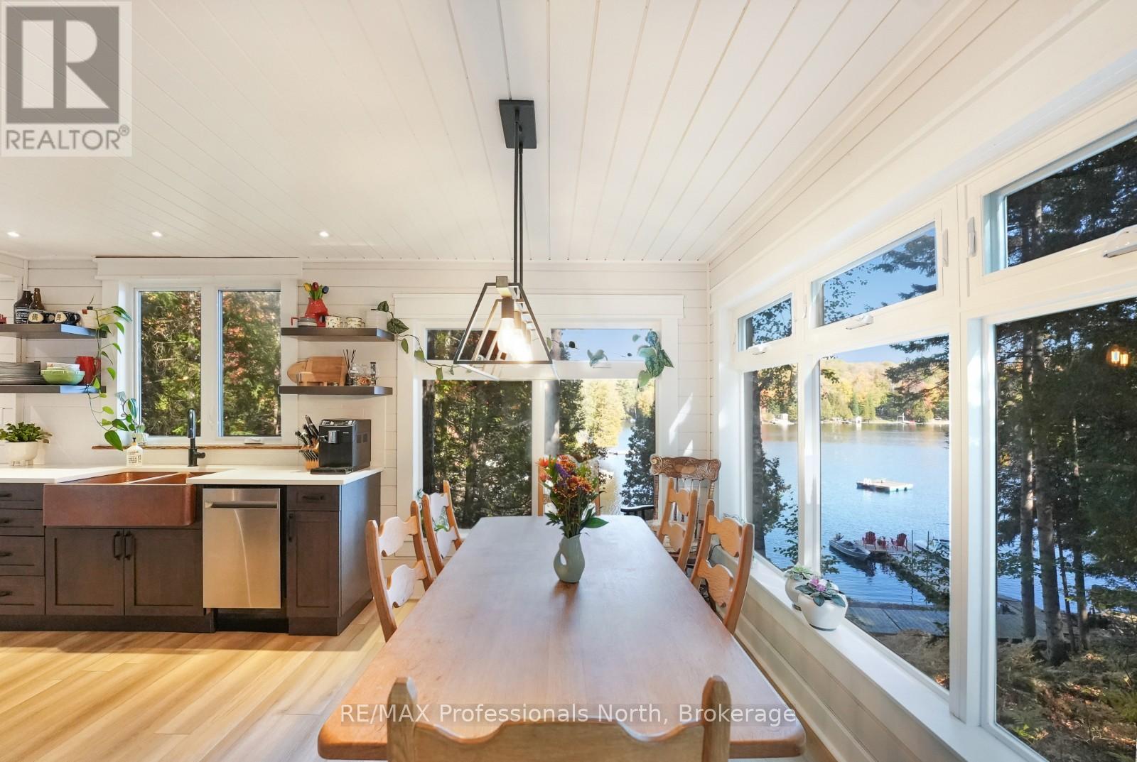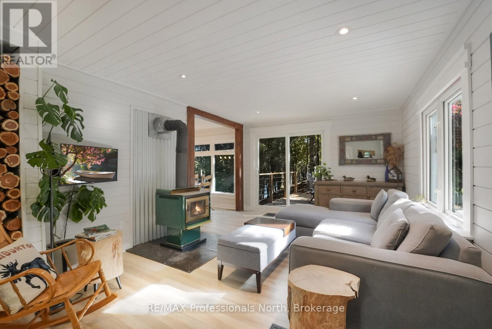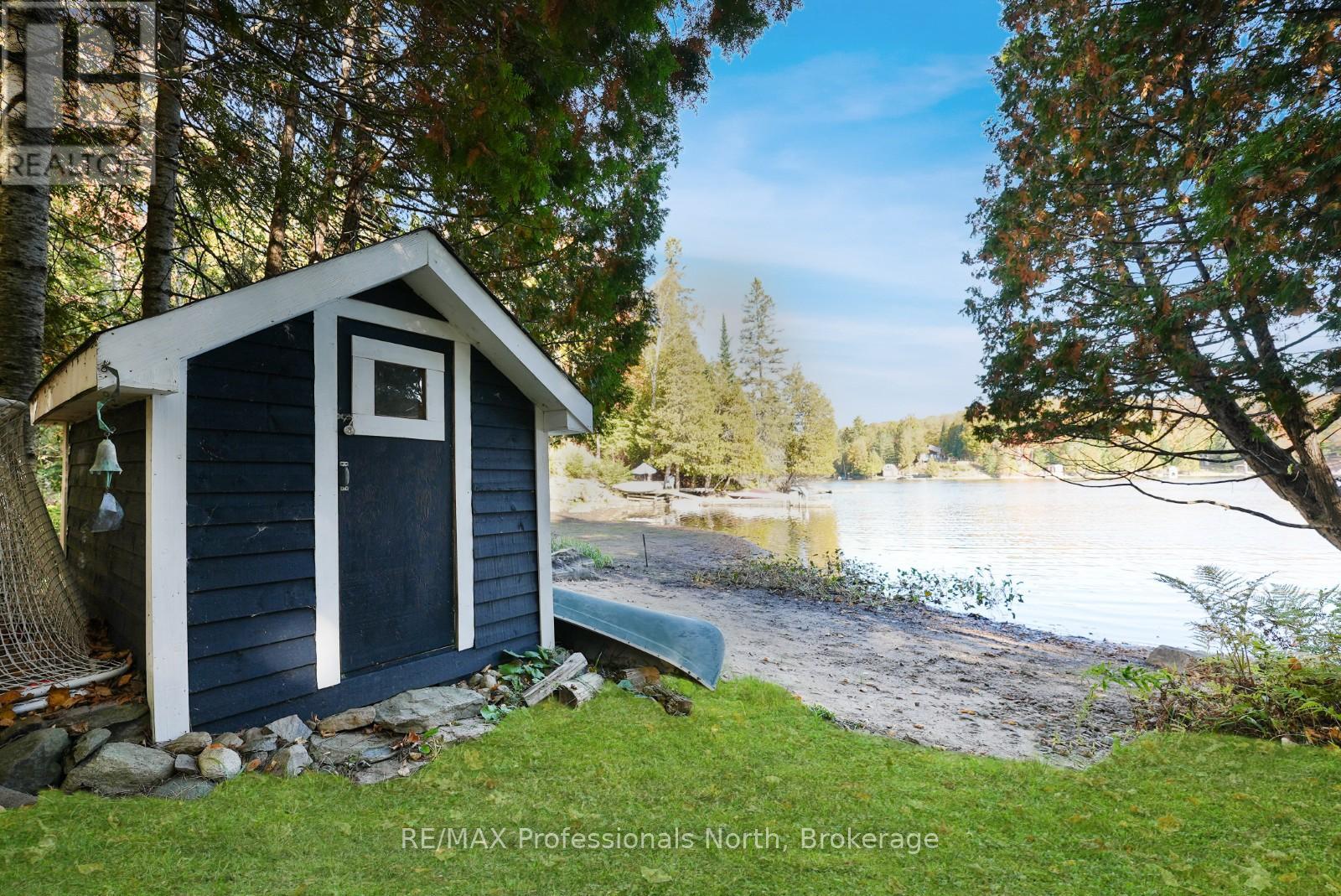 Welcome to this fully renovated 4-season waterfront home or cottage on sought-after Soyers Lake, part of Haliburton's desirable 5-lake chain. Offering 96 feet of owned frontage with a sand beach, private boat launch, and endless boating opportunities, this property is ideal as a year-round residence, family retreat, or investment with owned shoreline road allowance. The 2-storey home features 1017 sq. ft. of living space with 2 bedrooms and 2 bathrooms, forced air electric, and A/C. The main level offers an open-concept living and dining area flowing into the updated kitchen, complete with quartz countertops, mosaic backsplash, hammered copper sink, and pot filler. A 2-piece bath and multiple walkouts to large decks overlooking the water complete the main floor. Upstairs, find 2 generous bedrooms and a 3-piece bath, including a primary with walk-in closet. Outdoor living is exceptional with expansive decks at both the cottage and shoreline, lakeside storage shed, and a dock for swimming and boating. A detached, heated and insulated bunkie provides additional sleeping space and is connected to a garage/workshop for storage or hobbies. Enjoy year-round comfort with a drilled well and easy access on a municipal road. Centrally located between Haliburton and Minden for shopping, dining, and amenities. By boat, head to the Haliburton docks for the farmers market, dining, or groceries, enjoy sunsets and fine dining at Bonnie View Inn, or stop at Kates Burgers for ice cream and snacks. This mostly turn-key property is a rare opportunity to own a move-in ready home on a prime lake in Haliburton. (id:64974)