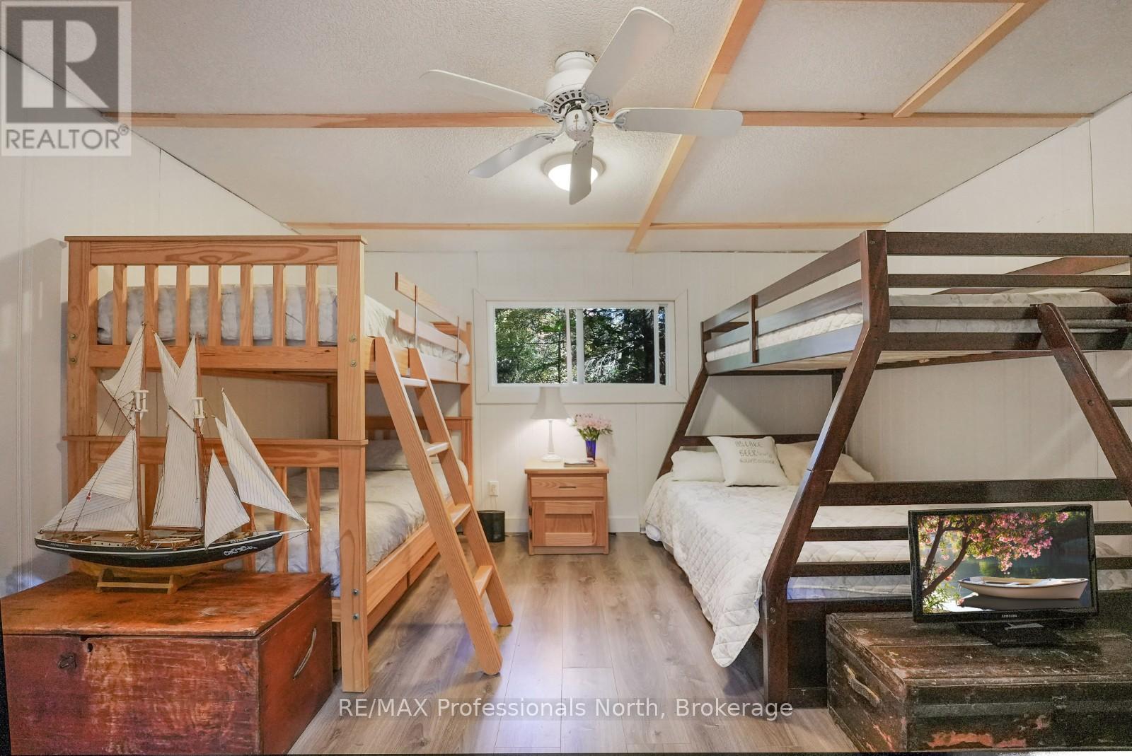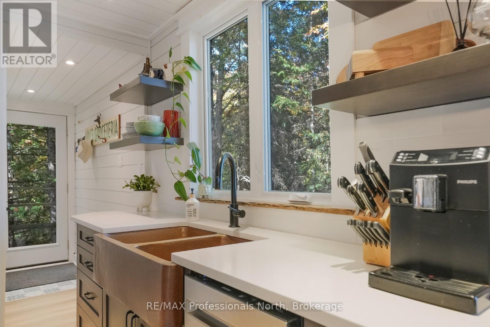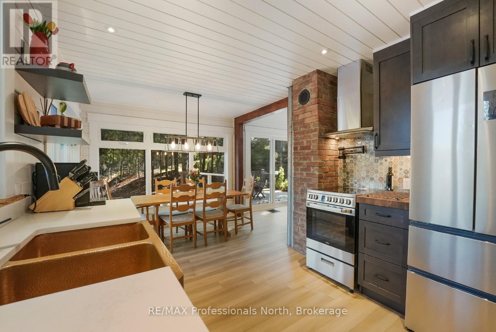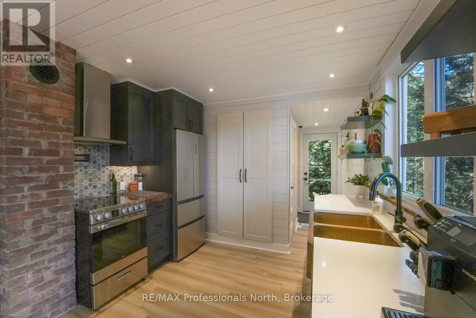 Welcome to this fully renovated 4-season waterfront home or cottage on sought-after Soyers Lake, part of Haliburton's desirable 5-lake chain. Offering 96 feet of owned frontage with a sand beach, private boat launch, and endless boating opportunities, this property is ideal as a year-round residence, family retreat, or investment with owned shoreline road allowance. The 2-storey home features 1017 sq. ft. of living space with 2 bedrooms and 2 bathrooms, forced air electric, and A/C. The main level offers an open-concept living and dining area flowing into the updated kitchen, complete with quartz countertops, mosaic backsplash, hammered copper sink, and pot filler. A 2-piece bath and multiple walkouts to large decks overlooking the water complete the main floor. Upstairs, find 2 generous bedrooms and a 3-piece bath, including a primary with walk-in closet. Outdoor living is exceptional with expansive decks at both the cottage and shoreline, lakeside storage shed, and a dock for swimming and boating. A detached, heated and insulated bunkie provides additional sleeping space and is connected to a garage/workshop for storage or hobbies. Enjoy year-round comfort with a drilled well and easy access on a municipal road. Centrally located between Haliburton and Minden for shopping, dining, and amenities. By boat, head to the Haliburton docks for the farmers market, dining, or groceries, enjoy sunsets and fine dining at Bonnie View Inn, or stop at Kates Burgers for ice cream and snacks. This mostly turn-key property is a rare opportunity to own a move-in ready home on a prime lake in Haliburton. (id:64974)