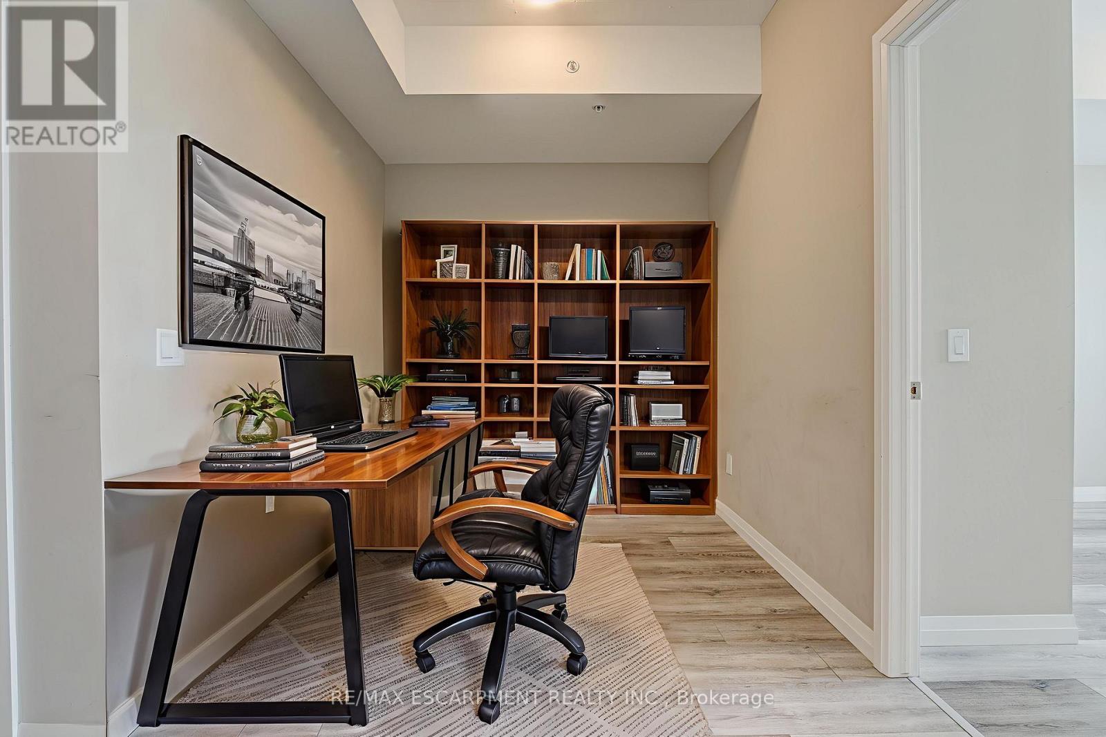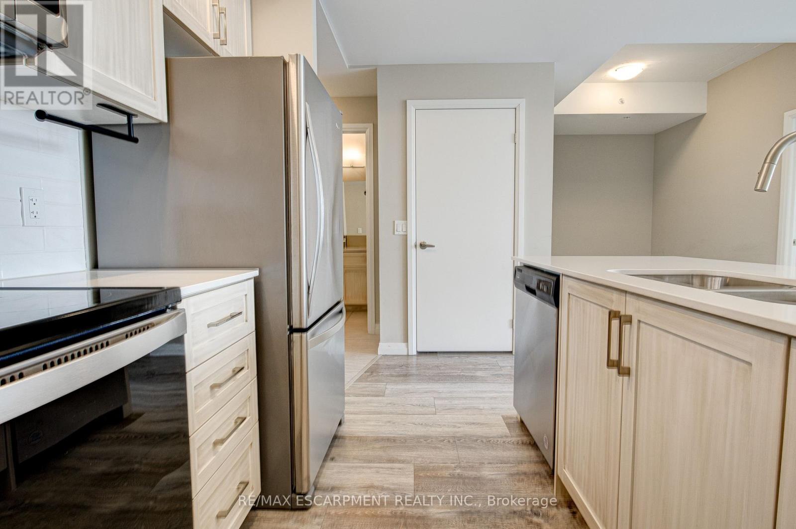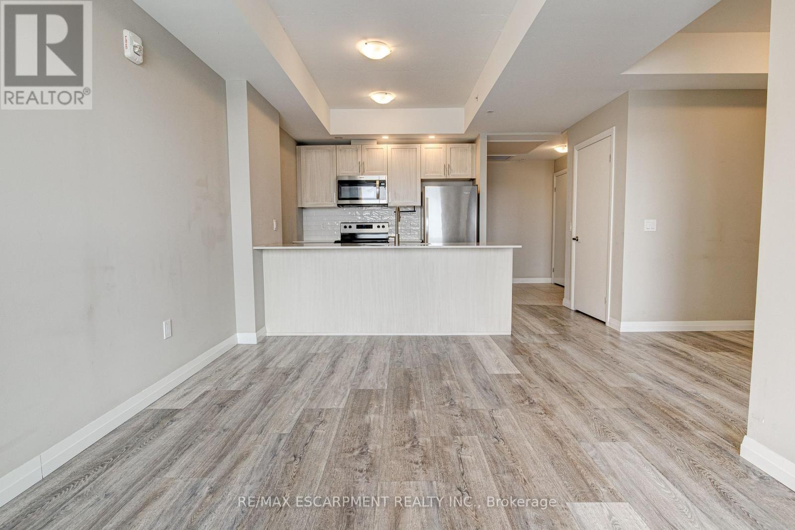 Located just steps to downtown Kitchener and the beautiful Victoria Park, this 1 bedroom plus den condo at 108 Garment Street offers a welcoming place to settle into city living. Completed in 2022, the unit features a practical layout and a kitchen that truly anchors the space.Upgraded appliances and cabinetry, a double sink, dishwasher, and generous counter space make it easy to cook at home, while the extra-long peninsula comfortably seats three to four-ideal for casual meals or hosting friends. The living area flows easily from the kitchen and opens to a private west-facing balcony, offering a quiet place to unwind in the afternoon and evening. The den adds valuable flexibility, working equally well as a home office, extra storage, or cozy reading nook. The bedroom is comfortably sized, and the unit is completed by a contemporary bathroom and the convenience of in-suite laundry. Indoor garage parking for one vehicle and a storage locker are included with the unit. Residents also enjoy access to a well-equipped fitness room, yoga space, party room, and an outdoor terrace featuring a pool, basketball court, BBQ area, and plenty of seating for gathering with friends. Ample visitor parking next door makes hosting easy. With shops, transit, dining, and the tech district just outside your door, this home offers an easy, low-maintenance lifestyle in a central location. (id:64974)