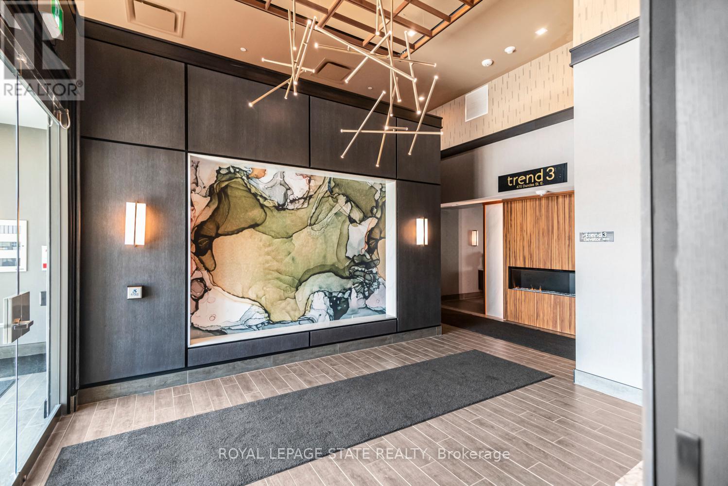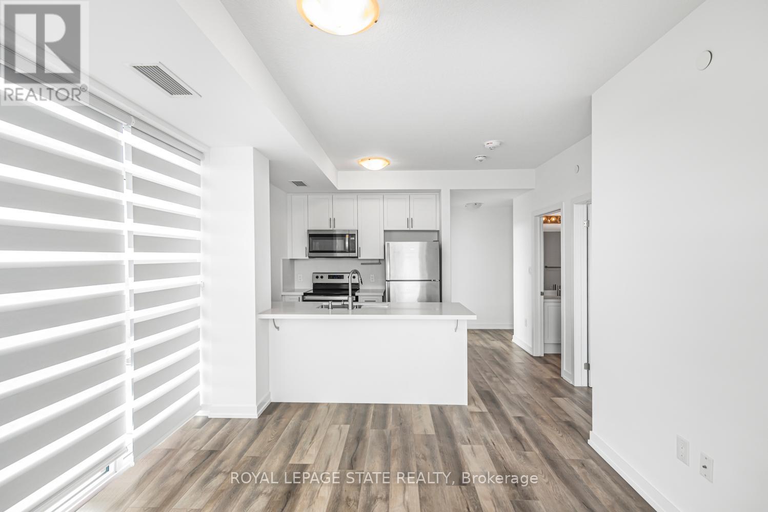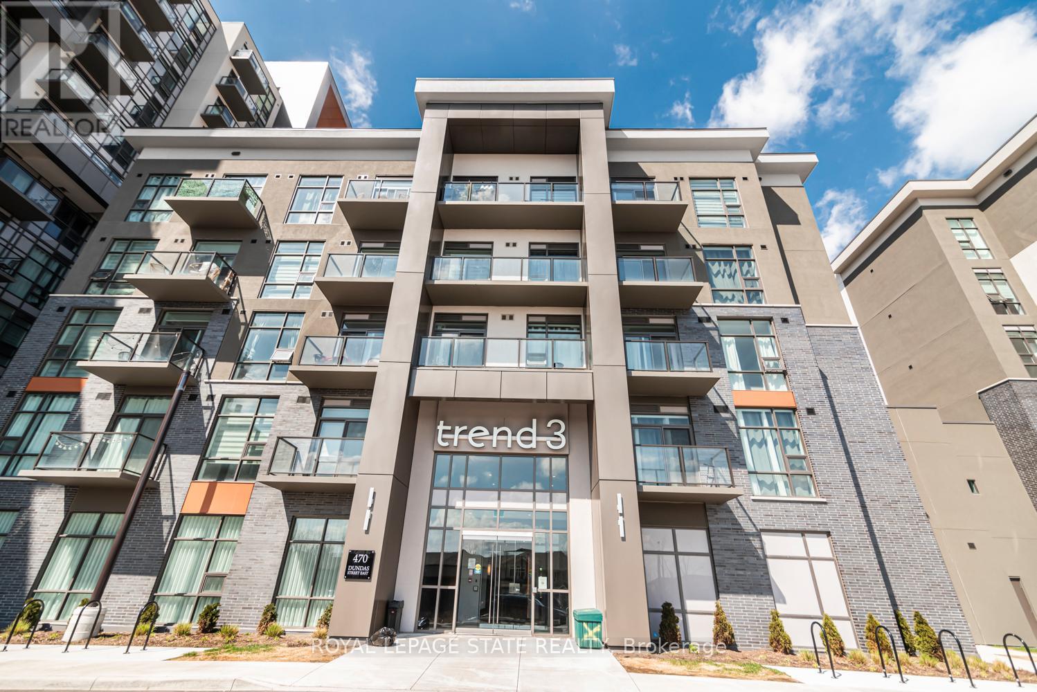 Welcome to this stunning 10th-floor unit in the highly sought-after Trend 3 community! Step into a bright and inviting 2-bedroom, condo. The open concept layout seamlessly connects the modern kitchen and living area, featuring brand-new stainless steel appliances, a stylish breakfast bar with quartz counter tops, and direct access to your private balcony w/exposure to two sides. A well-appointed 4-piece bathroom and the convenience of in-suite laundry complete this thoughtfully designed space. Enjoy a lifestyle of comfort and convenience with exceptional building amenities, including vibrant party rooms, a state of the art fitness center, scenic roof top patios, and secure bike storage. Located in the heart of Waterdown, this home features effortless access to top-rated dining, shopping, schools, and picturesque parks. Included with the unit is 1 owned surface parking space and an owned locker for extra storage. Experience contemporary living at its finest in this exceptional condo (id:64974)
