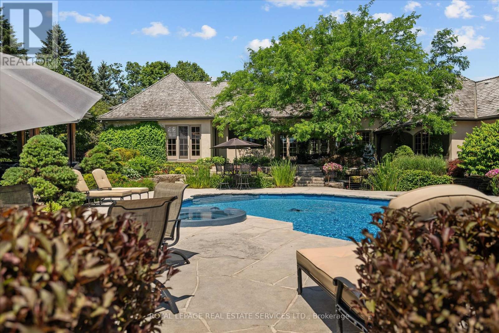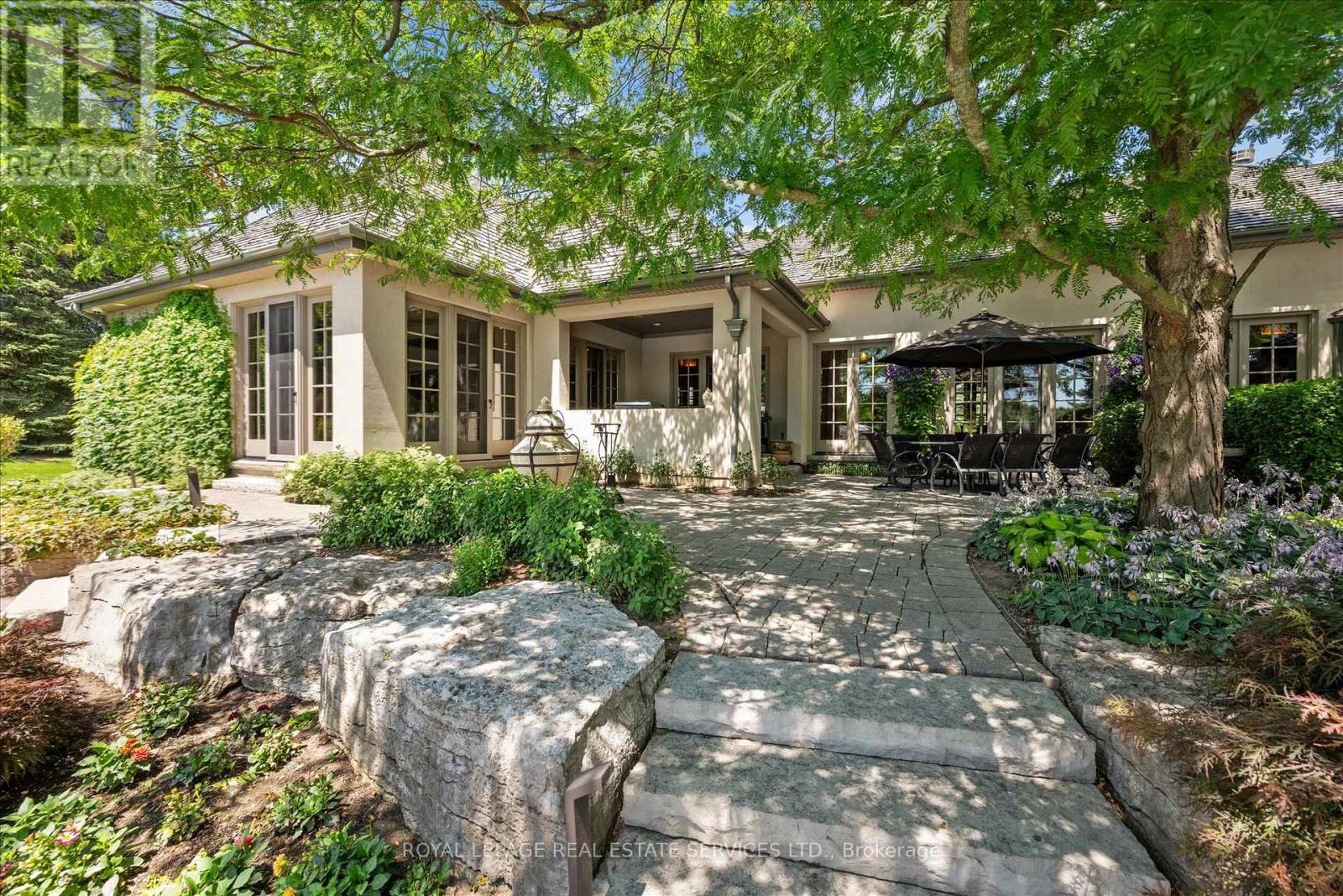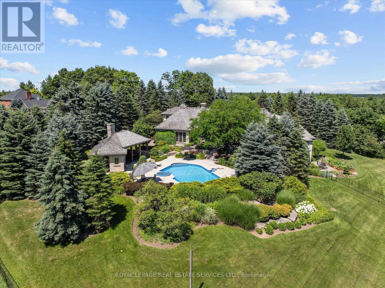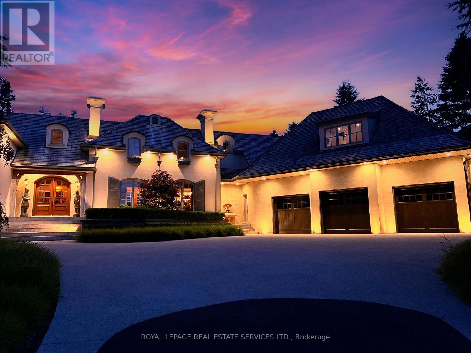 STONEGATE MANOR - AN ARCHITECTURAL MASTERPIECE! Nestled on 2.5 acres of manicured grounds behind private gates in prestigious Whispering Pines Estates, Stonegate Manor is a palatial estate crafted by an award-winning builder. A picturesque pond with fountain greets you at the foot of the driveway, setting the tone for timeless French Manor-inspired elegance. A grand foyer with 17.5-foot cathedral ceiling and hand-painted mural opens to a living room with 18-foot vaulted ceiling, two-storey cherrywood gas fireplace and expansive windows flooding the space with natural light. The chefs kitchen features a 48" Wolf gas range, Sub-Zero fridge, Miele dishwasher, servery, and three sets of French doors opening to a private courtyard. The formal dining room connects to a wine cellar with antique Asian doors, while a private office with 15-foot vaulted ceiling, gas fireplace and built-ins offers a refined workspace. The luxurious primary suite boasts a 14-foot vaulted ceiling, courtyard walkout, gas fireplace, walk-in closet, gym, and spa-inspired 7-piece ensuite with clawfoot tub and steam shower with built-in chaise. A lofted entertainment area features a 14-foot vaulted ceiling, wet bar, pool table, theatre setup, and powder room. The finished lower level includes heated floors, full kitchen, 3 bedrooms, 2 baths, and walkout to a private patio - ideal for multi-generational living. Resort-style amenities include an inground saltwater pool with integrated hot tub, standalone hot tub, koi pond, and an additional pond with fountain. The cabana features a wood-burning fireplace, kitchen, seating, automatic mosquito screens, 2-piece powder room, and change room. Additional highlights: elevator to all levels, Crestron Home Automation, oversized 3-car garage, and new concrete/asphalt driveway. A rare offering of elegance and lifestyle - just minutes north of Campbellville! (id:64974)