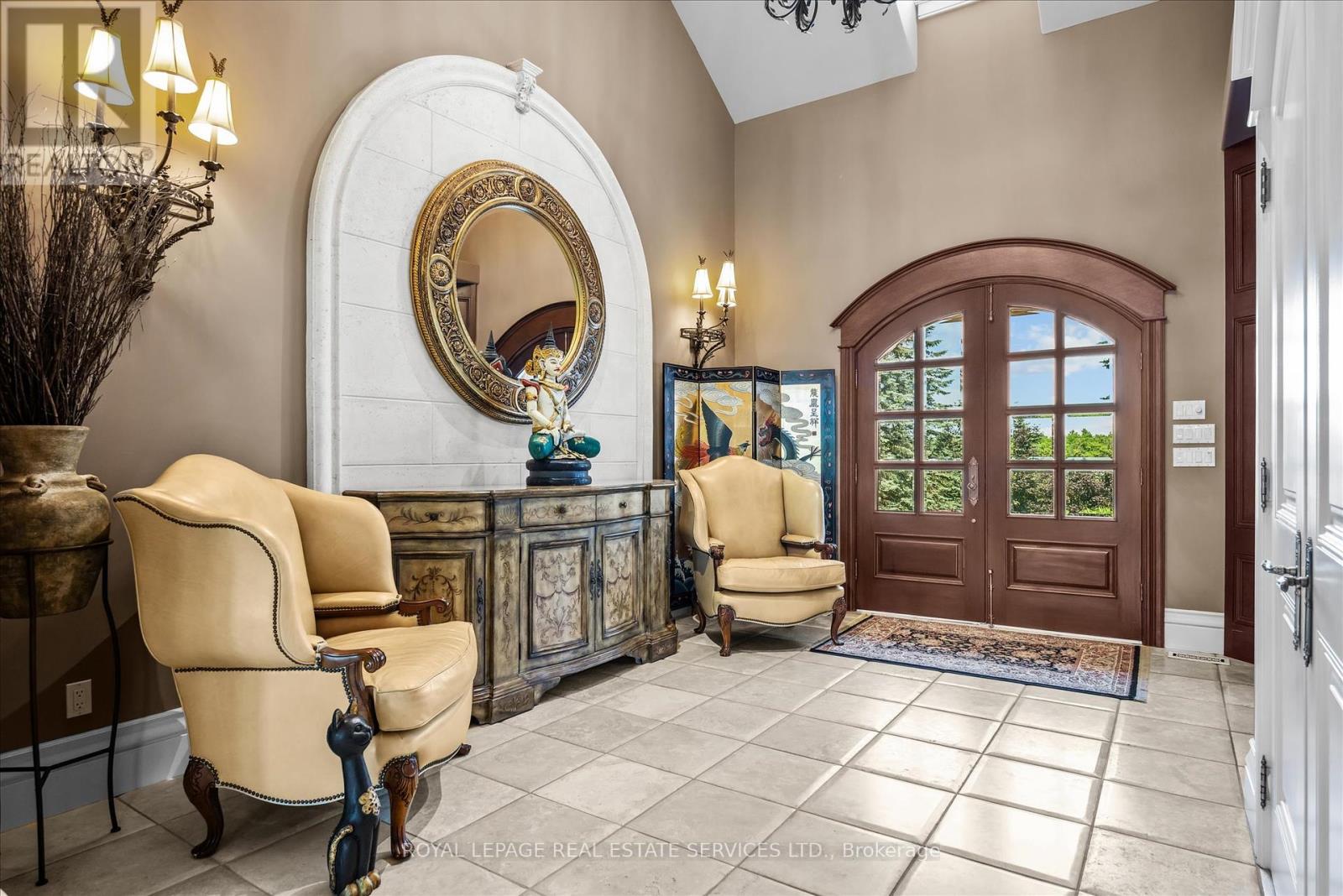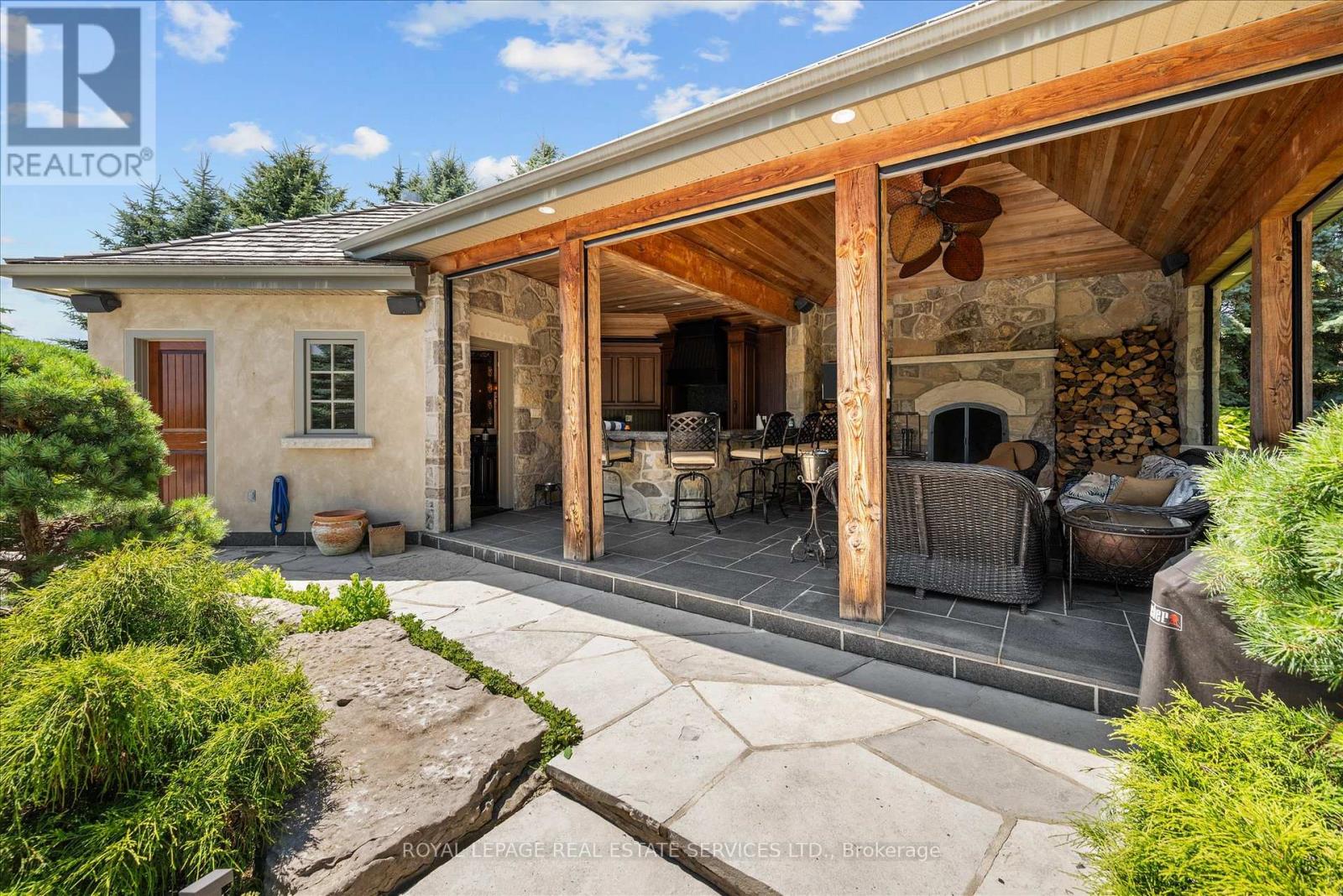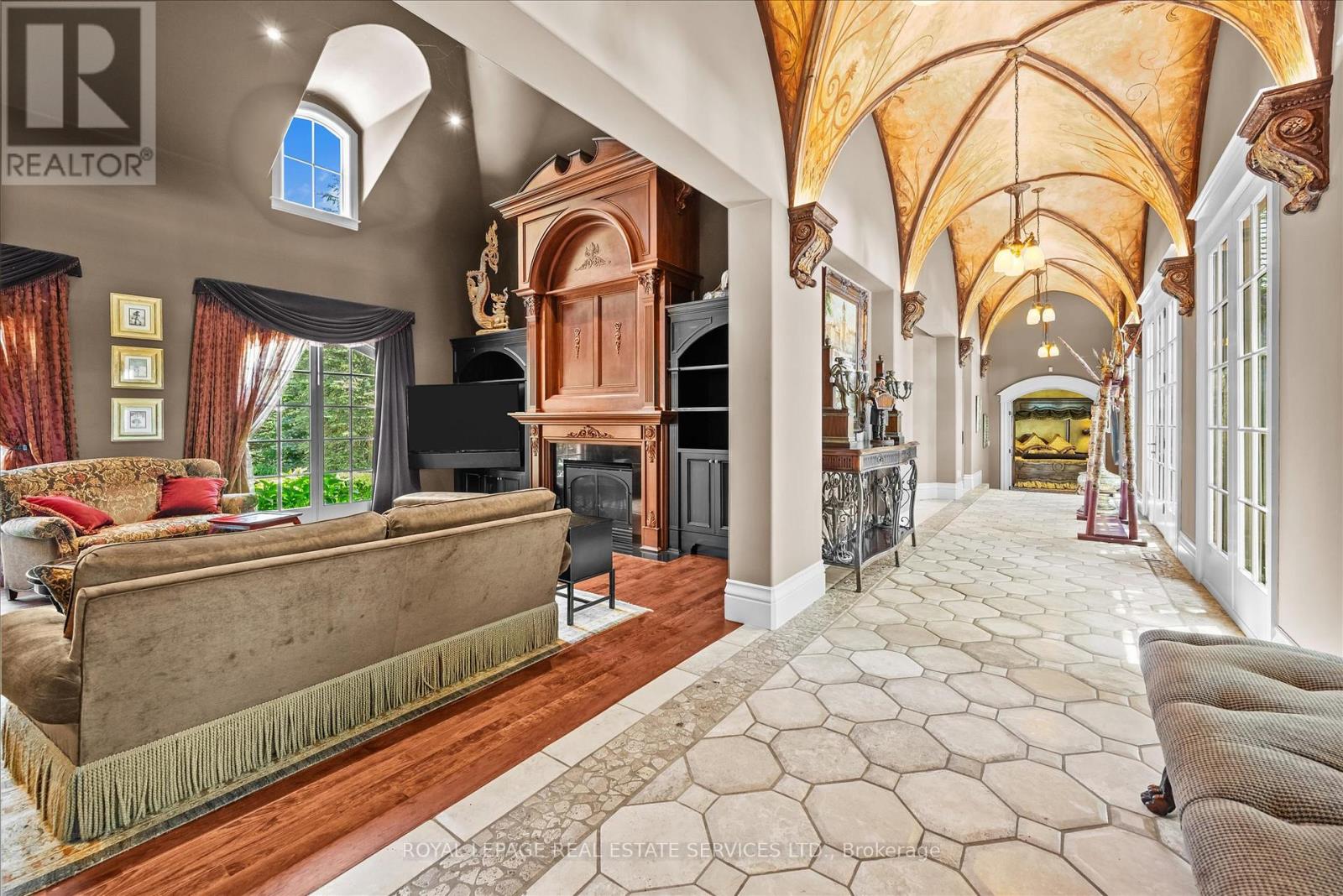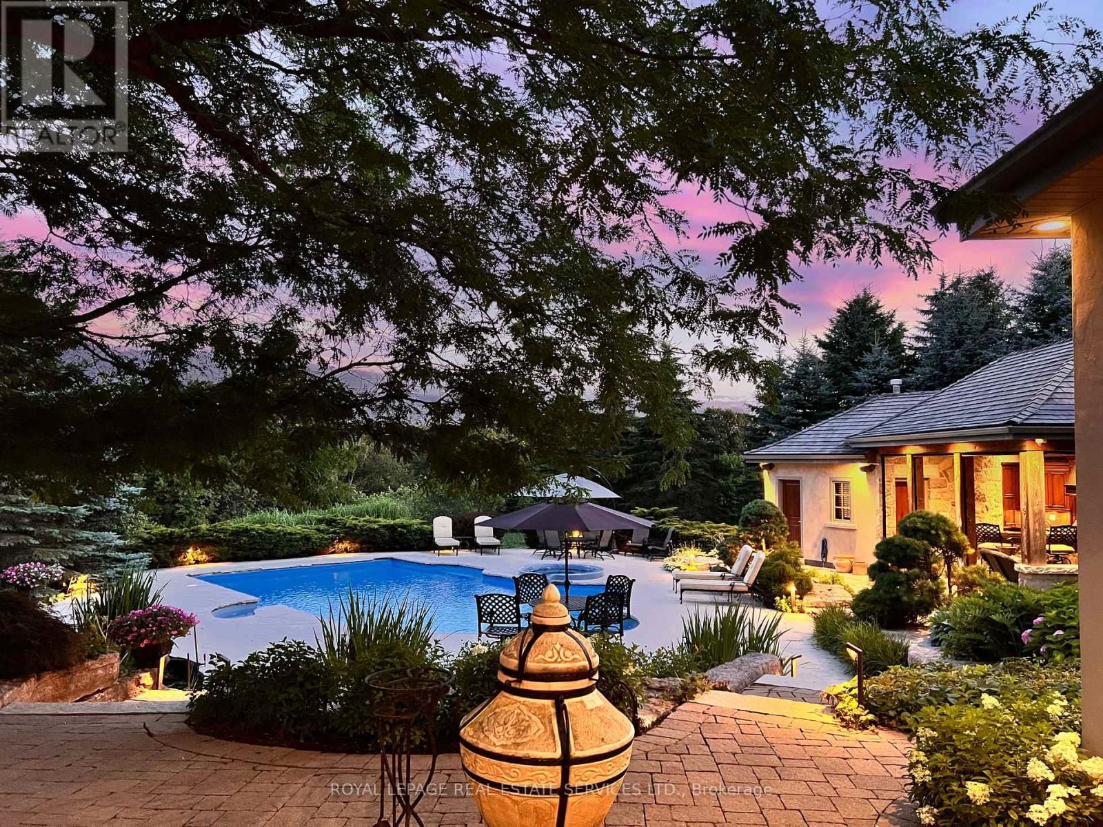STONEGATE MANOR - AN ARCHITECTURAL MASTERPIECE! Nestled on 2.5 acres of manicured grounds behind private gates in prestigious Whispering Pines Estates, Stonegate Manor is a palatial estate crafted by an award-winning builder. A picturesque pond with fountain greets you at the foot of the driveway, setting the tone for timeless French Manor-inspired elegance. A grand foyer with 17.5-foot cathedral ceiling and hand-painted mural opens to a living room with 18-foot vaulted ceiling, two-storey cherrywood gas fireplace and expansive windows flooding the space with natural light. The chefs kitchen features a 48" Wolf gas range, Sub-Zero fridge, Miele dishwasher, servery, and three sets of French doors opening to a private courtyard. The formal dining room connects to a wine cellar with antique Asian doors, while a private office with 15-foot vaulted ceiling, gas fireplace and built-ins offers a refined workspace. The luxurious primary suite boasts a 14-foot vaulted ceiling, courtyard walkout, gas fireplace, walk-in closet, gym, and spa-inspired 7-piece ensuite with clawfoot tub and steam shower with built-in chaise. A lofted entertainment area features a 14-foot vaulted ceiling, wet bar, pool table, theatre setup, and powder room. The finished lower level includes heated floors, full kitchen, 3 bedrooms, 2 baths, and walkout to a private patio - ideal for multi-generational living. Resort-style amenities include an inground saltwater pool with integrated hot tub, standalone hot tub, koi pond, and an additional pond with fountain. The cabana features a wood-burning fireplace, kitchen, seating, automatic mosquito screens, 2-piece powder room, and change room. Additional highlights: elevator to all levels, Crestron Home Automation, oversized 3-car garage, and new concrete/asphalt driveway. A rare offering of elegance and lifestyle - just minutes north of Campbellville! (id:64974)