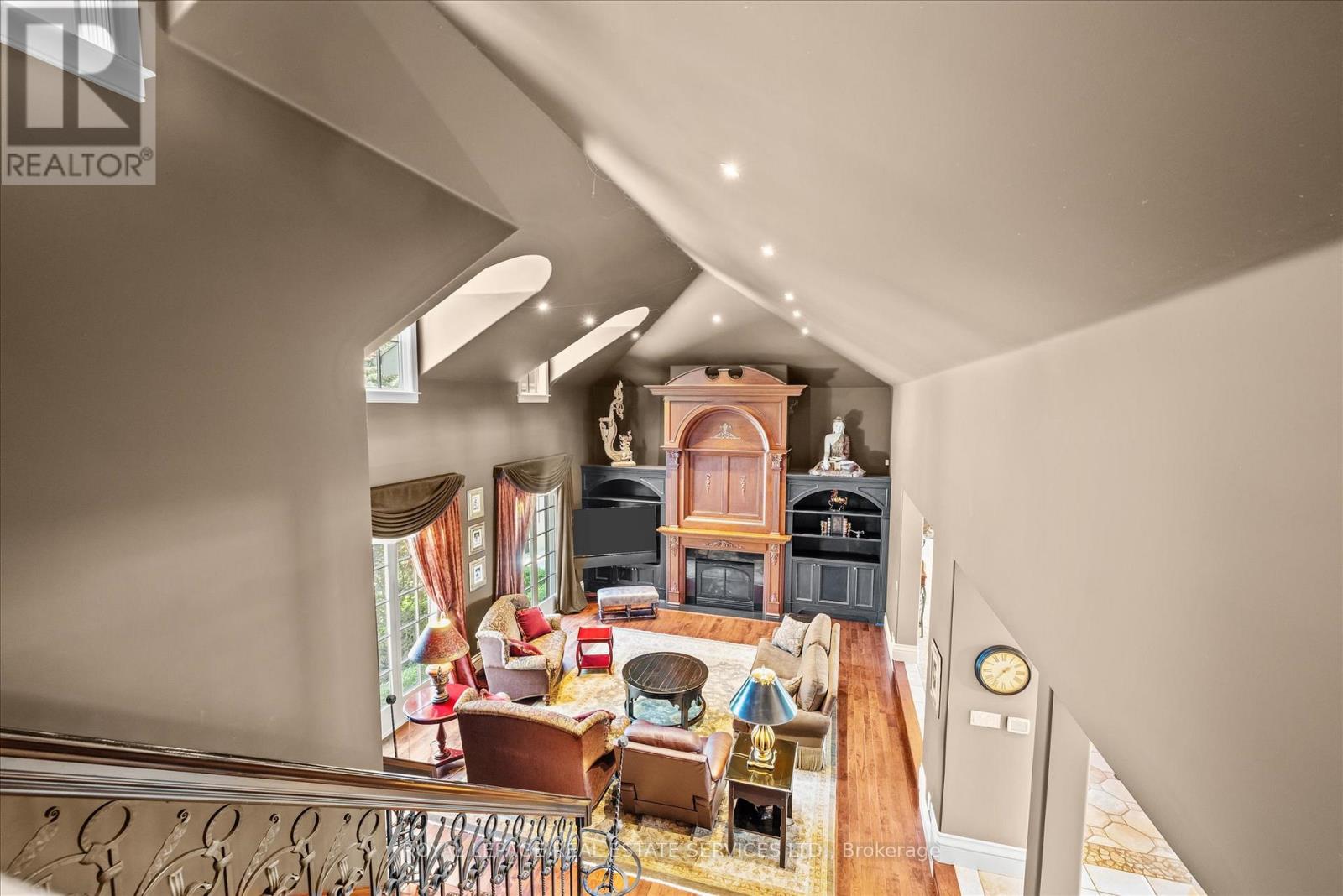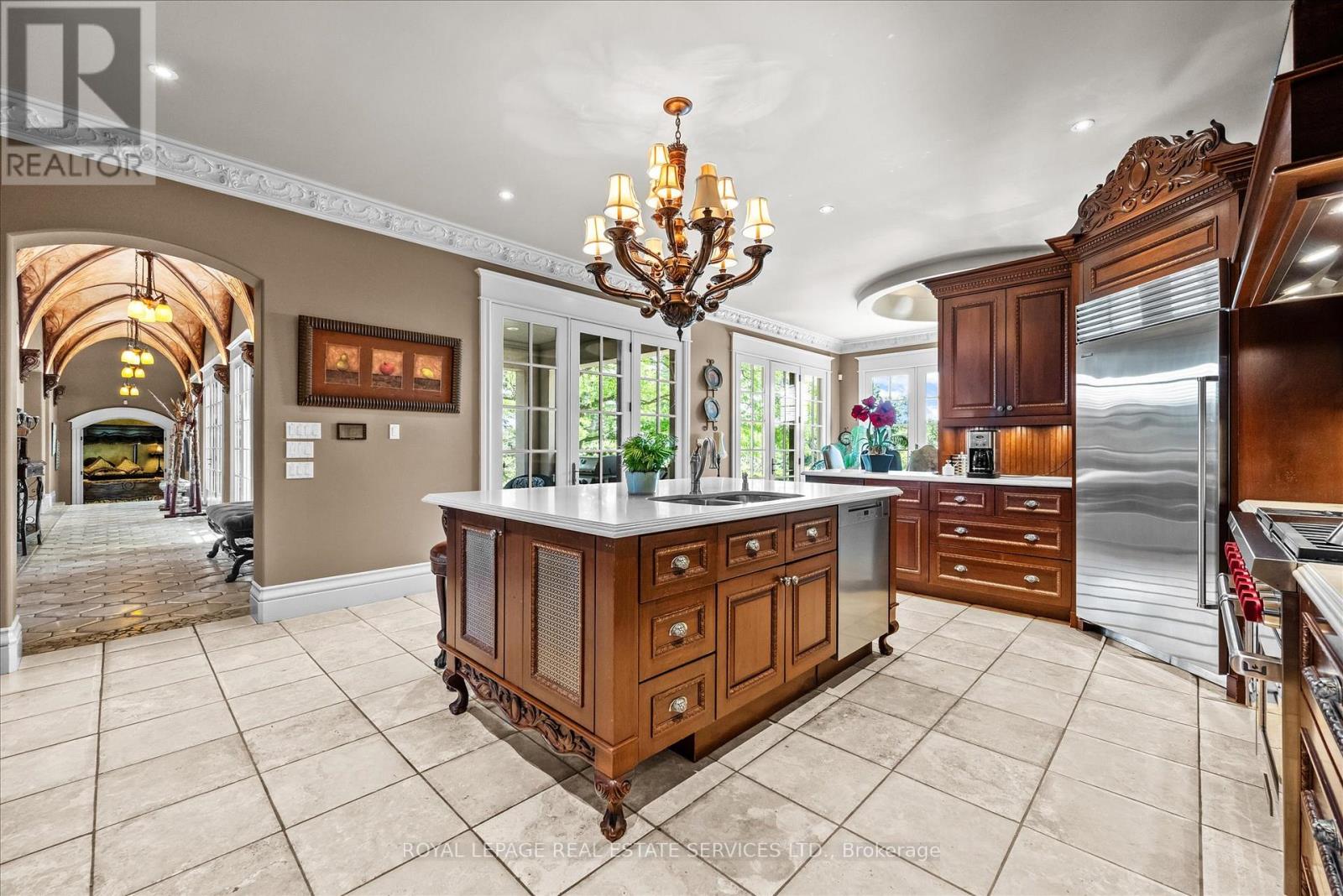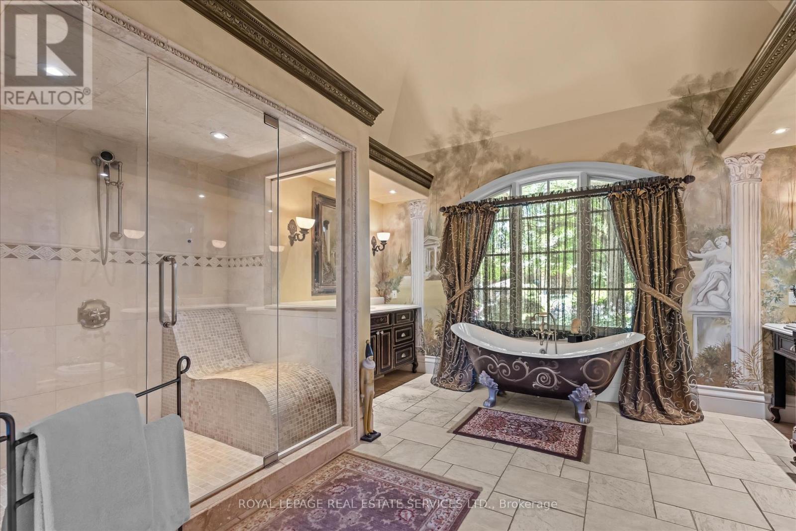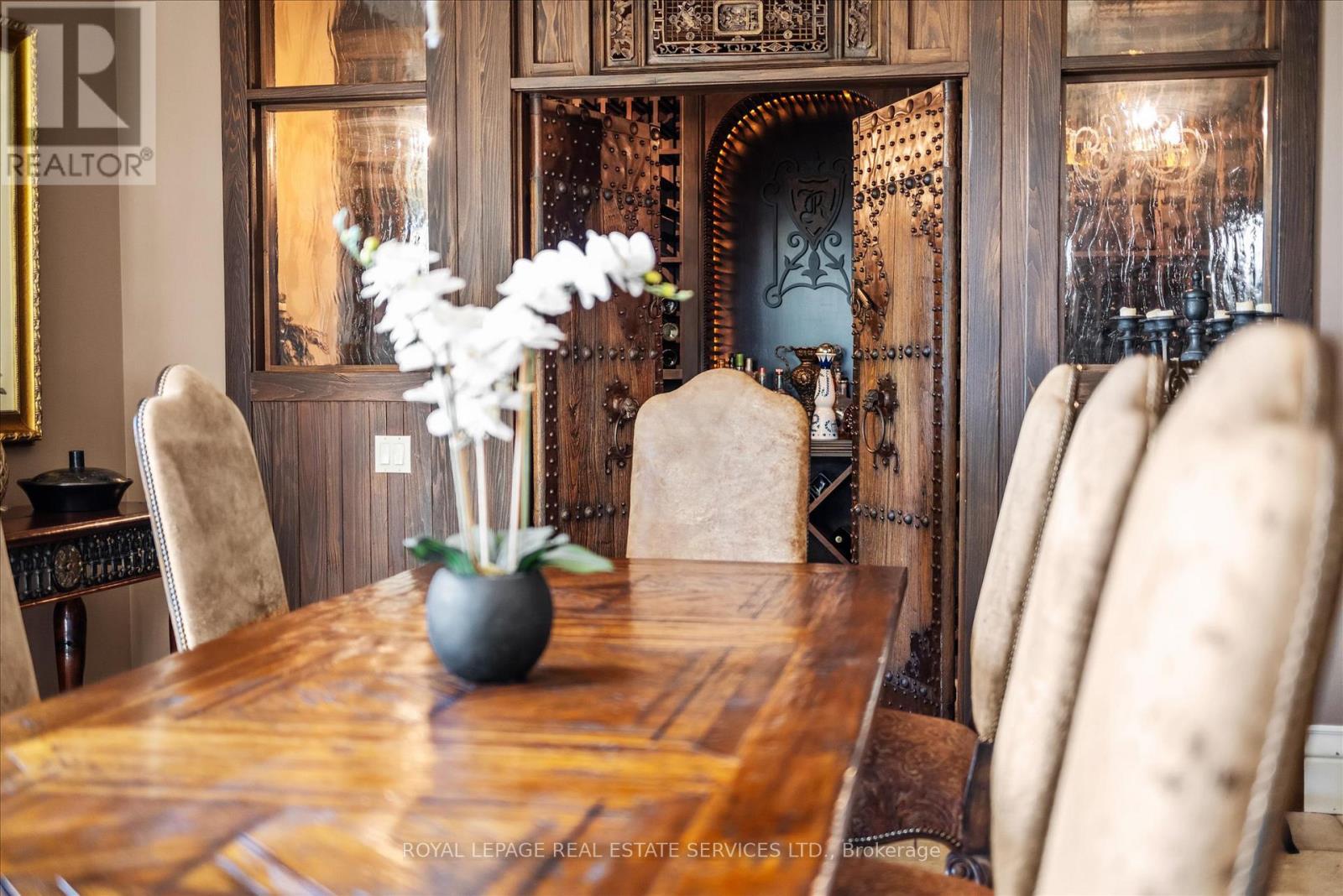 STONEGATE MANOR - AN ARCHITECTURAL MASTERPIECE! Nestled on 2.5 acres of manicured grounds behind private gates in prestigious Whispering Pines Estates, Stonegate Manor is a palatial estate crafted by an award-winning builder. A picturesque pond with fountain greets you at the foot of the driveway, setting the tone for timeless French Manor-inspired elegance. A grand foyer with 17.5-foot cathedral ceiling and hand-painted mural opens to a living room with 18-foot vaulted ceiling, two-storey cherrywood gas fireplace and expansive windows flooding the space with natural light. The chefs kitchen features a 48" Wolf gas range, Sub-Zero fridge, Miele dishwasher, servery, and three sets of French doors opening to a private courtyard. The formal dining room connects to a wine cellar with antique Asian doors, while a private office with 15-foot vaulted ceiling, gas fireplace and built-ins offers a refined workspace. The luxurious primary suite boasts a 14-foot vaulted ceiling, courtyard walkout, gas fireplace, walk-in closet, gym, and spa-inspired 7-piece ensuite with clawfoot tub and steam shower with built-in chaise. A lofted entertainment area features a 14-foot vaulted ceiling, wet bar, pool table, theatre setup, and powder room. The finished lower level includes heated floors, full kitchen, 3 bedrooms, 2 baths, and walkout to a private patio - ideal for multi-generational living. Resort-style amenities include an inground saltwater pool with integrated hot tub, standalone hot tub, koi pond, and an additional pond with fountain. The cabana features a wood-burning fireplace, kitchen, seating, automatic mosquito screens, 2-piece powder room, and change room. Additional highlights: elevator to all levels, Crestron Home Automation, oversized 3-car garage, and new concrete/asphalt driveway. A rare offering of elegance and lifestyle - just minutes north of Campbellville! (id:64974)