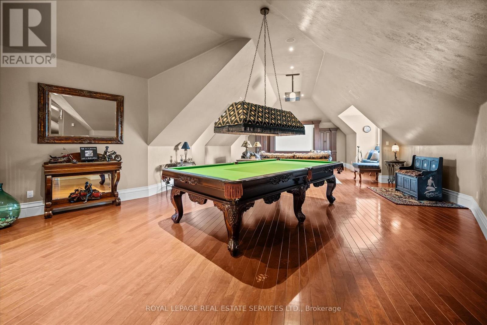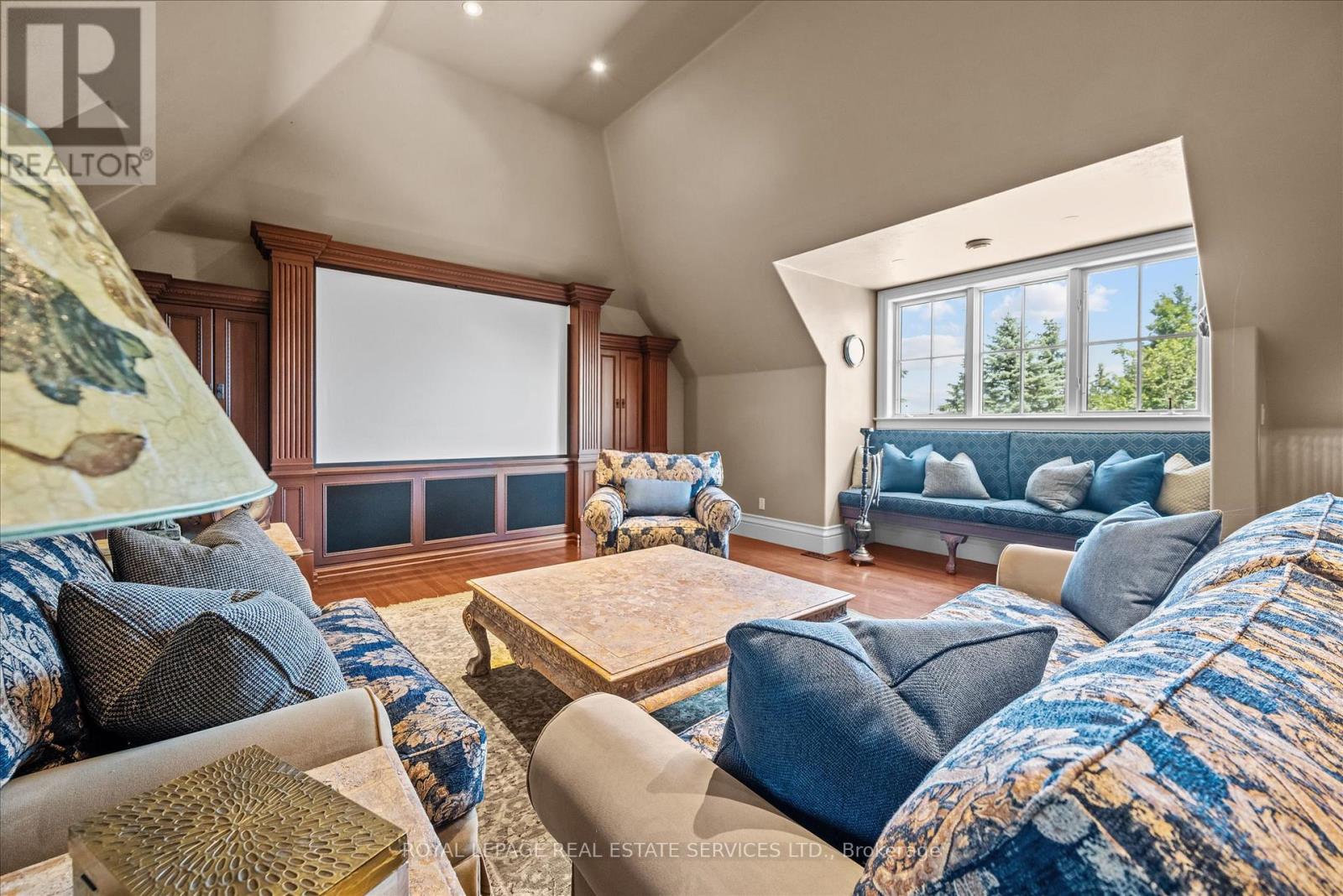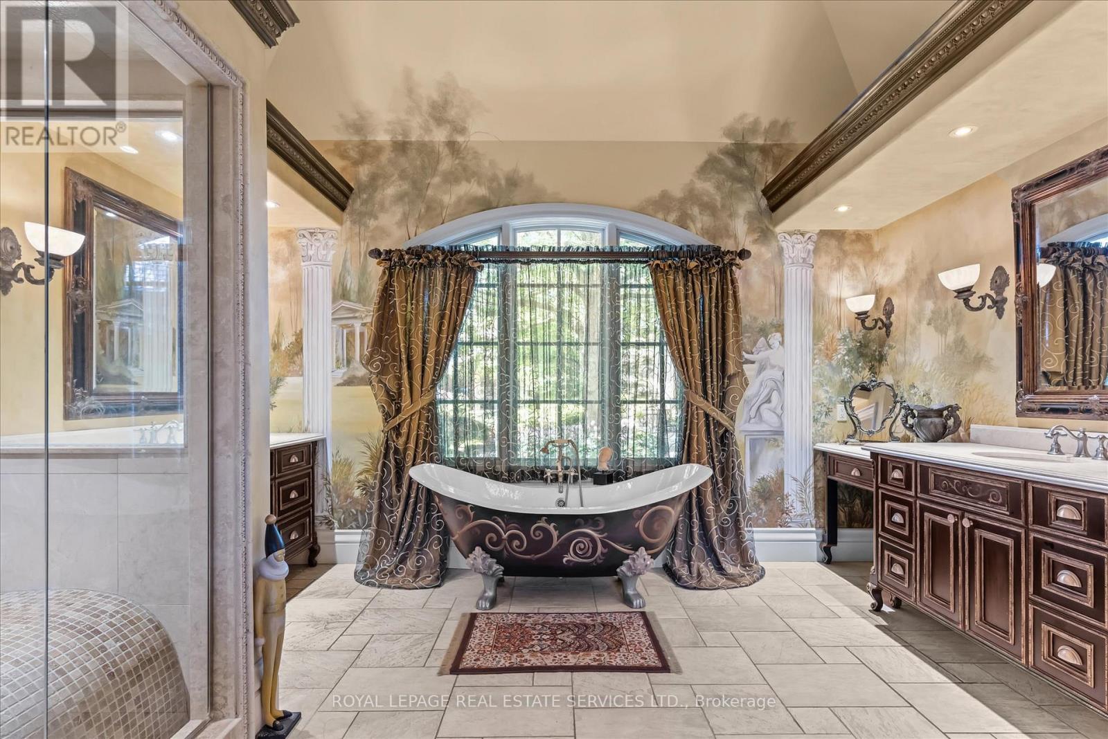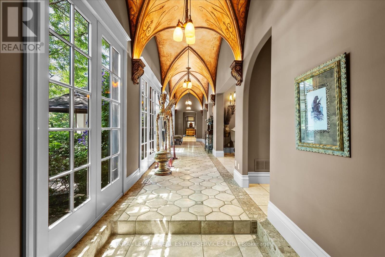 STONEGATE MANOR - AN ARCHITECTURAL MASTERPIECE! Nestled on 2.5 acres of manicured grounds behind private gates in prestigious Whispering Pines Estates, Stonegate Manor is a palatial estate crafted by an award-winning builder. A picturesque pond with fountain greets you at the foot of the driveway, setting the tone for timeless French Manor-inspired elegance. A grand foyer with 17.5-foot cathedral ceiling and hand-painted mural opens to a living room with 18-foot vaulted ceiling, two-storey cherrywood gas fireplace and expansive windows flooding the space with natural light. The chefs kitchen features a 48" Wolf gas range, Sub-Zero fridge, Miele dishwasher, servery, and three sets of French doors opening to a private courtyard. The formal dining room connects to a wine cellar with antique Asian doors, while a private office with 15-foot vaulted ceiling, gas fireplace and built-ins offers a refined workspace. The luxurious primary suite boasts a 14-foot vaulted ceiling, courtyard walkout, gas fireplace, walk-in closet, gym, and spa-inspired 7-piece ensuite with clawfoot tub and steam shower with built-in chaise. A lofted entertainment area features a 14-foot vaulted ceiling, wet bar, pool table, theatre setup, and powder room. The finished lower level includes heated floors, full kitchen, 3 bedrooms, 2 baths, and walkout to a private patio - ideal for multi-generational living. Resort-style amenities include an inground saltwater pool with integrated hot tub, standalone hot tub, koi pond, and an additional pond with fountain. The cabana features a wood-burning fireplace, kitchen, seating, automatic mosquito screens, 2-piece powder room, and change room. Additional highlights: elevator to all levels, Crestron Home Automation, oversized 3-car garage, and new concrete/asphalt driveway. A rare offering of elegance and lifestyle - just minutes north of Campbellville! (id:64974)