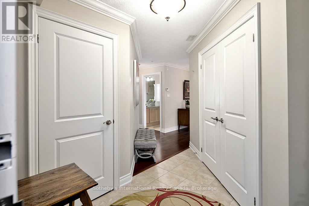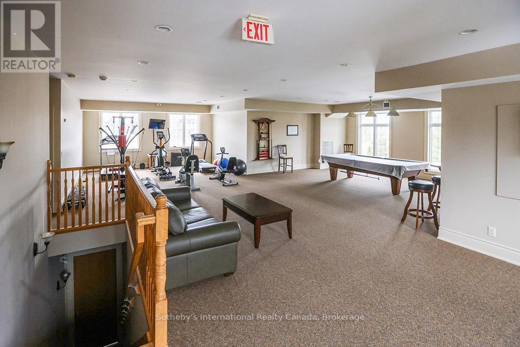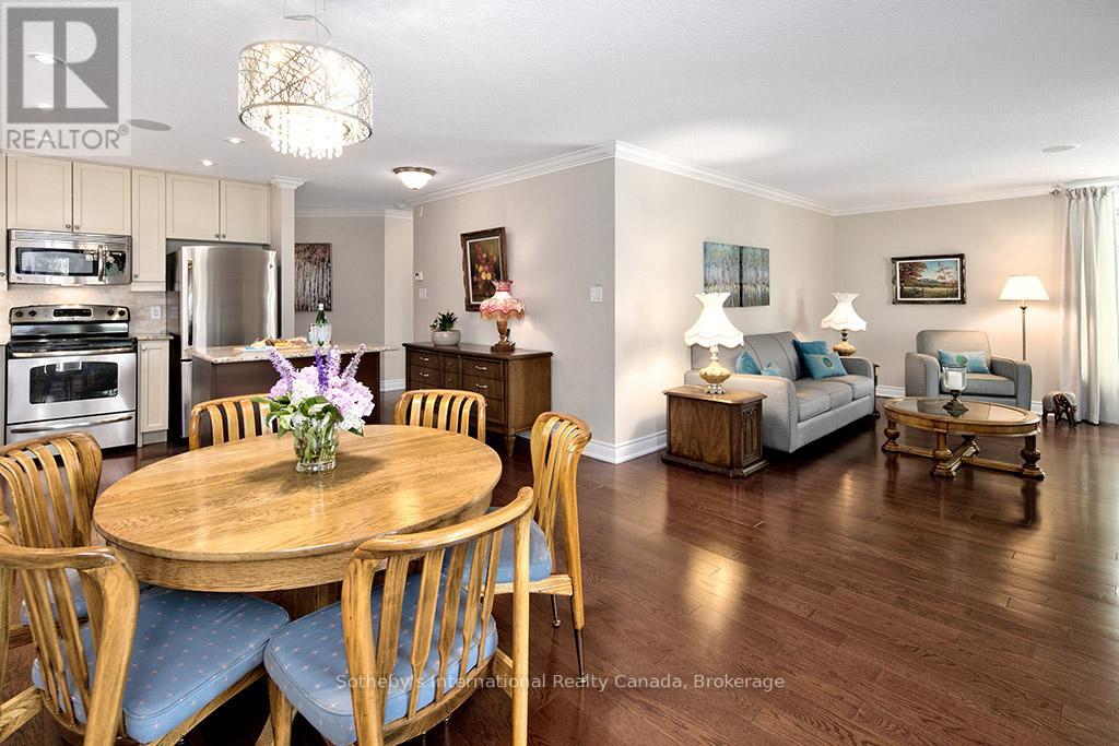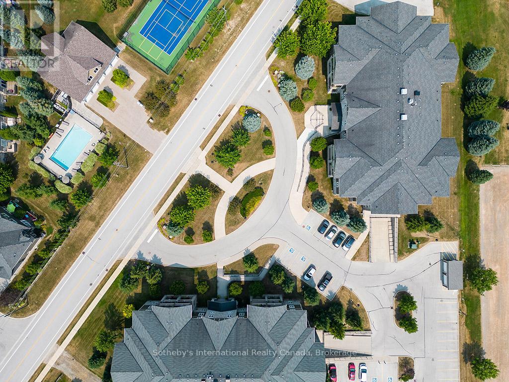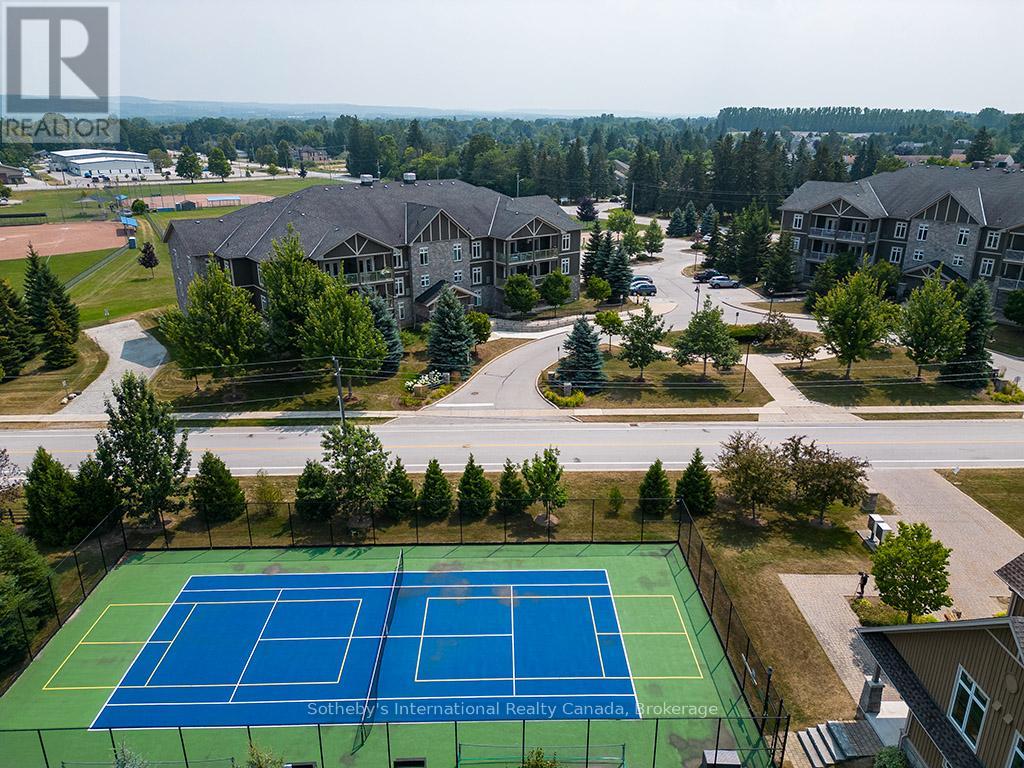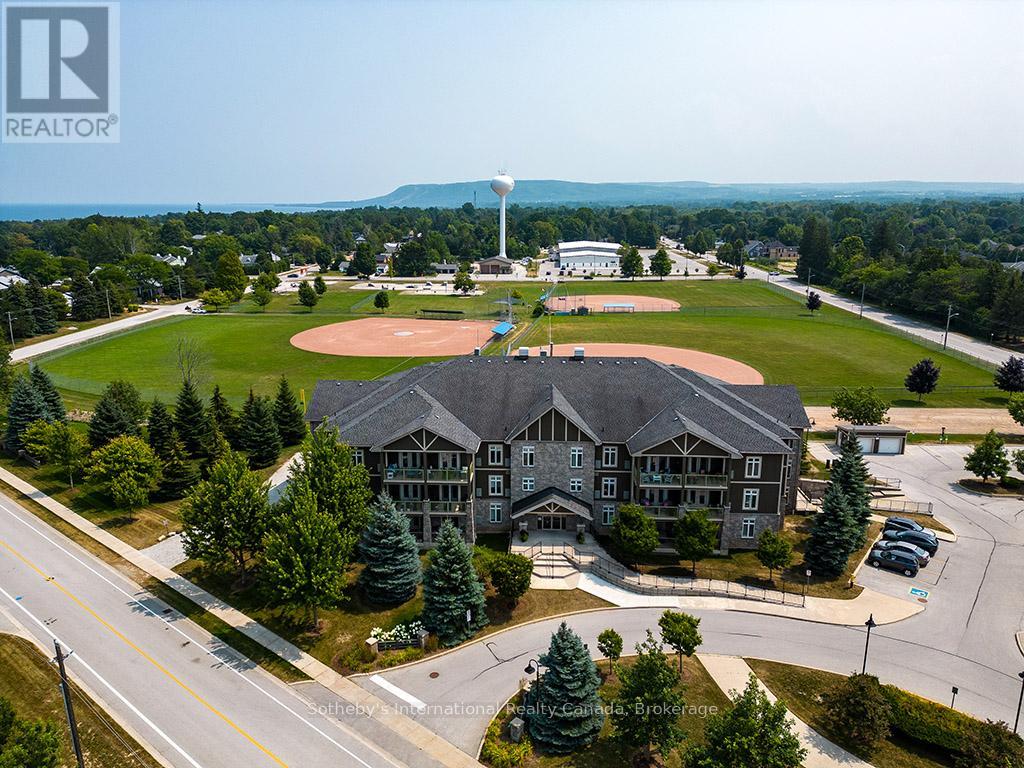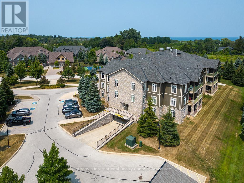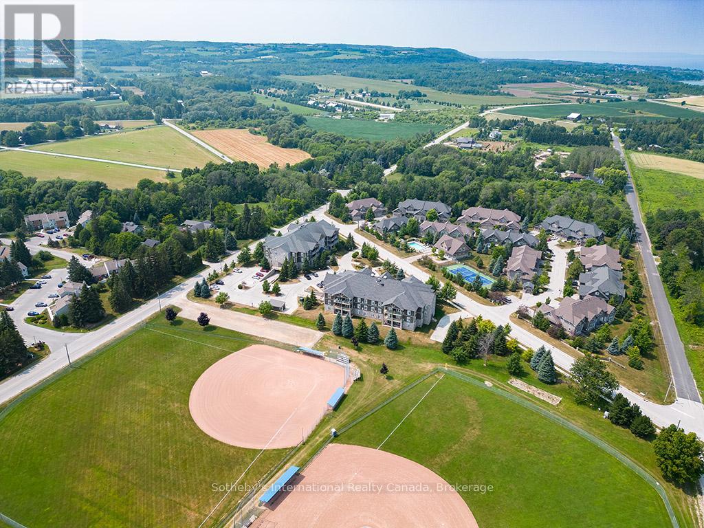 Prime location for this desirable unit set on the first floor in the very sought after Far Hills development. This very bright and spacious 2 bedroom, 2 bathroom suite with open concept living space features 1479 sqft. This beautiful suite has hardwood flooring, a gorgeous kitchen with granite counters, separate island and stainless steel appliances, a picturesque balcony, a large master bedroom with an ensuite with shower and separate tub and features a well sized additional guest room/office and full second bathroom. Amenities include designated underground parking, storage locker, inground pool, tennis courts, clubhouse and fully accessible with elevator and within walking distance to the exclusive boutiques and restaurants of downtown Thornbury, as well as the Georgian Trail and Thornbury harbour marina on stunning Georgian Bay. (id:64974)