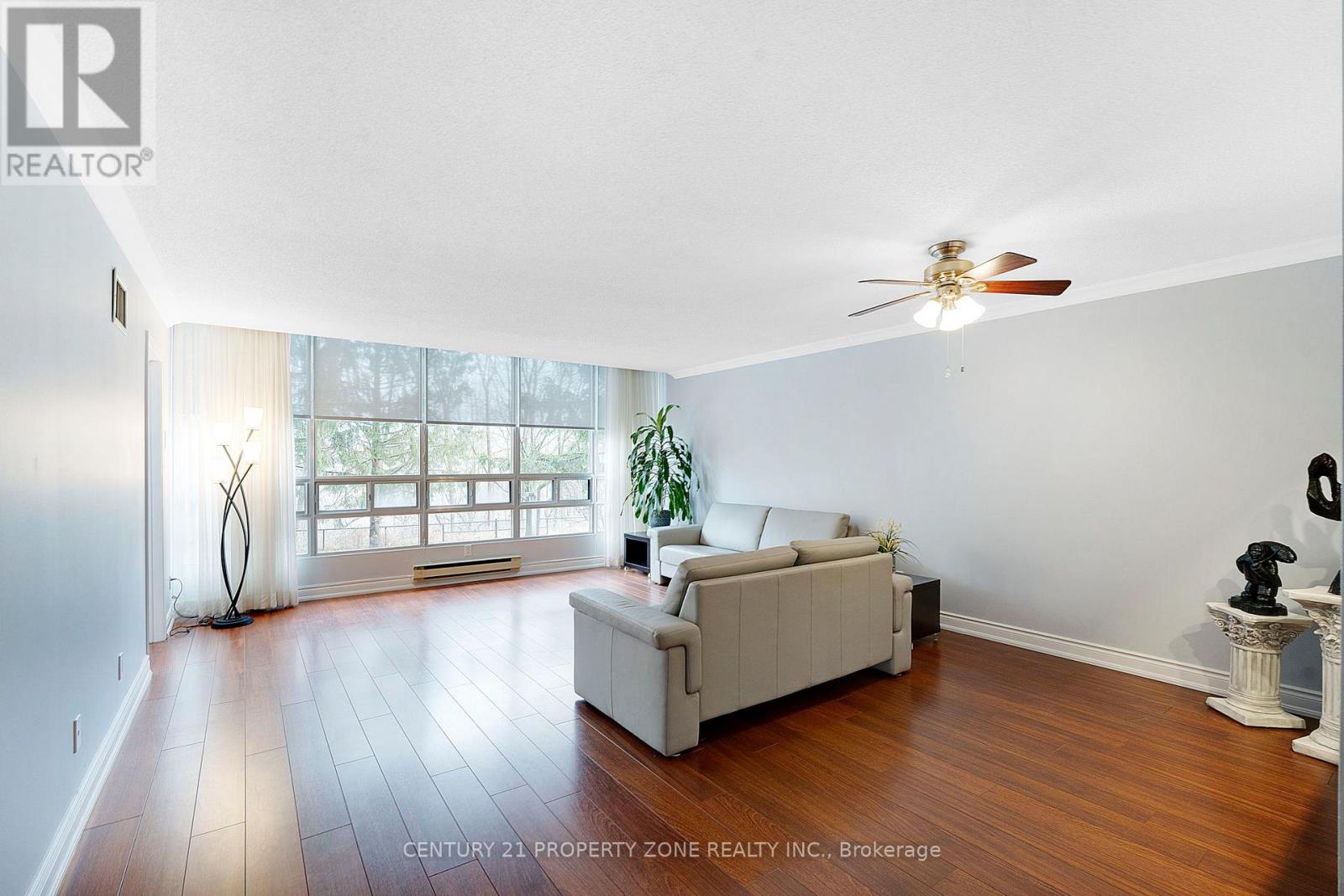 Welcome to over 1,400 sq. ft. of exceptionally designed living space, beautifully remodeled from top to bottom. This one-of-a-kind suite features raised ceilings, premium finishes, and an abundance of natural light throughout. Located in the award-winning 330 Mill St S-considered the premier building among the three on site-this home offers unmatched quality and comfort. The modern, bright kitchen is equipped with updated cabinetry, sleek finishes, and ceramic flooring, while engineered hardwood floors grace the living and dining areas. Floor-to-ceiling windows showcase tranquil ravine and stream views, complemented by automatic blinds in the living room. The entertainment-sized living and dining area is perfect for gatherings, and the spacious primary bedroom features a modern 3-piece ensuite with a glass shower and two extra closets. An extra-large second bedroom with generous closets, full-size in-suite laundry, crown moldings in the living room, and exceptional storage throughout the suite add to the home's appeal. Spotlessly maintained and fully upgraded, this move-in-ready home is ideal for a small family, downsizers, or those looking to retire in comfort without the worry of snow removal or lawn maintenance. Maintenance fees include all utilities, offering convenient, stress-free living, all within a highly sought-after, well-managed Brampton West building known for its excellent amenities and peaceful surroundings. (id:64974)