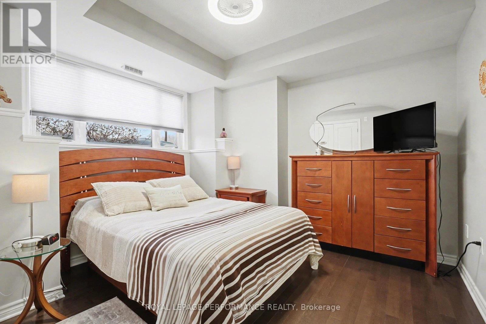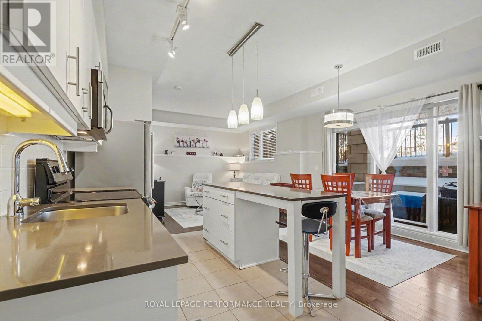 Perfectly Located Condo! Just steps away from the O-Train Cyrville Station, this exceptional unit features 2 bedrooms and 2 bathrooms, and is ready for you to move in. The bright, open-concept layout is accentuated by high ceilings, creating a spacious atmosphere. The kitchen is a highlight, showcasing quartz countertops, a breakfast bar, and stainless steel appliances. Elegant hardwood flooring flows seamlessly through the living and dining spaces, extending into both bedrooms. This condo offers the convenience of a 3-piece ensuite with an oversized shower and in-unit laundry. Step through the patio doors to discover a covered, ground-level private interlock terrace that overlooks a park, with no front neighbors. Furthermore, this home includes one parking space, one storage locker, and bike storage for added convenience. (id:64974)